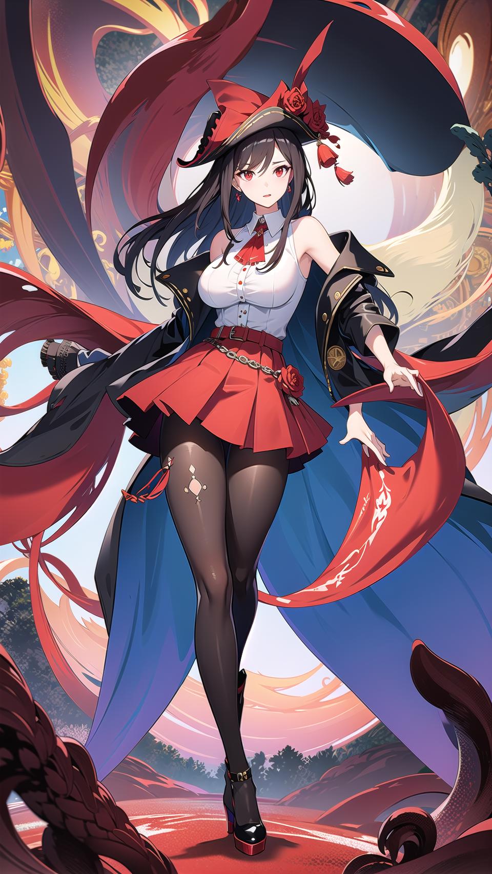masterpiece, best quality,royalfortune(azur lane), 1girl, red eyes, tentacles, torn clothes, pantyhose, breasts, black hair, red skirt, book, jacket, solo, skirt, black jacket, torn pantyhose, boots, sleeveless, white shirt, shirt, long hair, standing, looking at viewer, hat, open clothes, bare shoulders, black pantyhose, full body, black headwear, belt, open jacket, off shoulder, high heels, pirate hat, <lora:RoyalFortune-000007:0.8> <lora:GoodHands-vanilla:1>, scenery, background,
