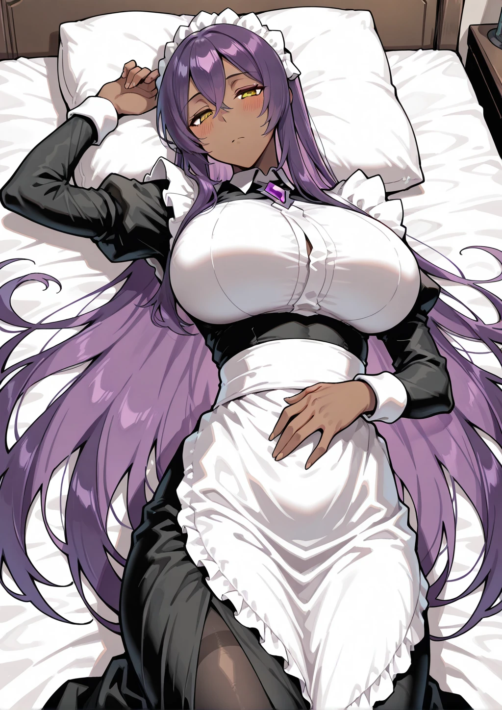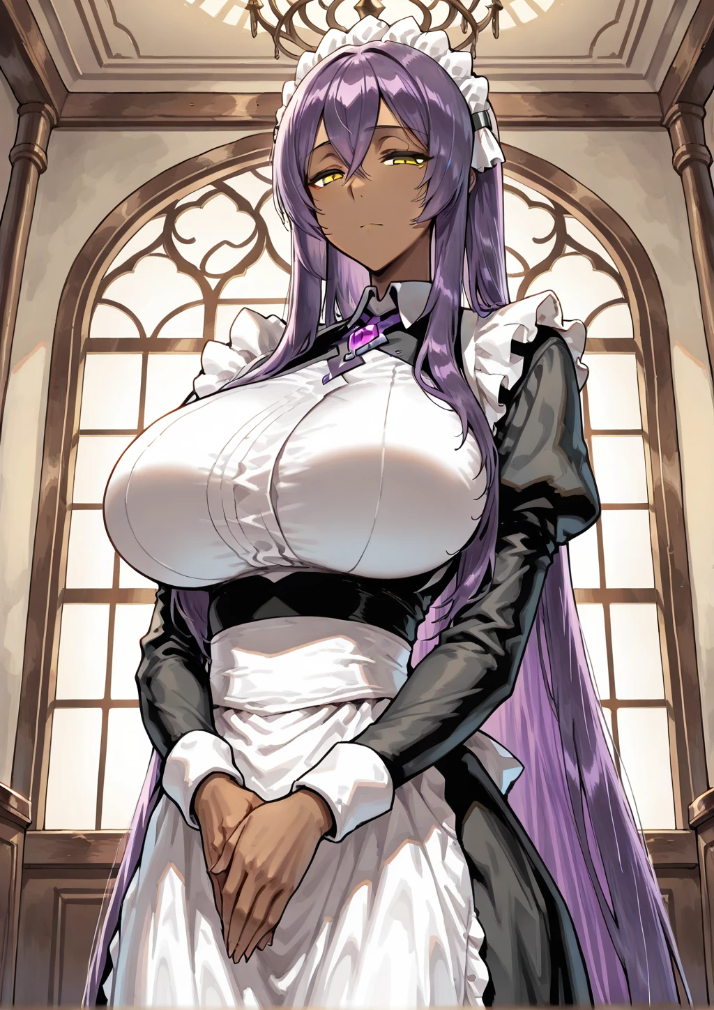 arus, dark-skinned female, very long hair, crossed bangs, long sidelocks, straight hair, purple hair, yellow eyes, tareme, narrowed eyes, maid apron, black long skirt, purple chest jewel, maid headdress, black pantyhose, pumps