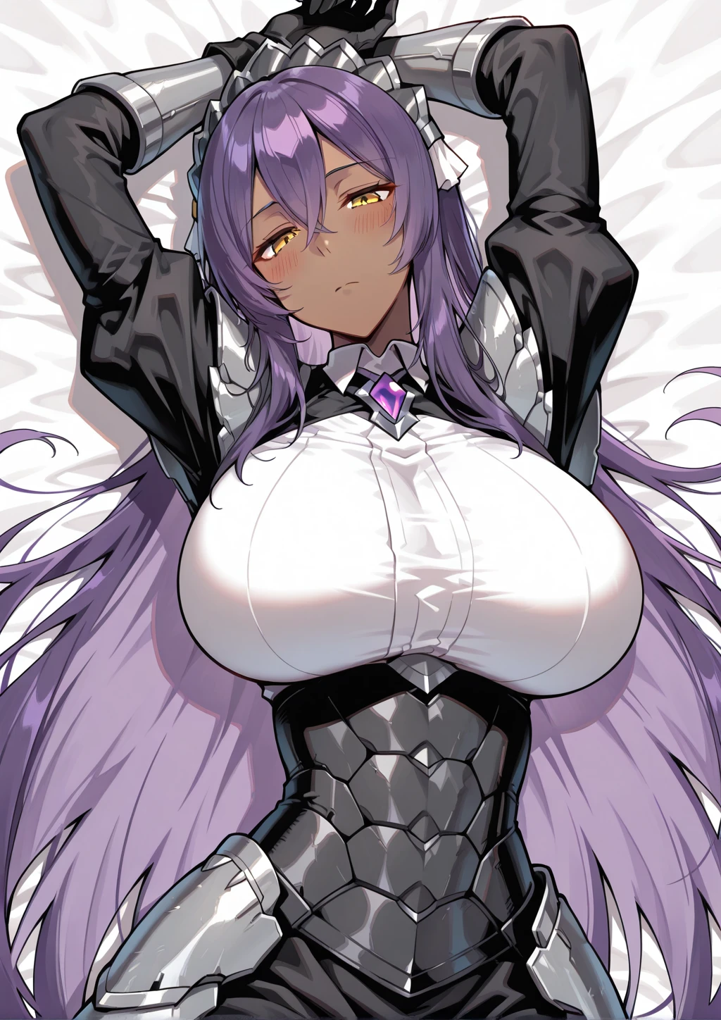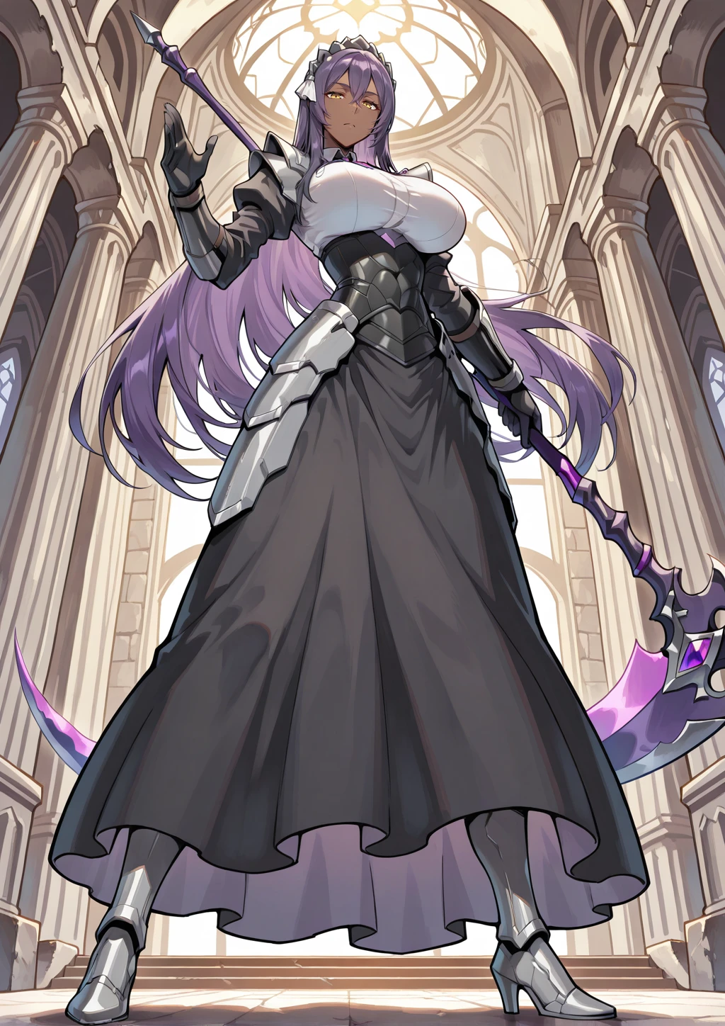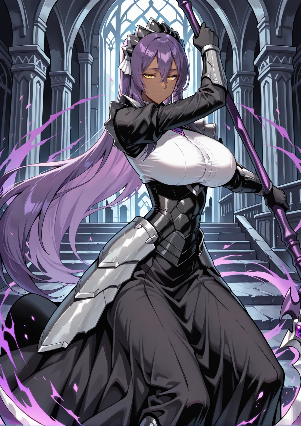 arus, dark-skinned female, very long hair, crossed bangs, long sidelocks, straight hair, purple hair, yellow eyes, tareme, narrowed eyes, black dress, black sleeves, white shirt, purple chest jewel, armored maid headdress, black long skirt, black armored corset, silver gauntlets, black gloves, silver shoulder armor, silver hip armor, silver armored boots