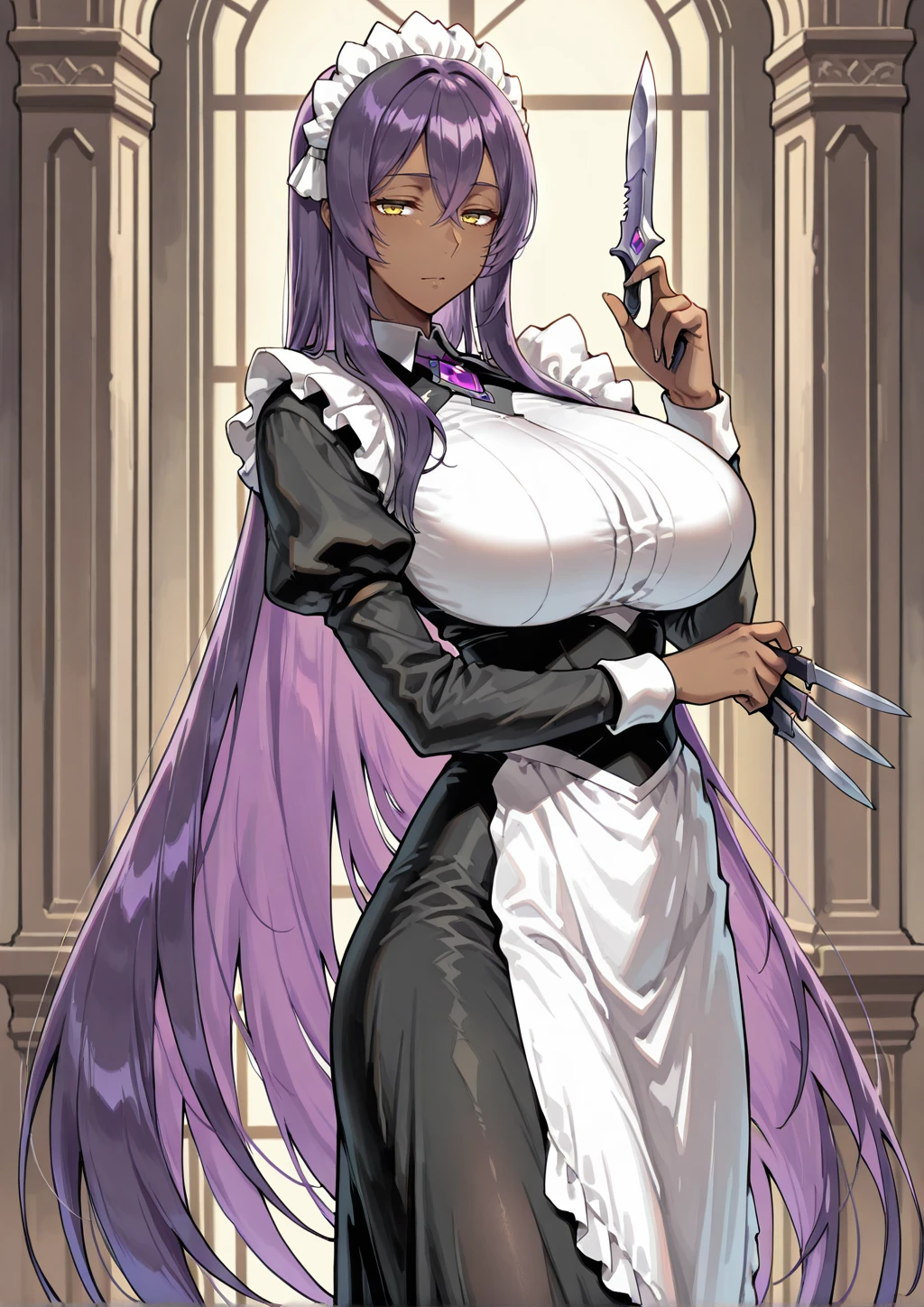 arus, dark-skinned female, very long hair, crossed bangs, long sidelocks, straight hair, purple hair, yellow eyes, tareme, narrowed eyes, maid apron, black long skirt, purple ????? jewel, maid headdress, black pantyhose, pumpsDescription