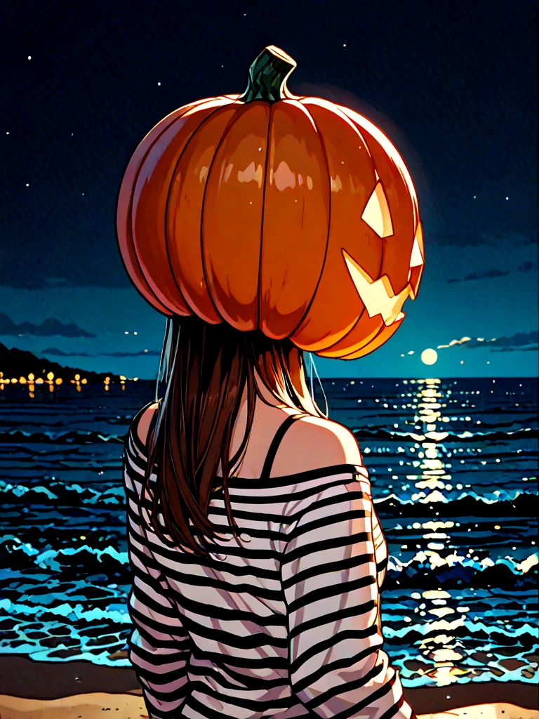 pumpkin head, pumpkin mask, covered face, faceless female, 1girl, long hair, large breasts, string bikini, halloween bucket, holding, lollipop, candy, outdoors,