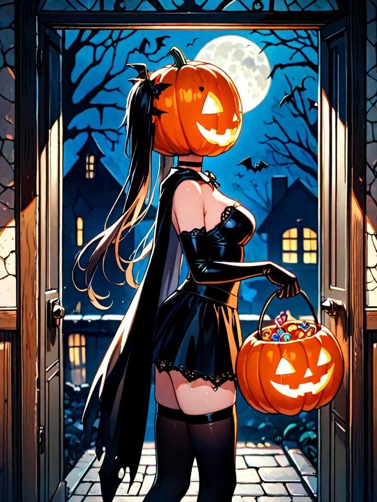 pumpkin head, pumpkin mask, covered face, faceless female, 1girl, long hair, cape, miniskirt, thighhighs, lace trim, halloween costume, halloween bucket, holding, lollipop, candy, outdoors,