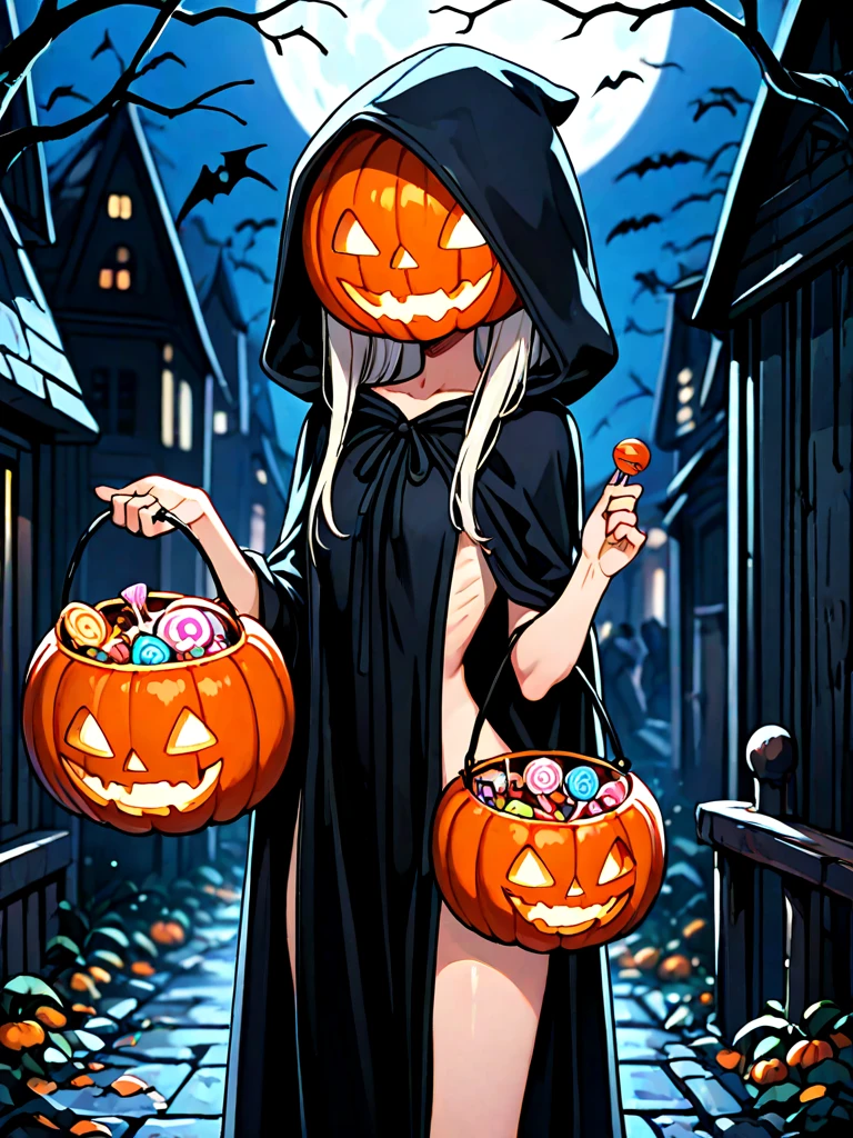 pumpkin head, pumpkin mask, covered face, faceless female, 1girl, long hair, curvy, skinny, hooded cloak, halloween bucket, holding, lollipop, candy, outdoors,