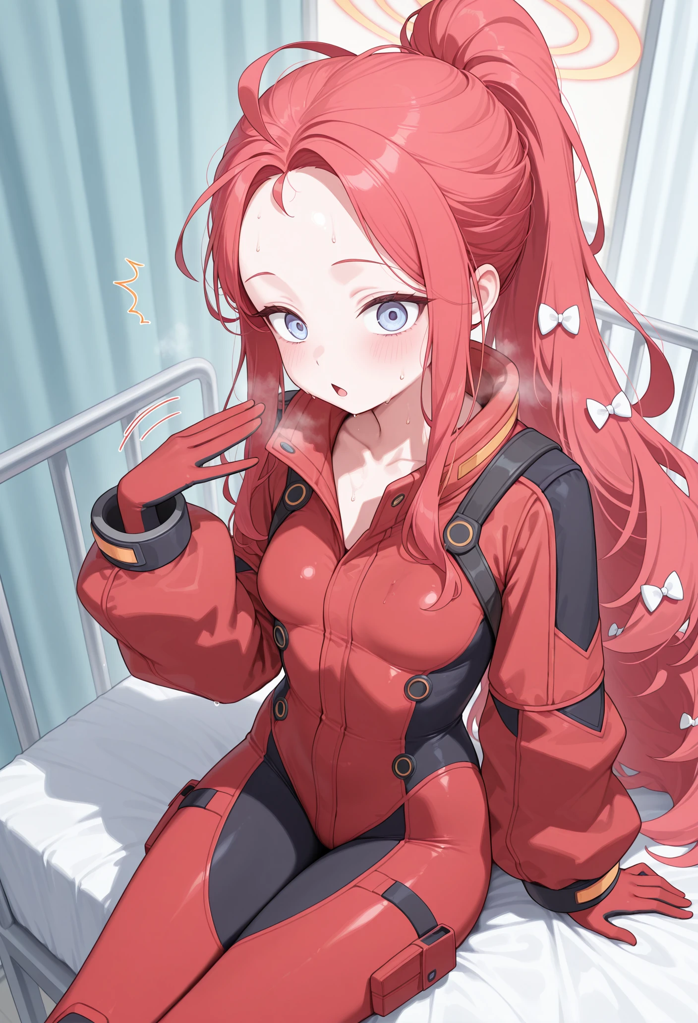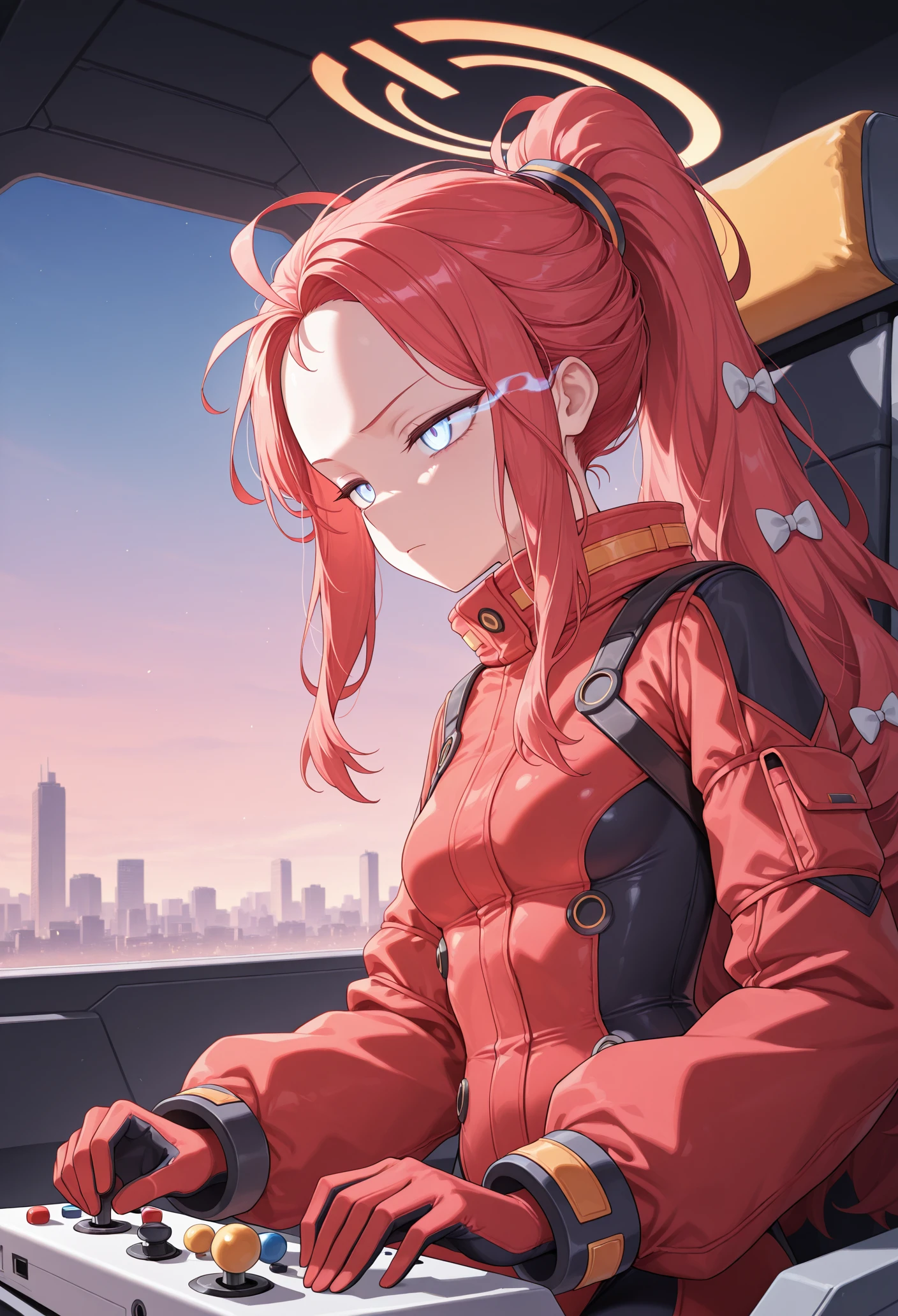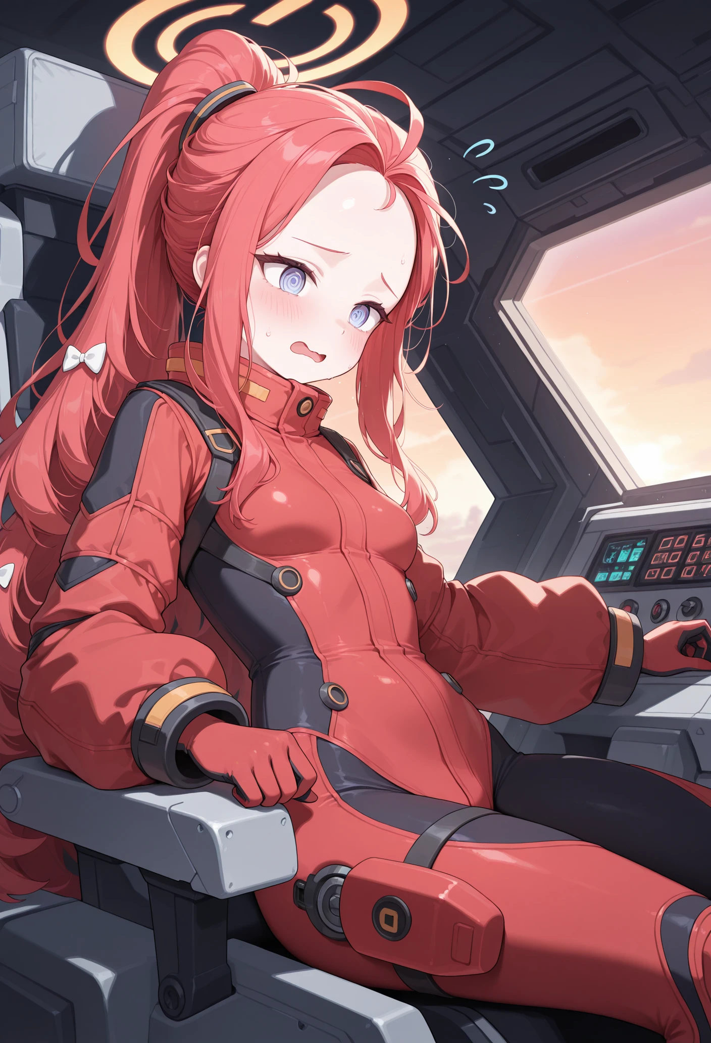 halo,blue eyes,red hair,long hair,forehead,ponytail,small breasts,