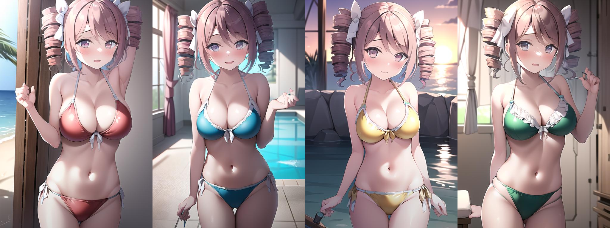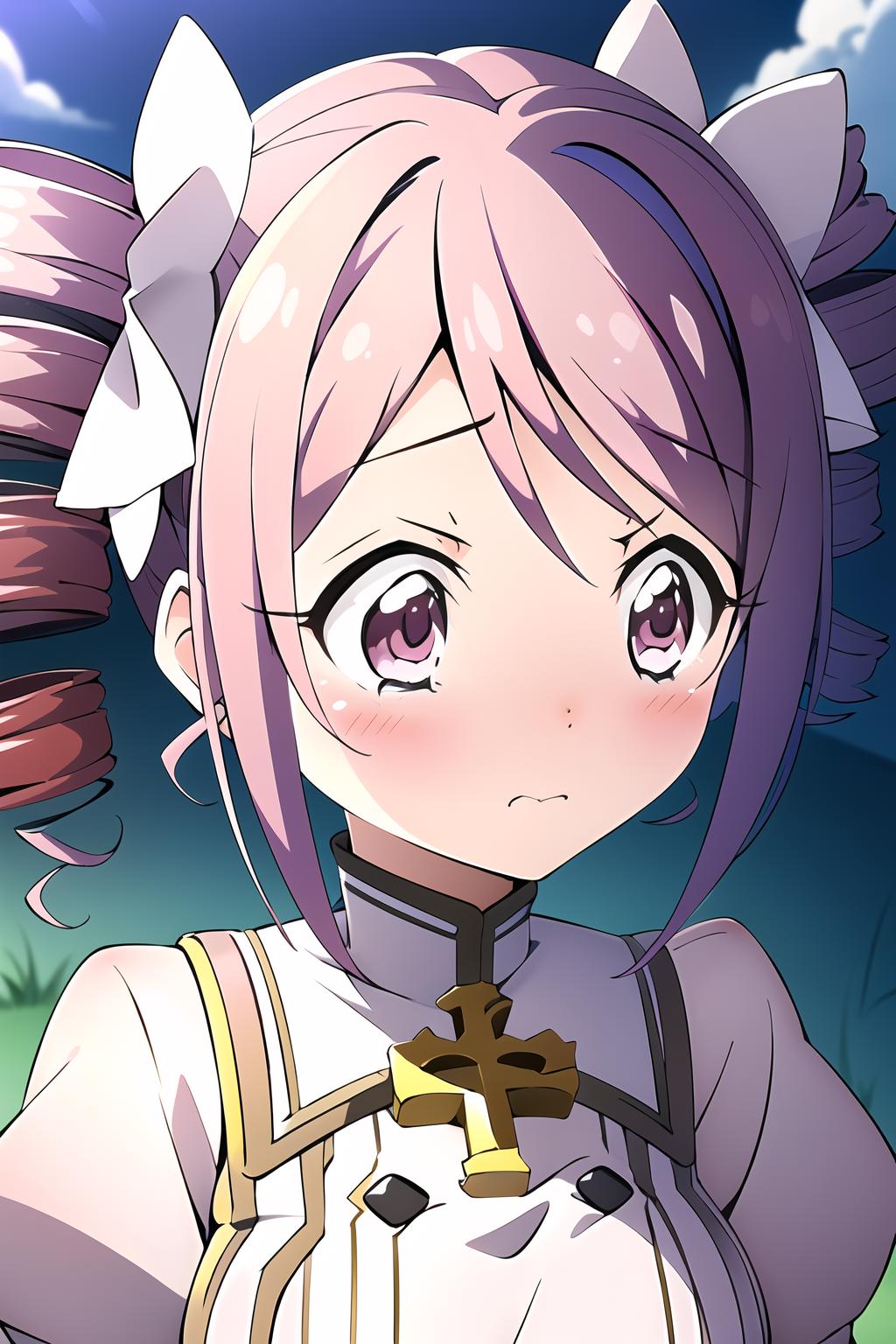 twin drills, pink hair, white dress
