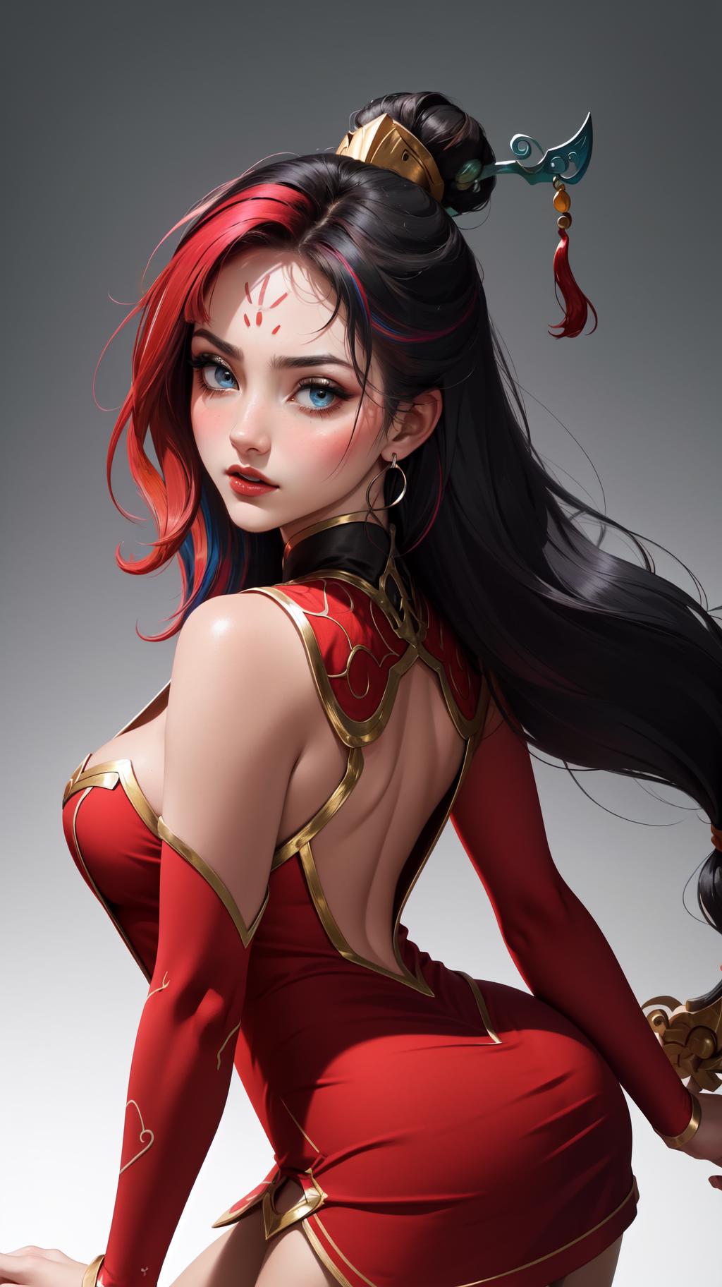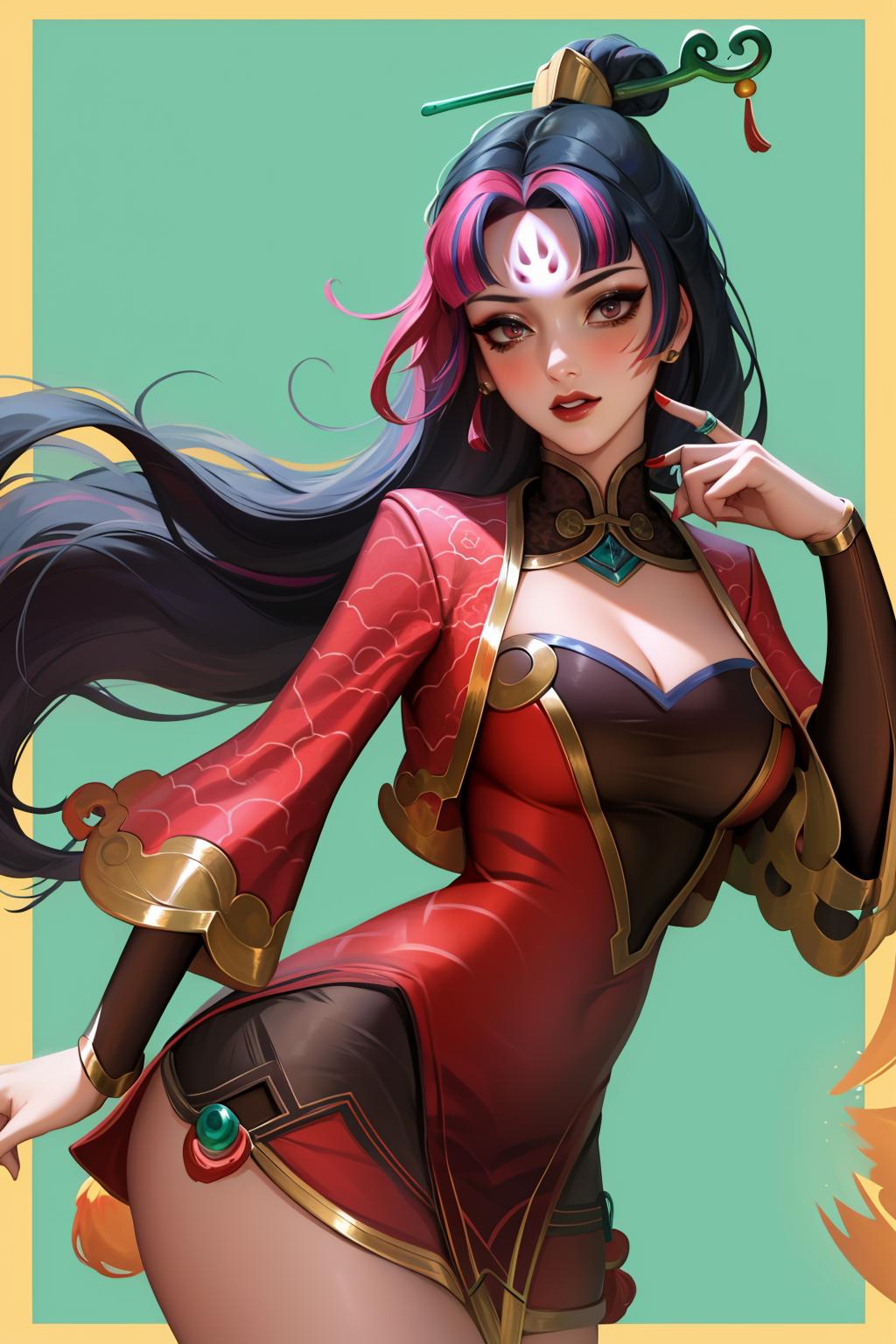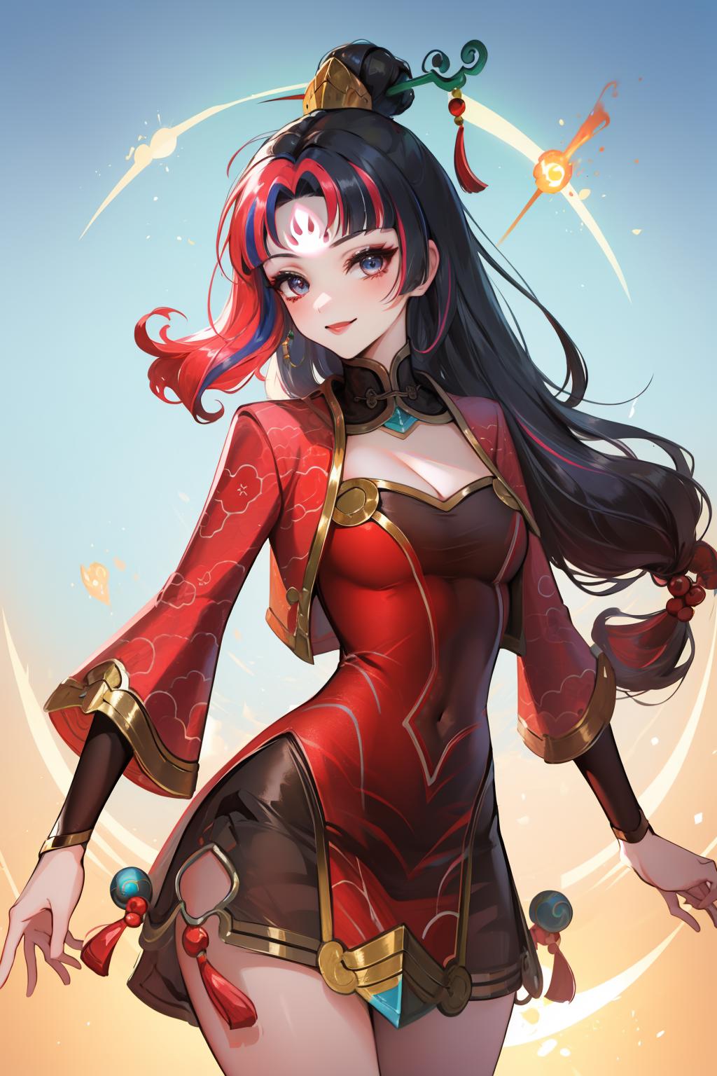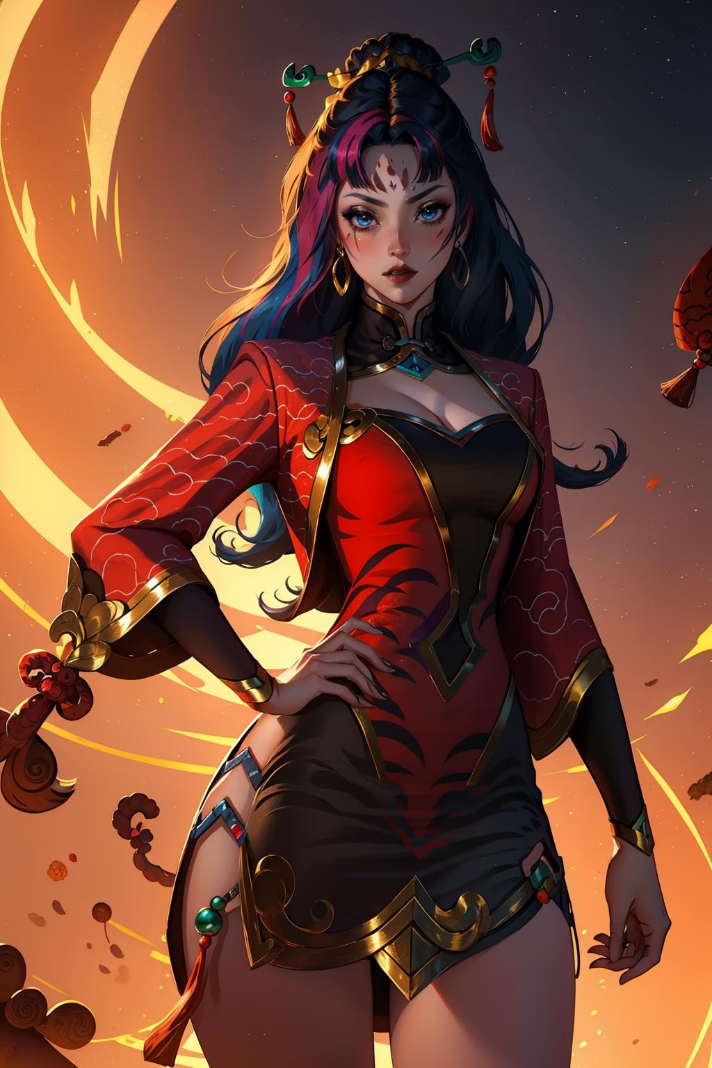 tags: firecracker diana, 1girl, dress, multicolored hair, hair ornament, cleavage, long hair