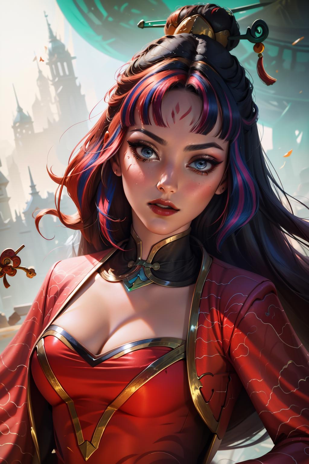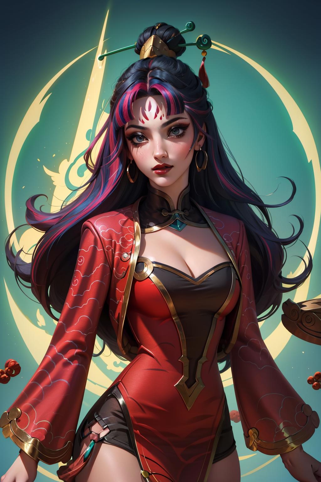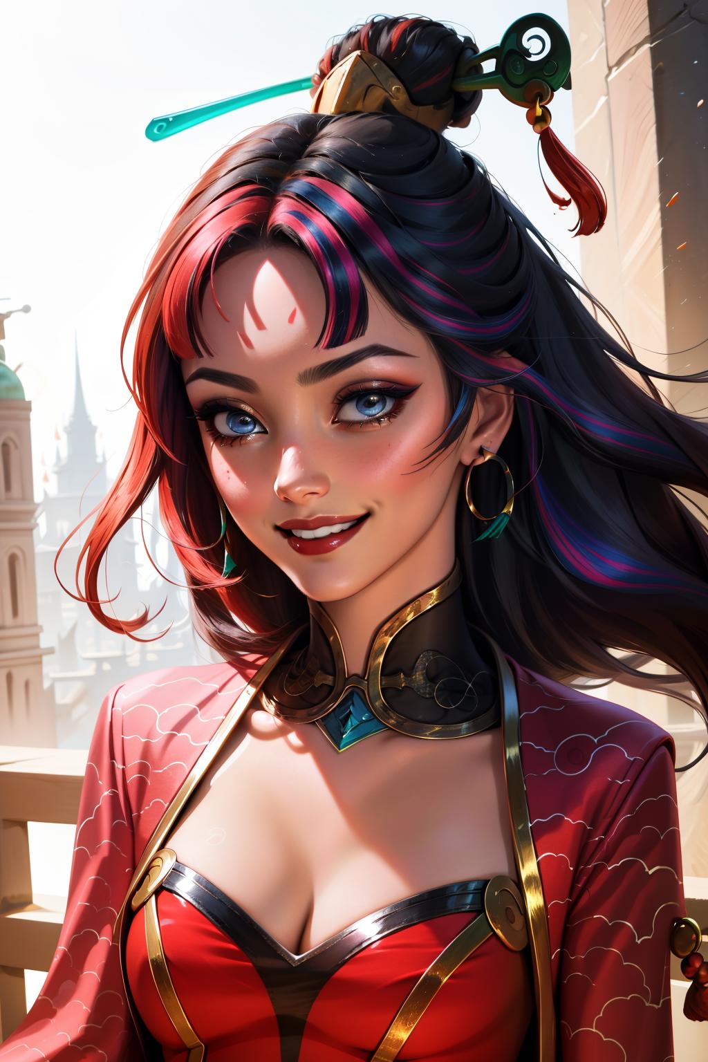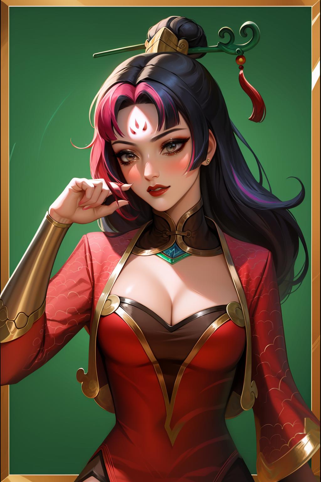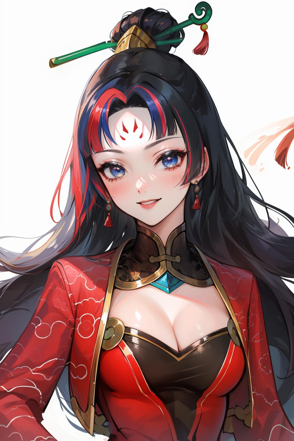 tags: firecracker diana, 1girl, dress, multicolored hair, hair ornament, cleavage, long hair