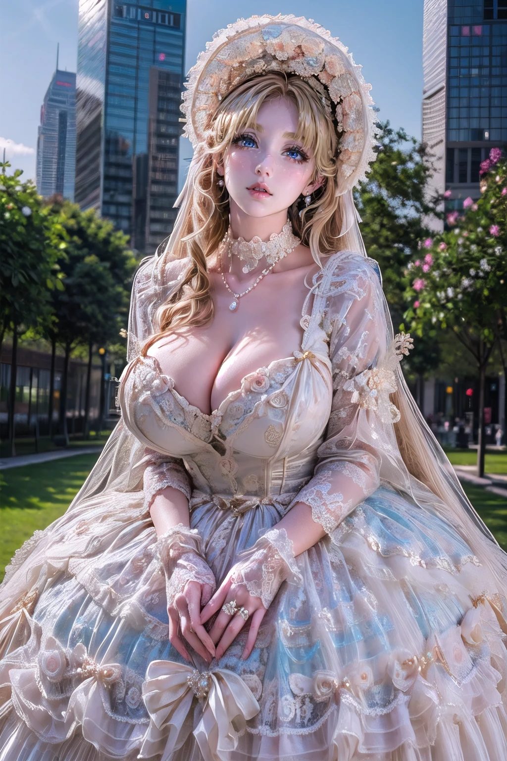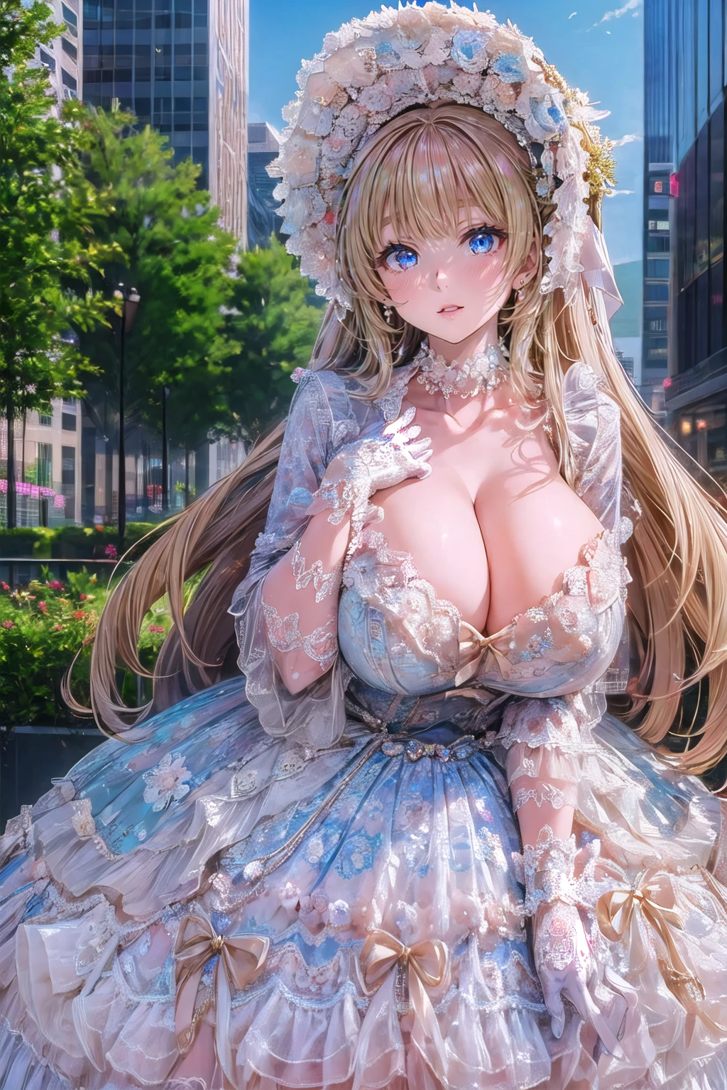 qwhx,white dress,bonnet,jewelry,white gloves,lace-trimmed dress,frilled dress,long sleeves,choker,dress flower,chin strap,white bow,pearl necklace,pearl hair ornament,