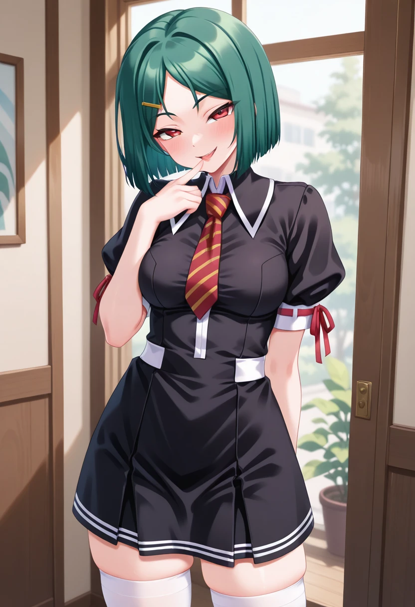 red striped necktie, black school dress, puffy short sleeves, zettai ryouiki, white thighhighs,
