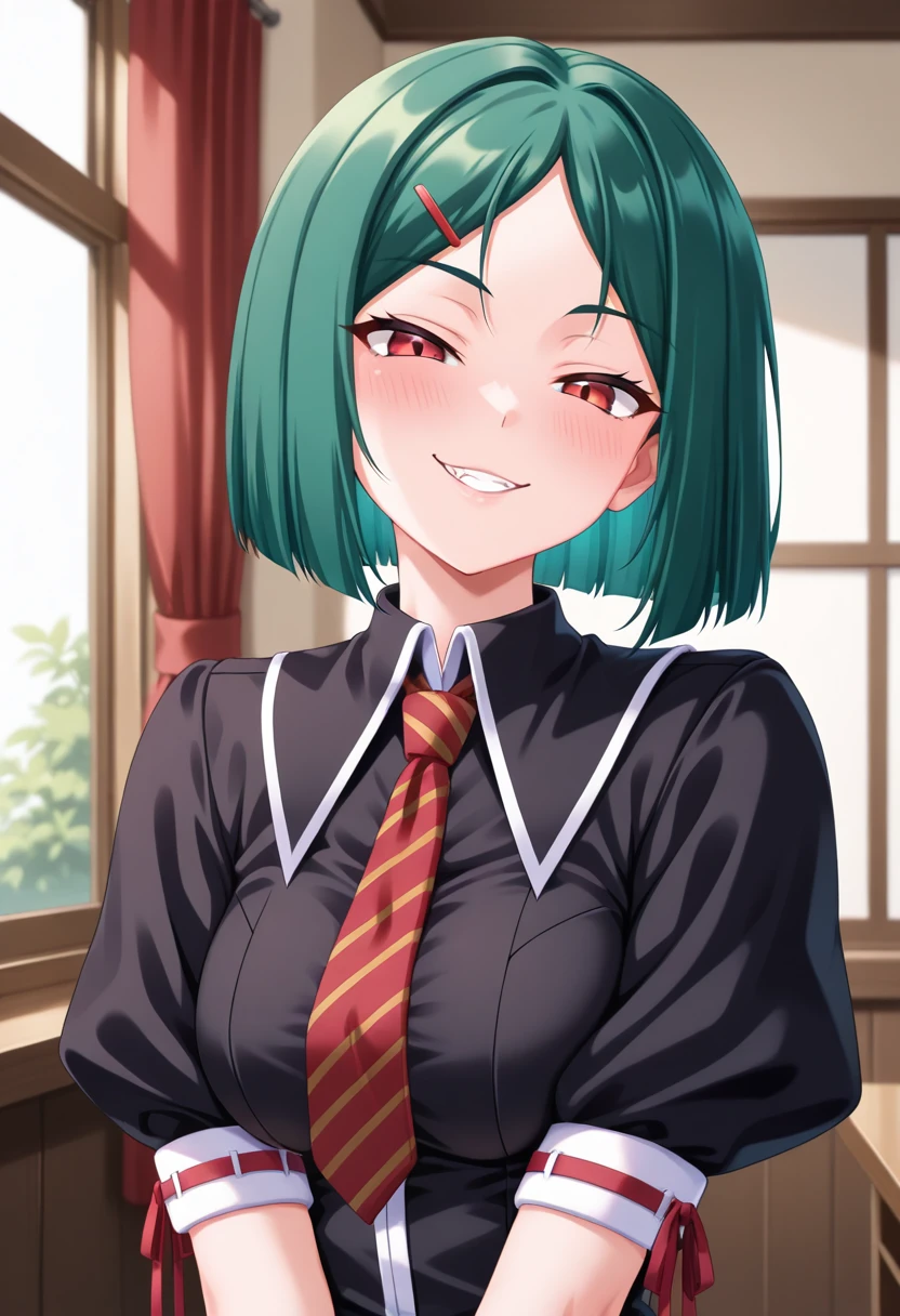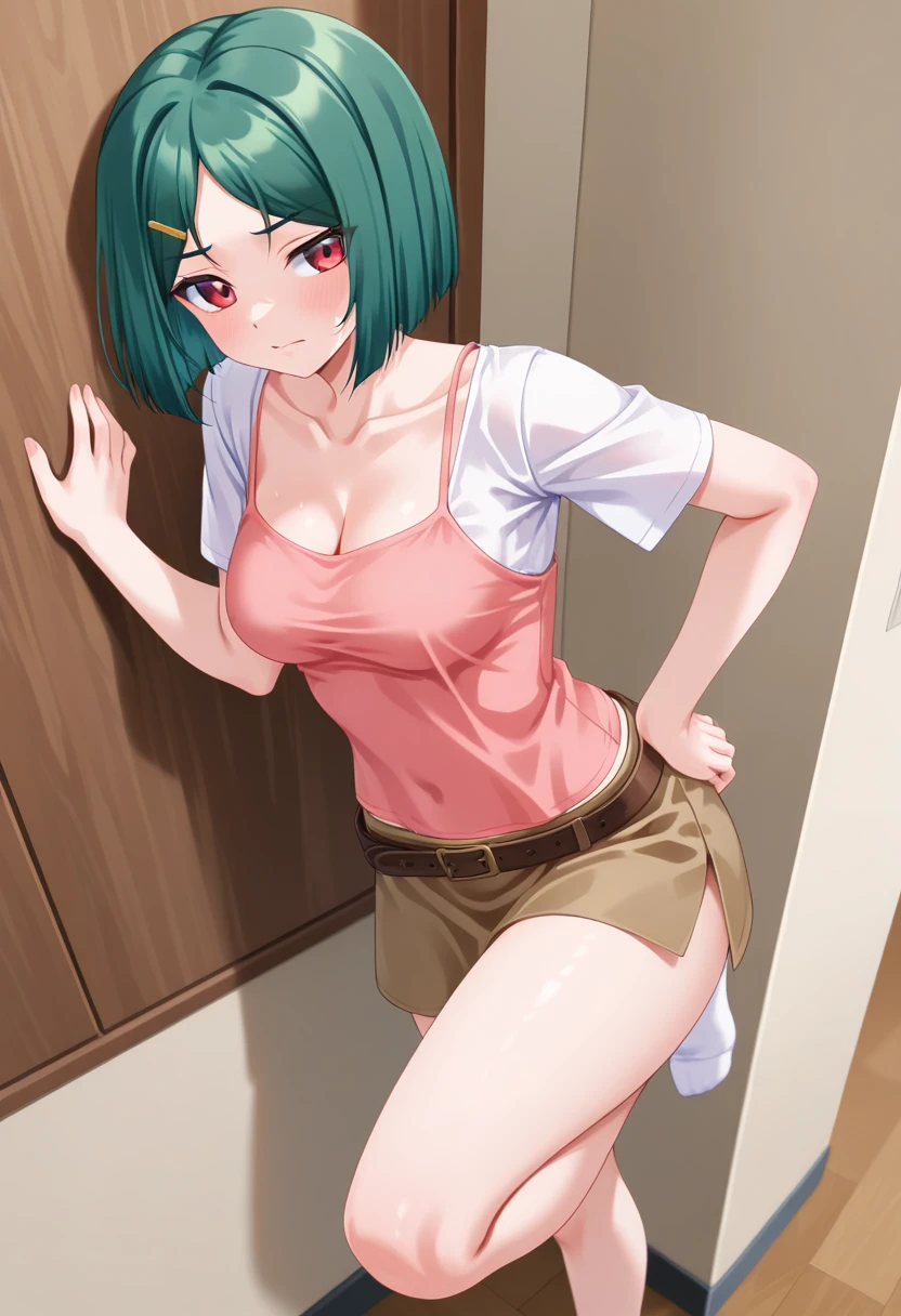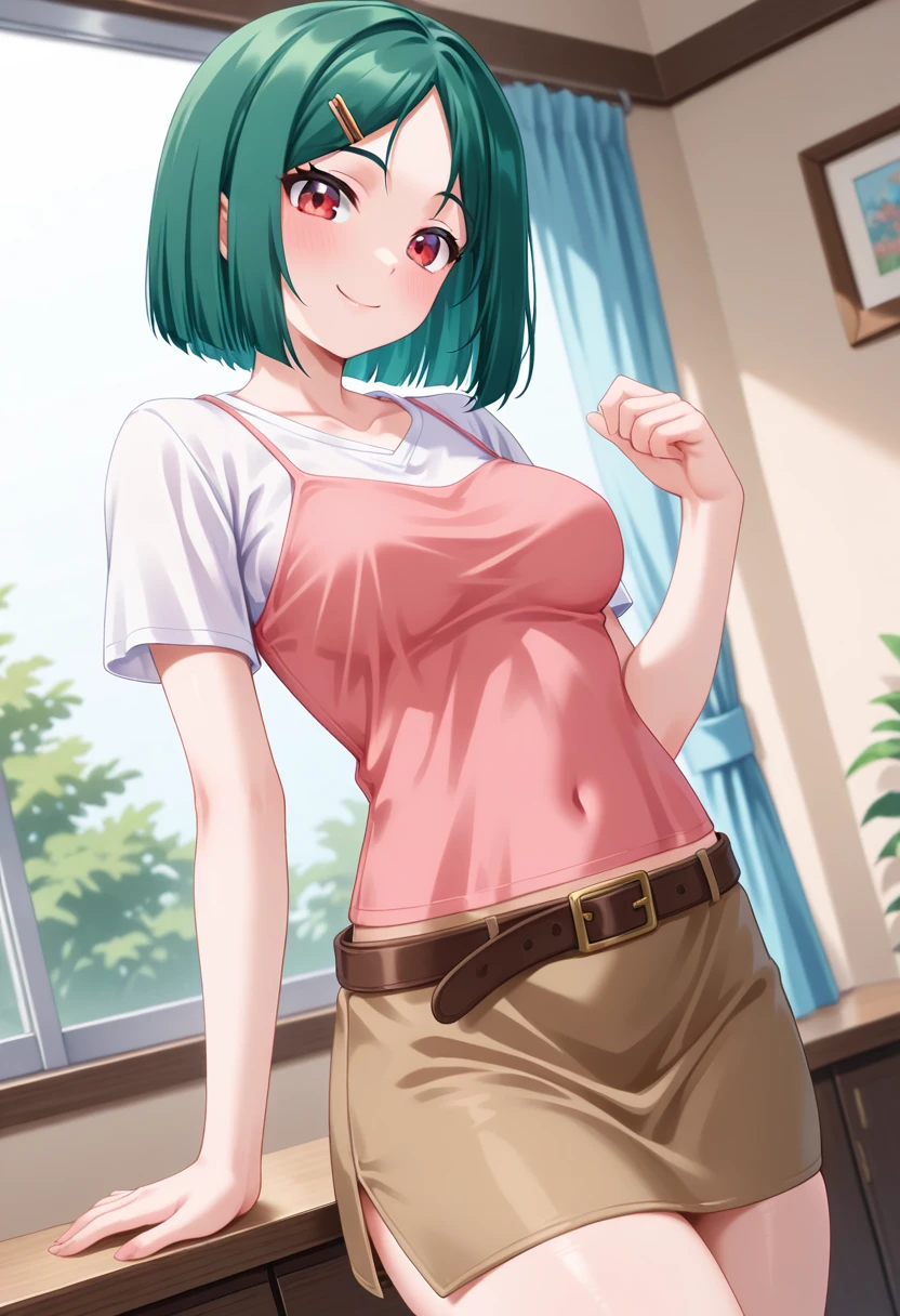 misaoww, red eyes, green hair, medium hair, bob cut, parted bangs, hairclip, medium breasts,