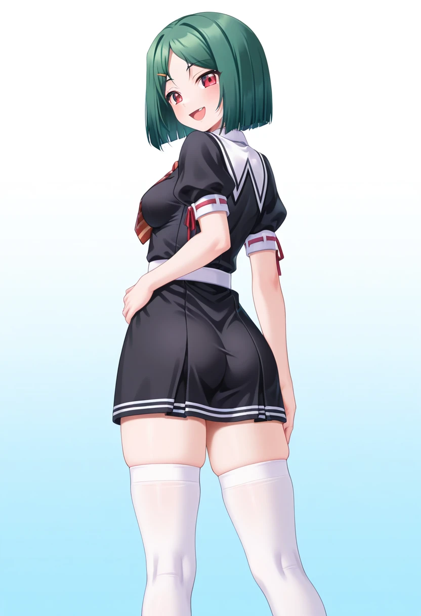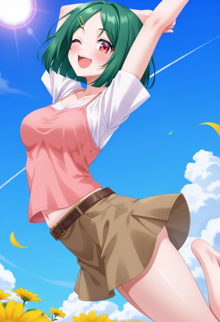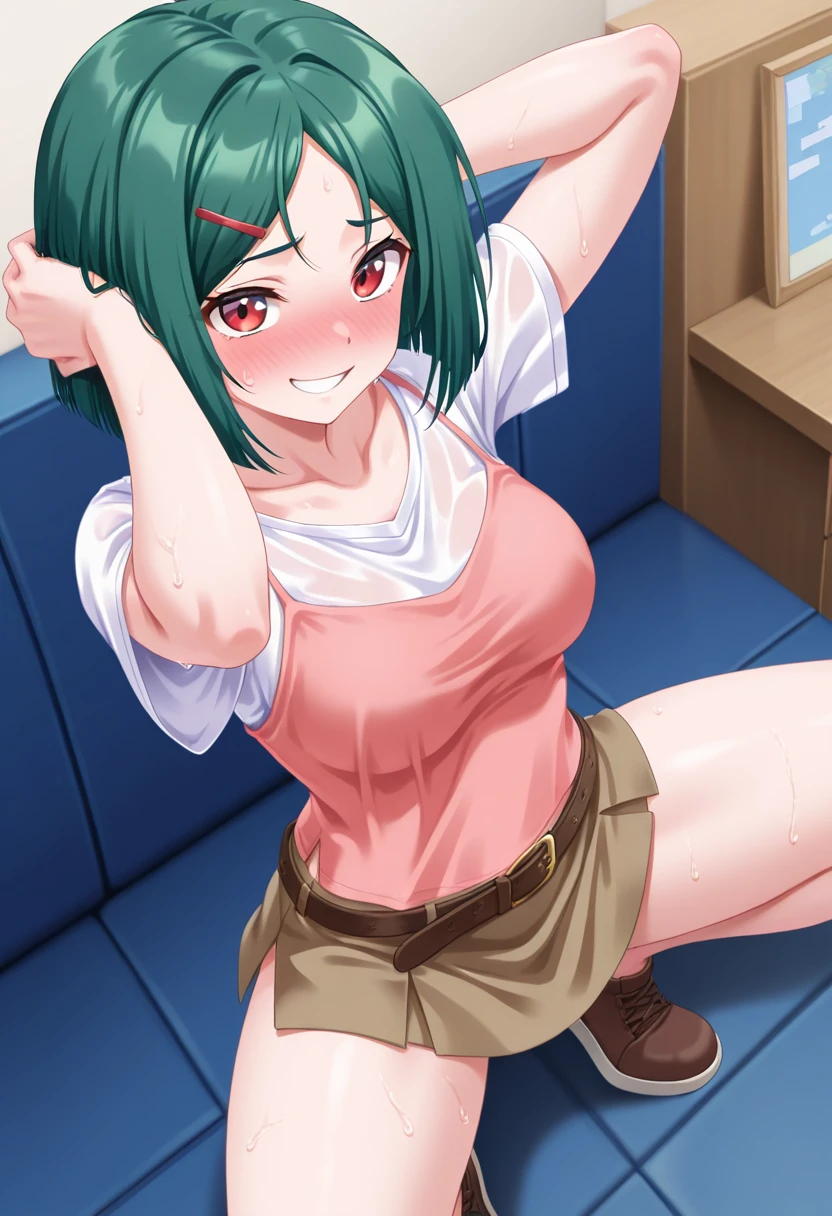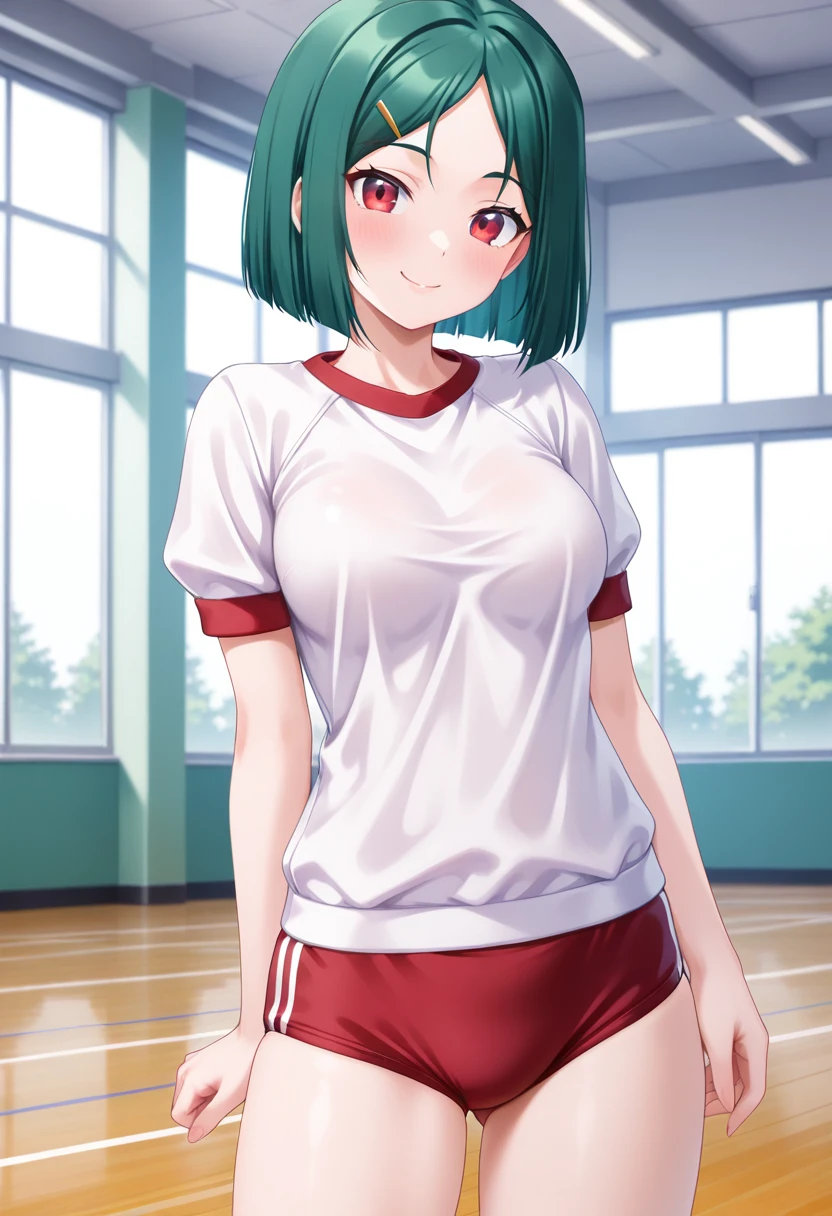 misaoww, red eyes, green hair, medium hair, bob cut, parted bangs, hairclip, medium breasts,