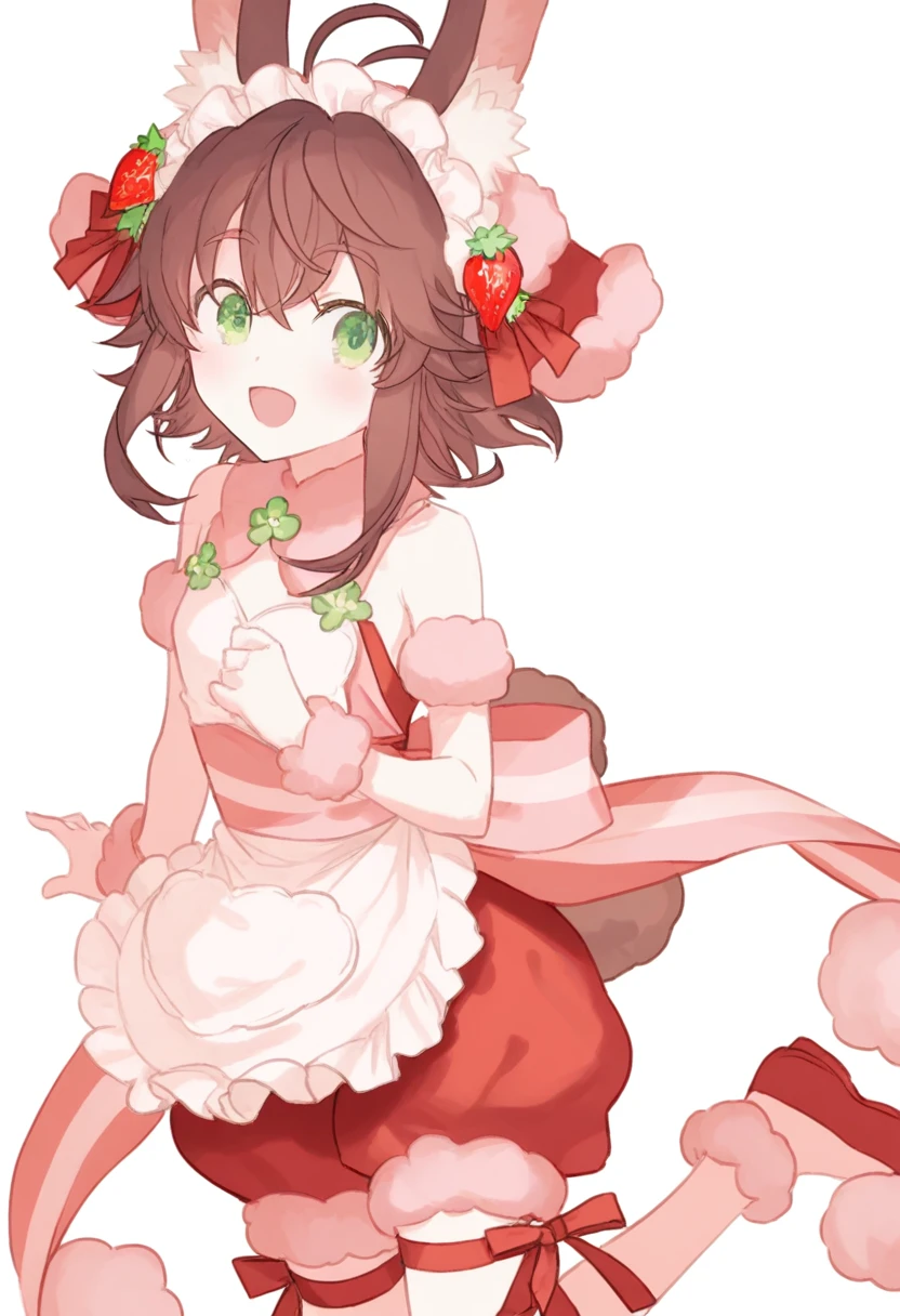 Use these tags to trigger:apron, ras\(maimai\), strawberry hair ornament, leg ribbon, puffy shorts, flower ornament, rabbit ears, animal ear fluff, green eyes, brown hair,