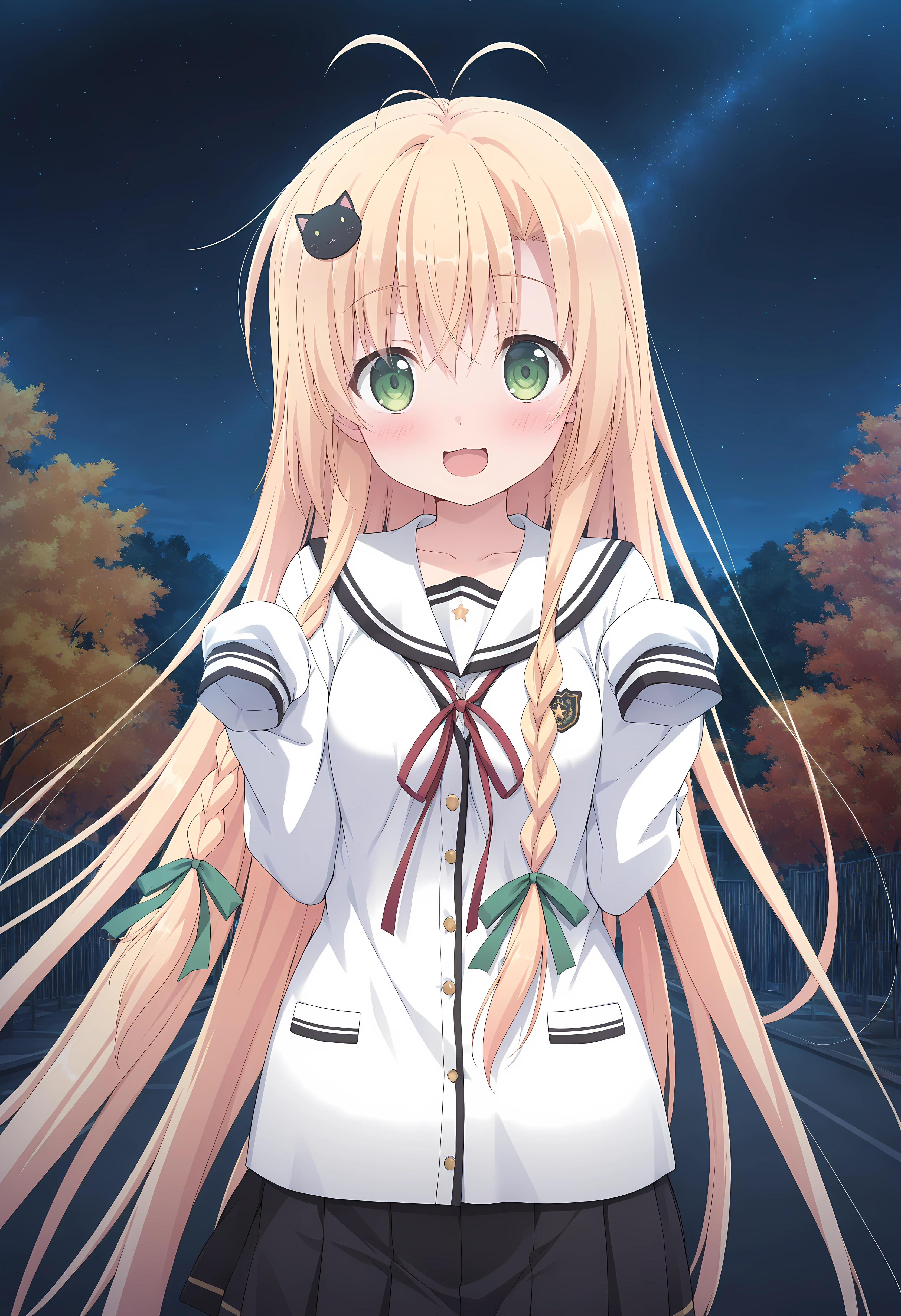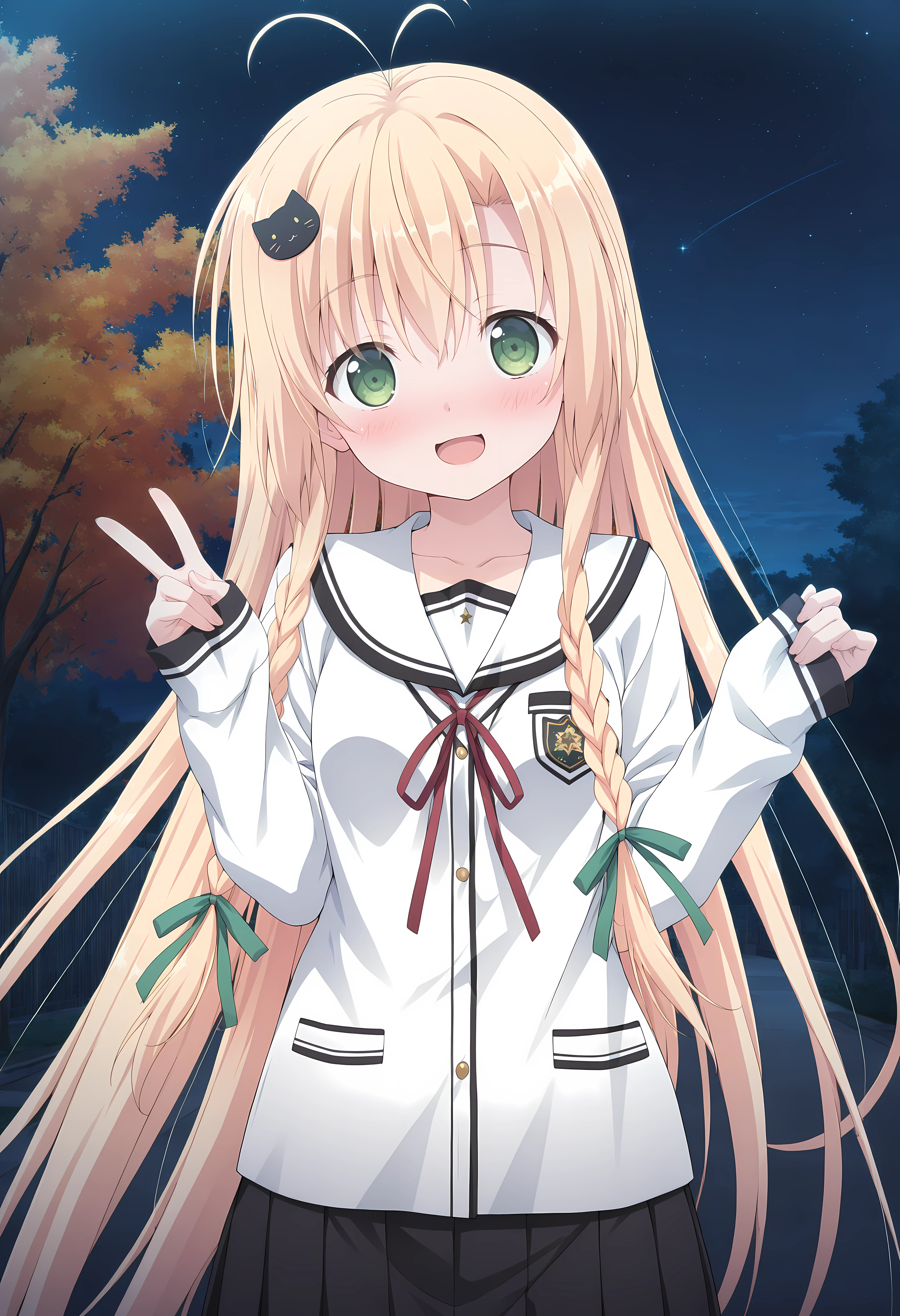 Base: Nanoka,blonde hair,very long hair,green eyes,small breasts,hair ribbon,green ribbon,antenna hair,cat hair ornament,twin braid,braid,
