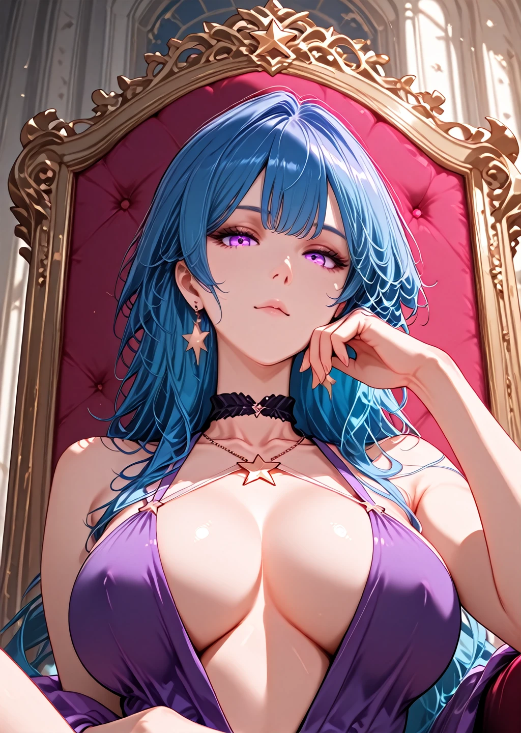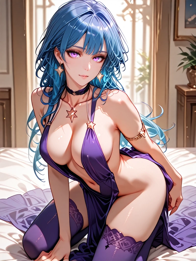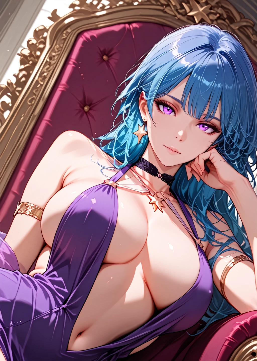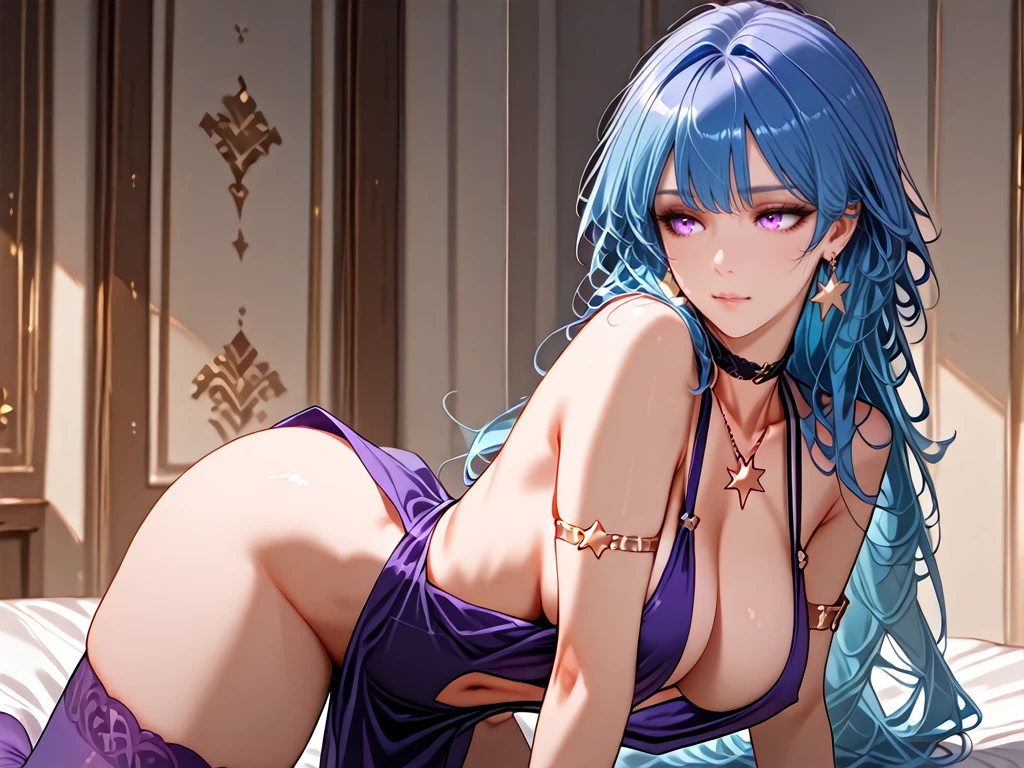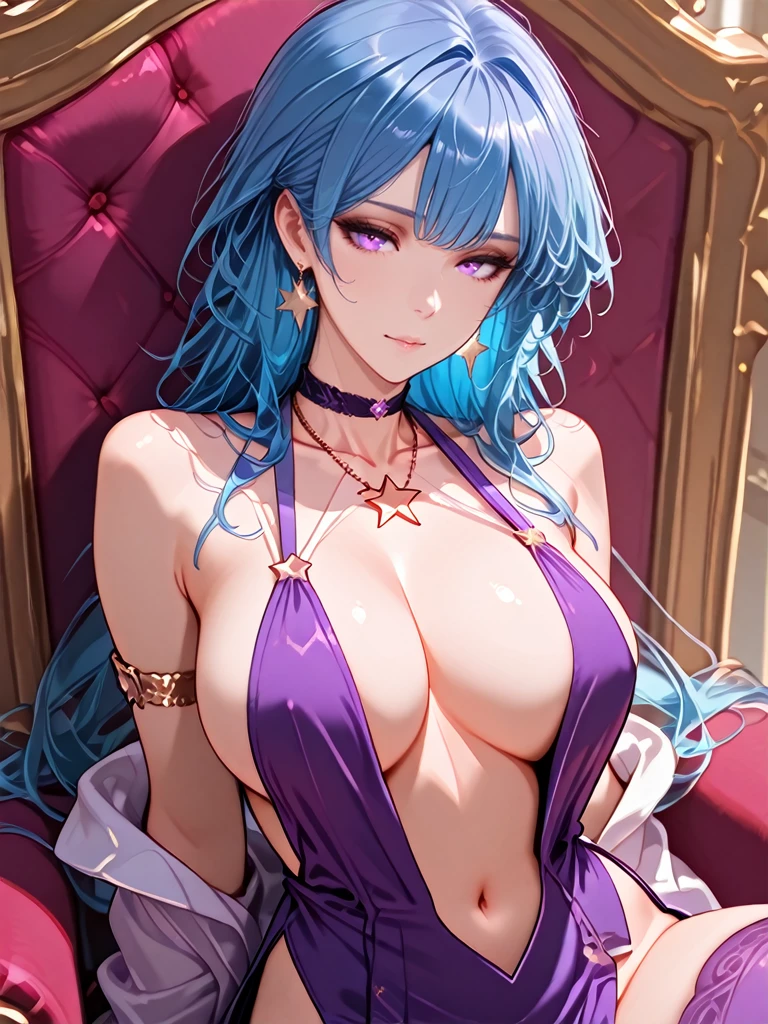 cleavage,sideboob,breasts apart,navel,bare shoulders,purple sleeveless dress,halter dress,plunging neckline,pelvic curtain,armlet,choker,star earrings,no panties,purple thighhighs,star symbol pendant necklace,