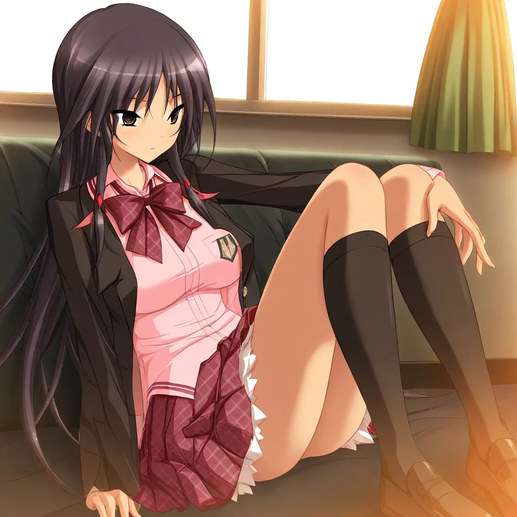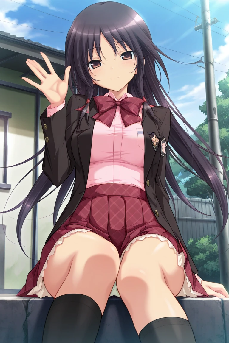 iori-uniform, pink shirt, black blazer, red bow, plaid bow, red skirt, plaid skirt, pleated skirt, black knee socks,