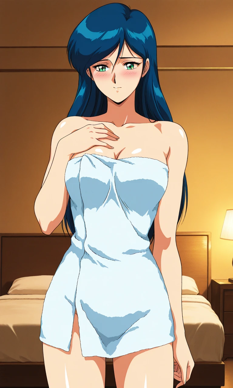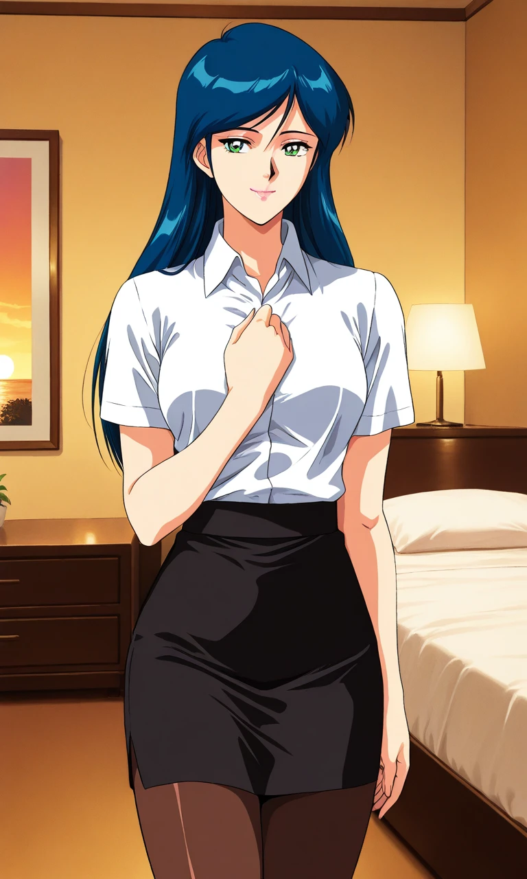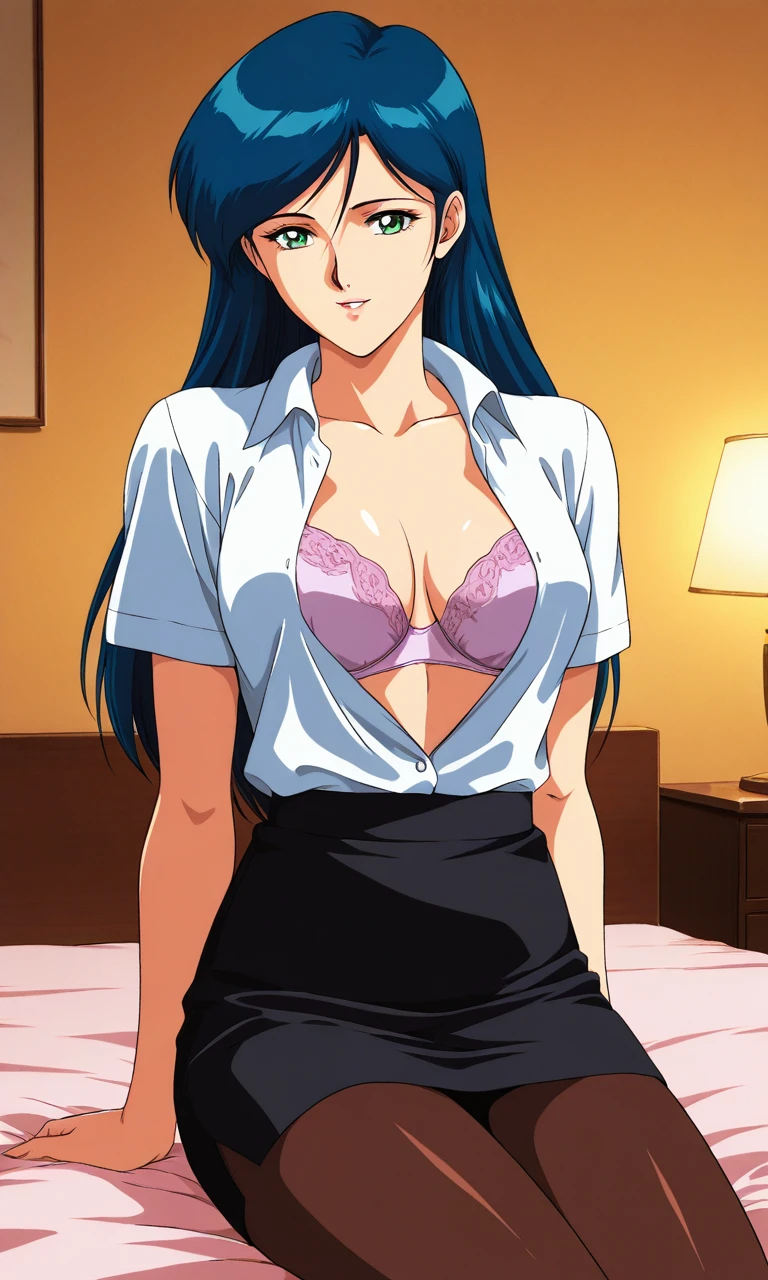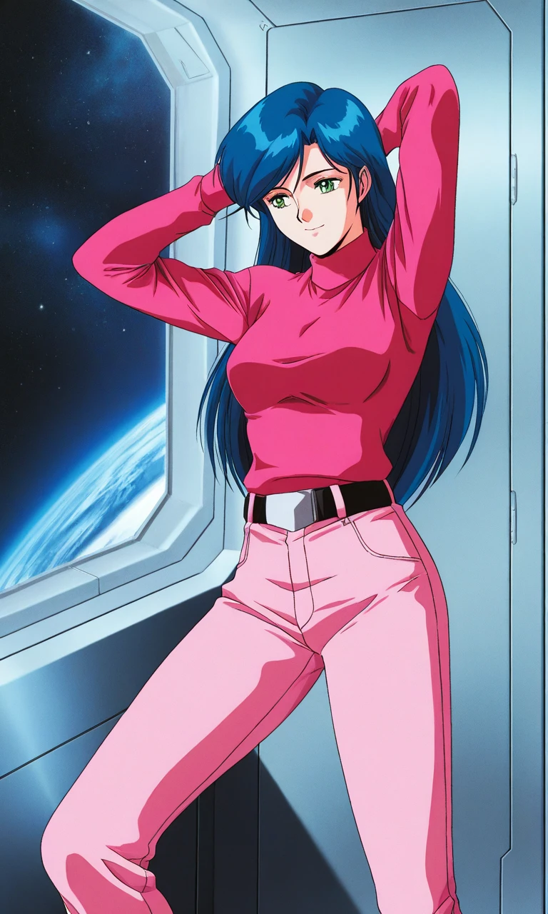 PROMPT HEAD: <lora:AkiKisaragi001:1>, masterpiece, best quality, amazing quality, 1990s (style), anime coloring, 1girl, kisaragi aki, green eyes, blue hair, long hair, medium breasts,