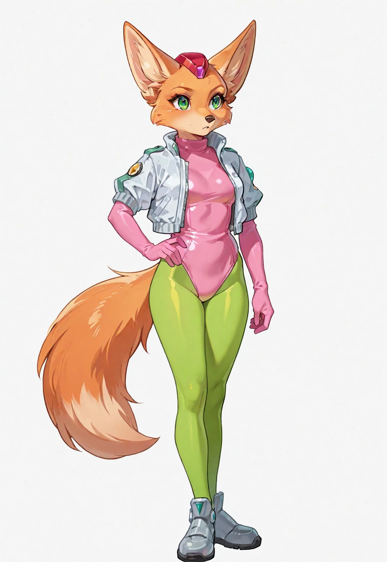 green pantyhose, pink leotard, white jacket, long pink glove, red headwear with a gemstone on itDescription
