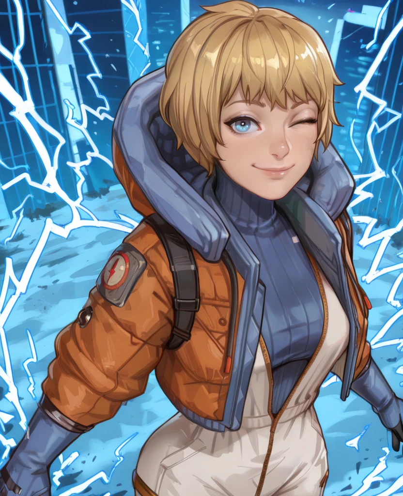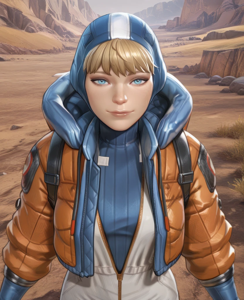 turtleneck, head cap, white Jumpsuit, orange jacket, zipper, or zipper down