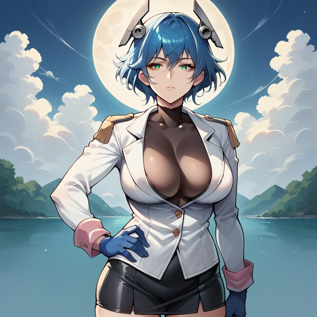 white jacket, black thighhighs, blue gloves, covered breasts, covered collarbone, black skirt, microskirt, long sleeves, bodystocking, bodystocking under clothes, pink wrist cuffs, epaulettes,Disclaimer: Add "double-breasted" to the Negative Prompt. I'm not sure why, but it's try to make the jacket with too many buttons.