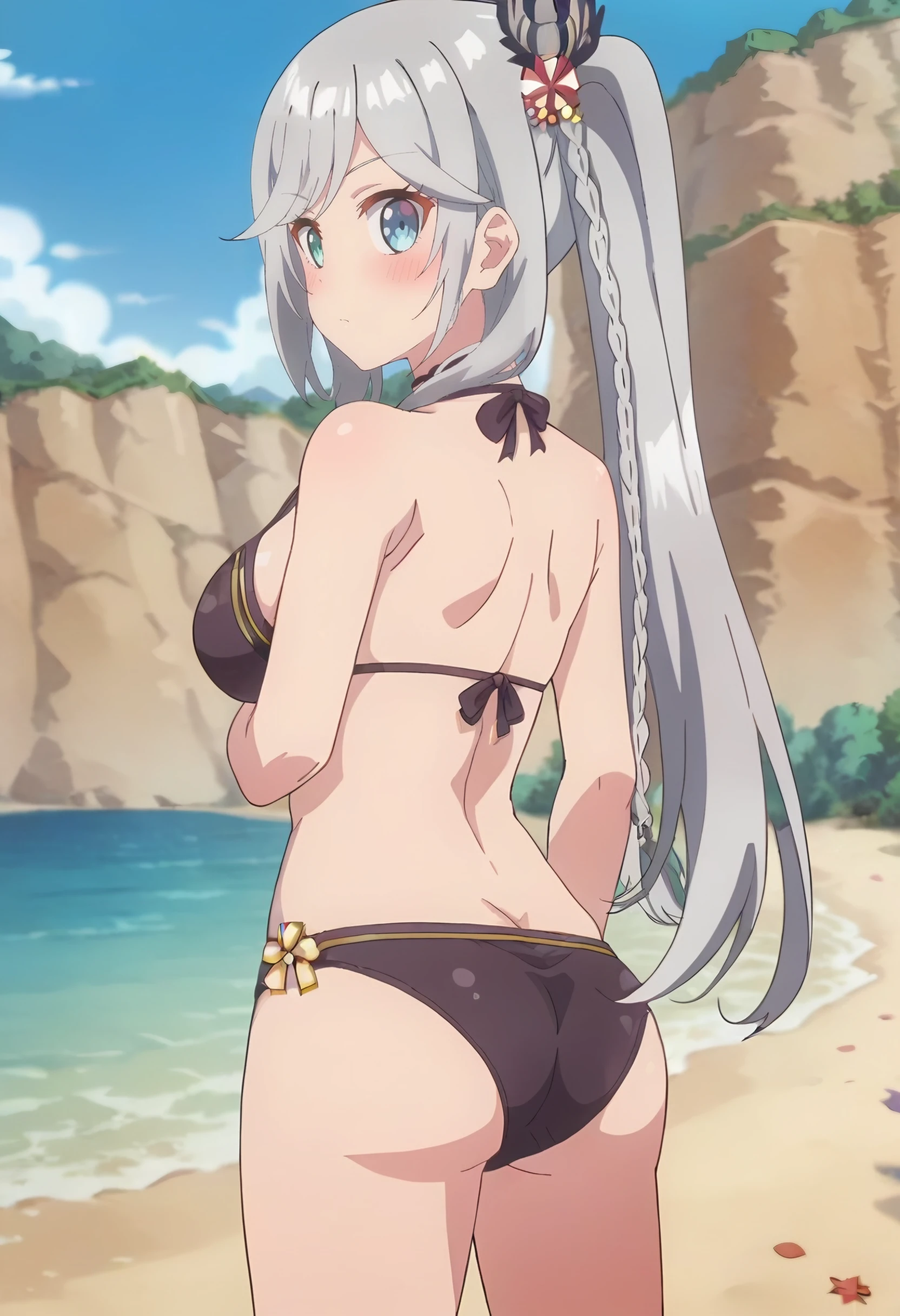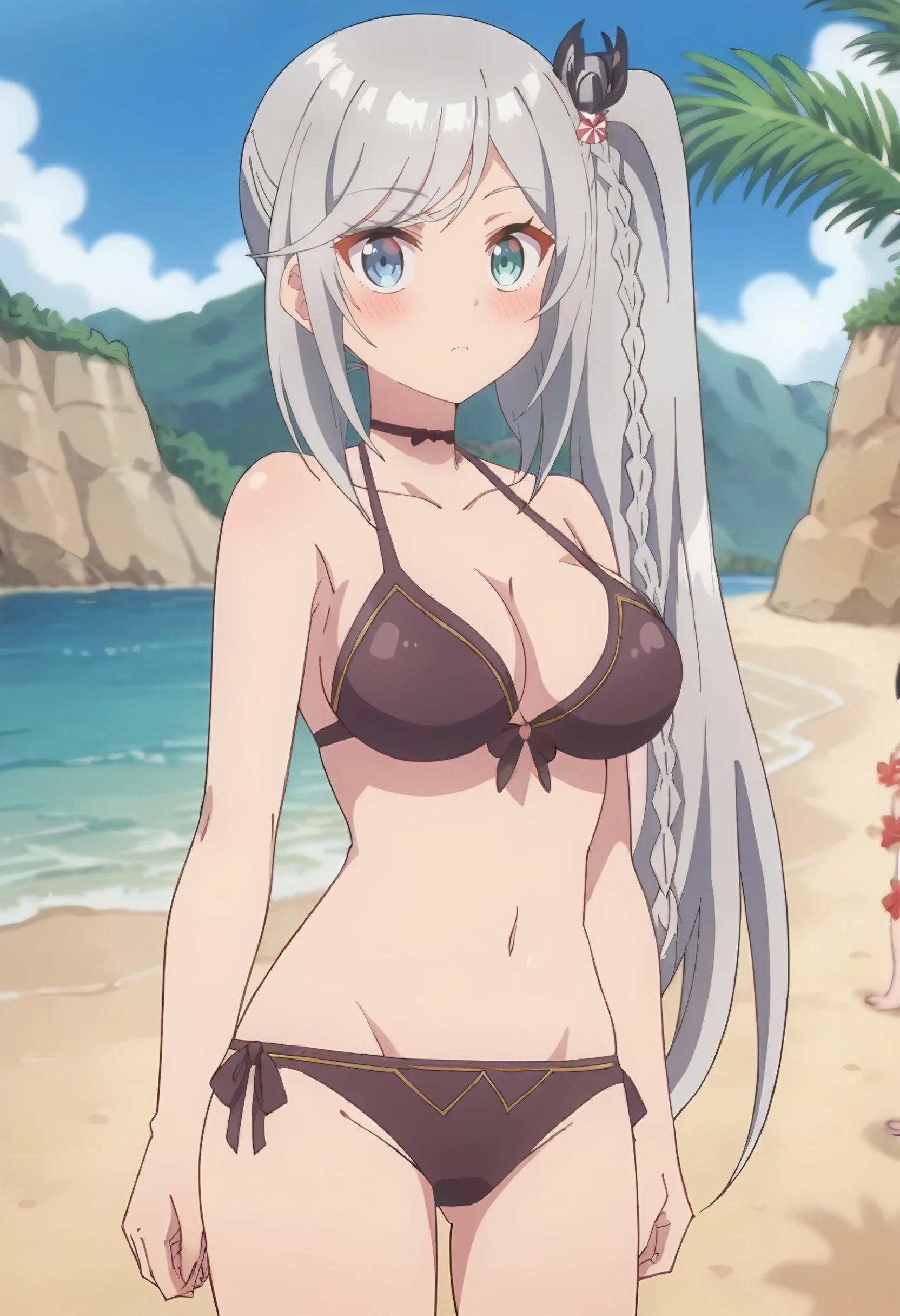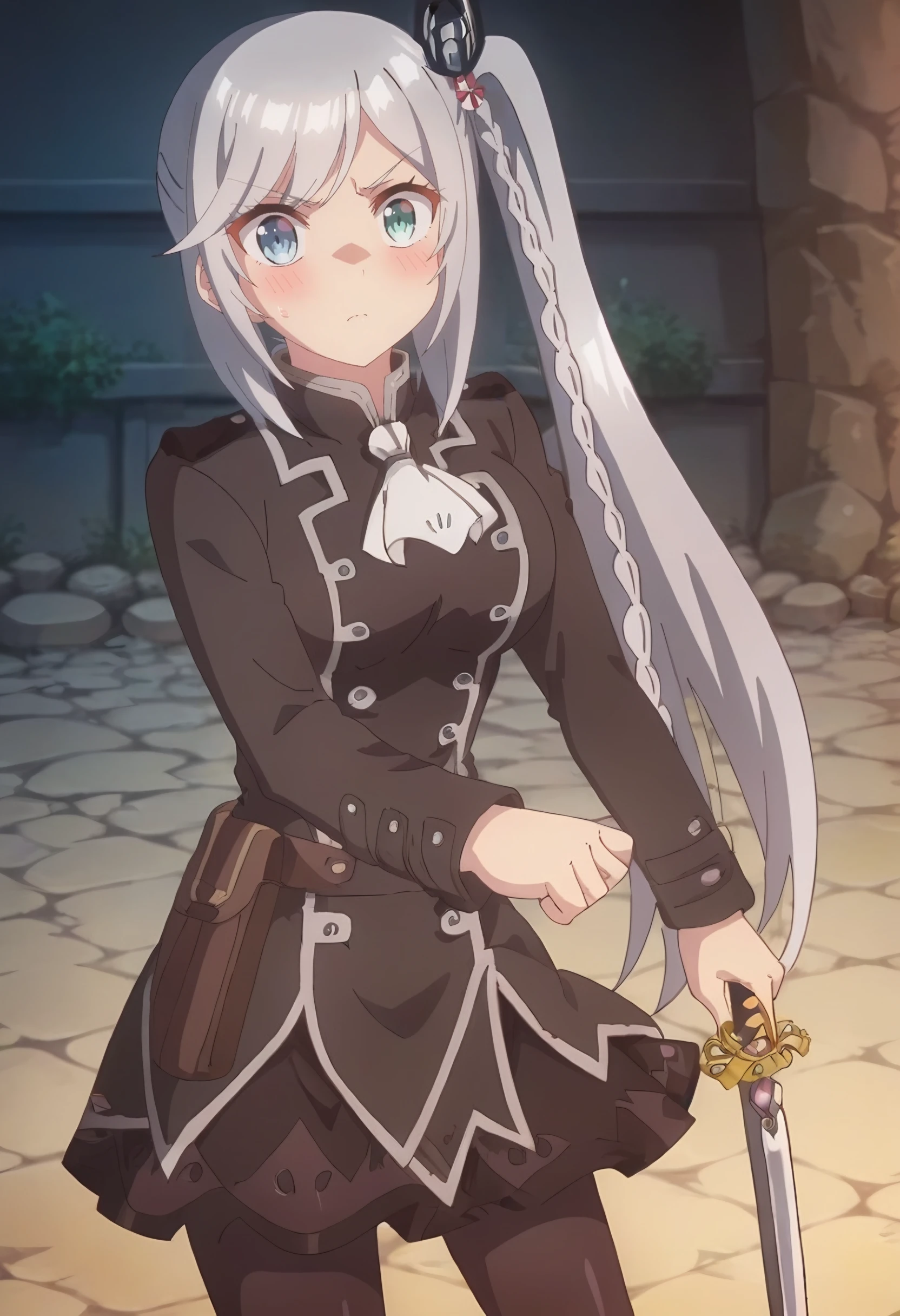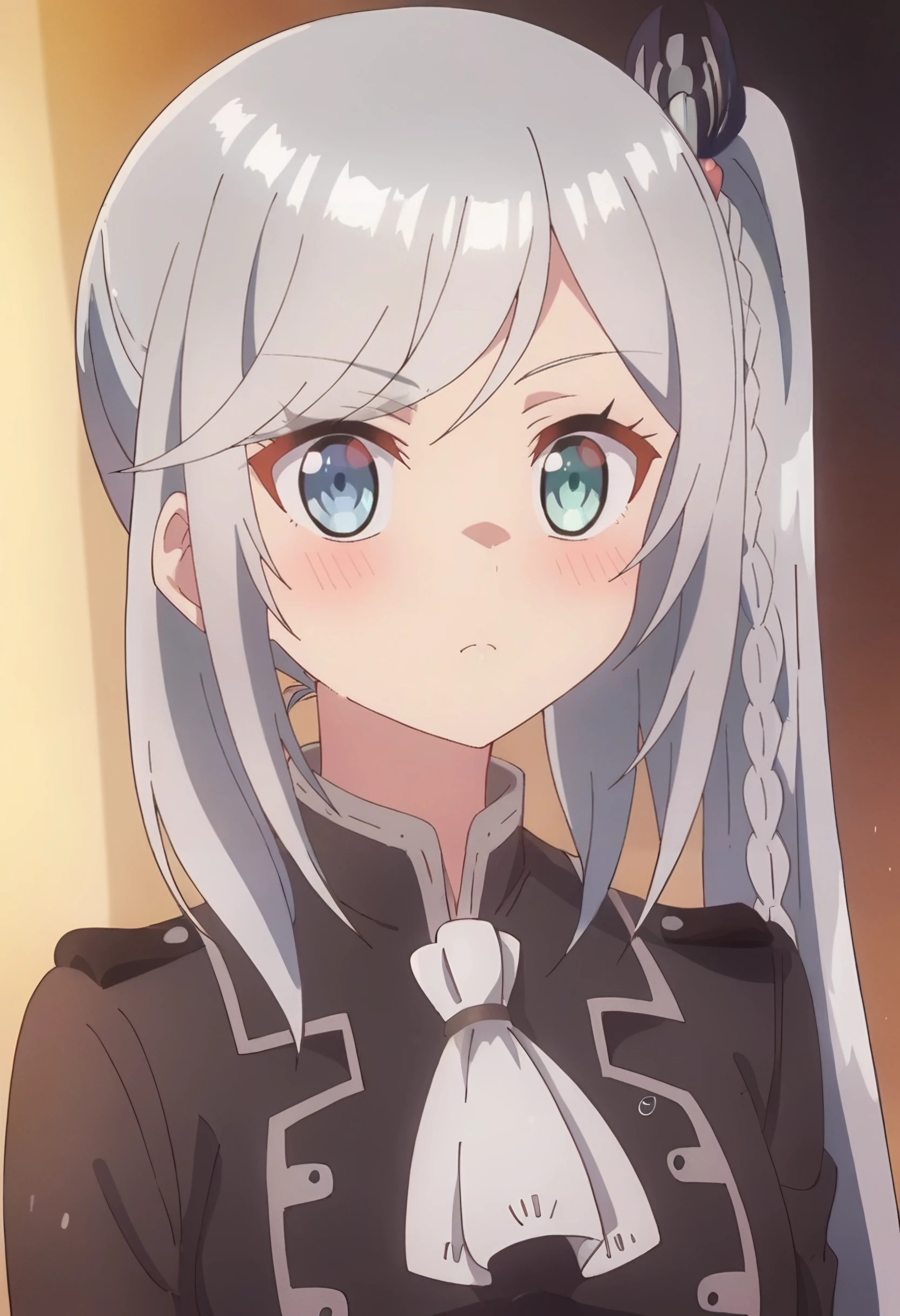 livia do udis, 1girl, long_hair, solo, blush, blue_eyes, braid, bangs, side_ponytail, heterochromia, grey_hair,