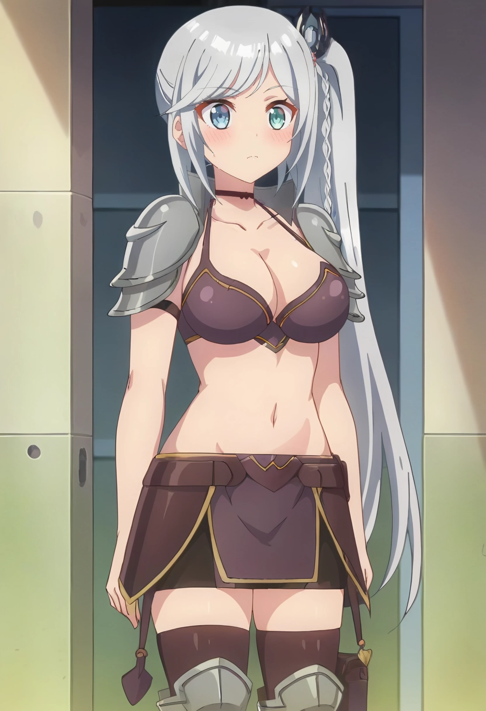 outfit 3 : skirt, large_breasts, thighhighs, navel, cleavage, boots , midriff, armor,shoulder_armor