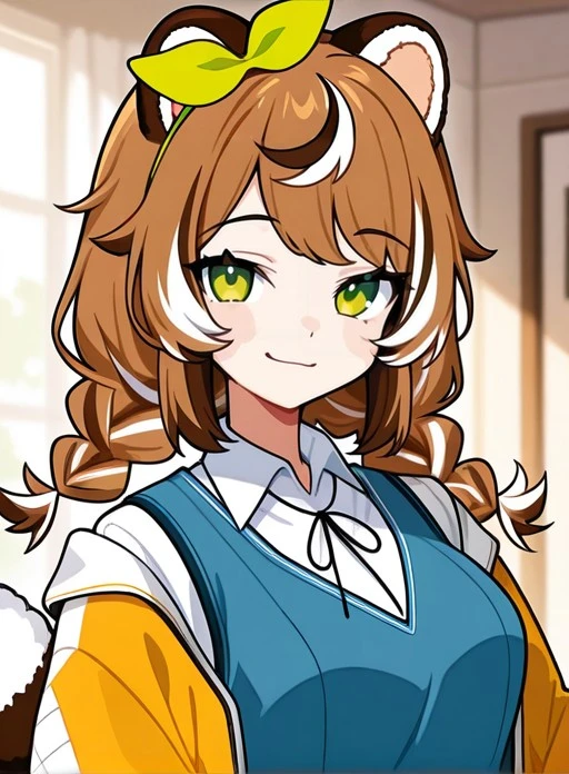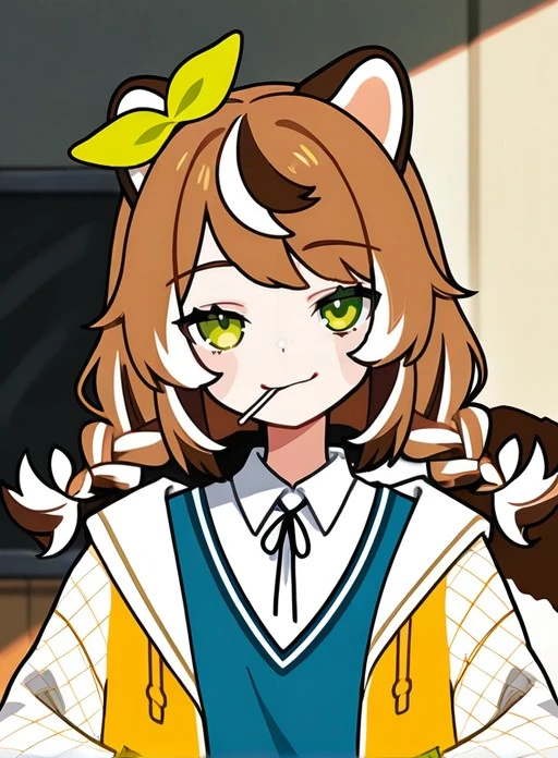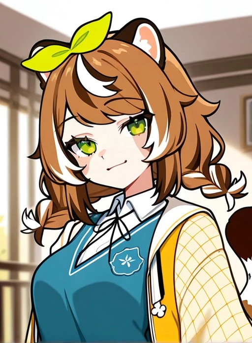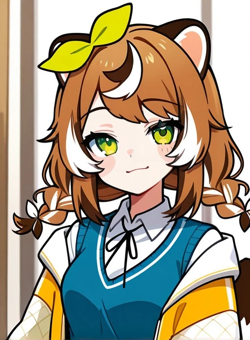Maynuk, 1girl, solo, long hair, brown hair, bow, animal ears, twintails, green eyes, tail, braid, multicolored hair, hair bow, virtual youtuber, streaked hair, twin braids, monster girl, green bow, tiger ears, tiger tail, bow hairband, tiger girl, , raccoon ears, raccoon tail, raccoon girl, raccoon ears,medium breasts,