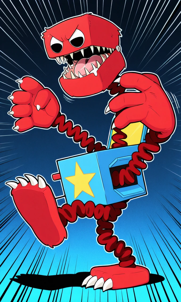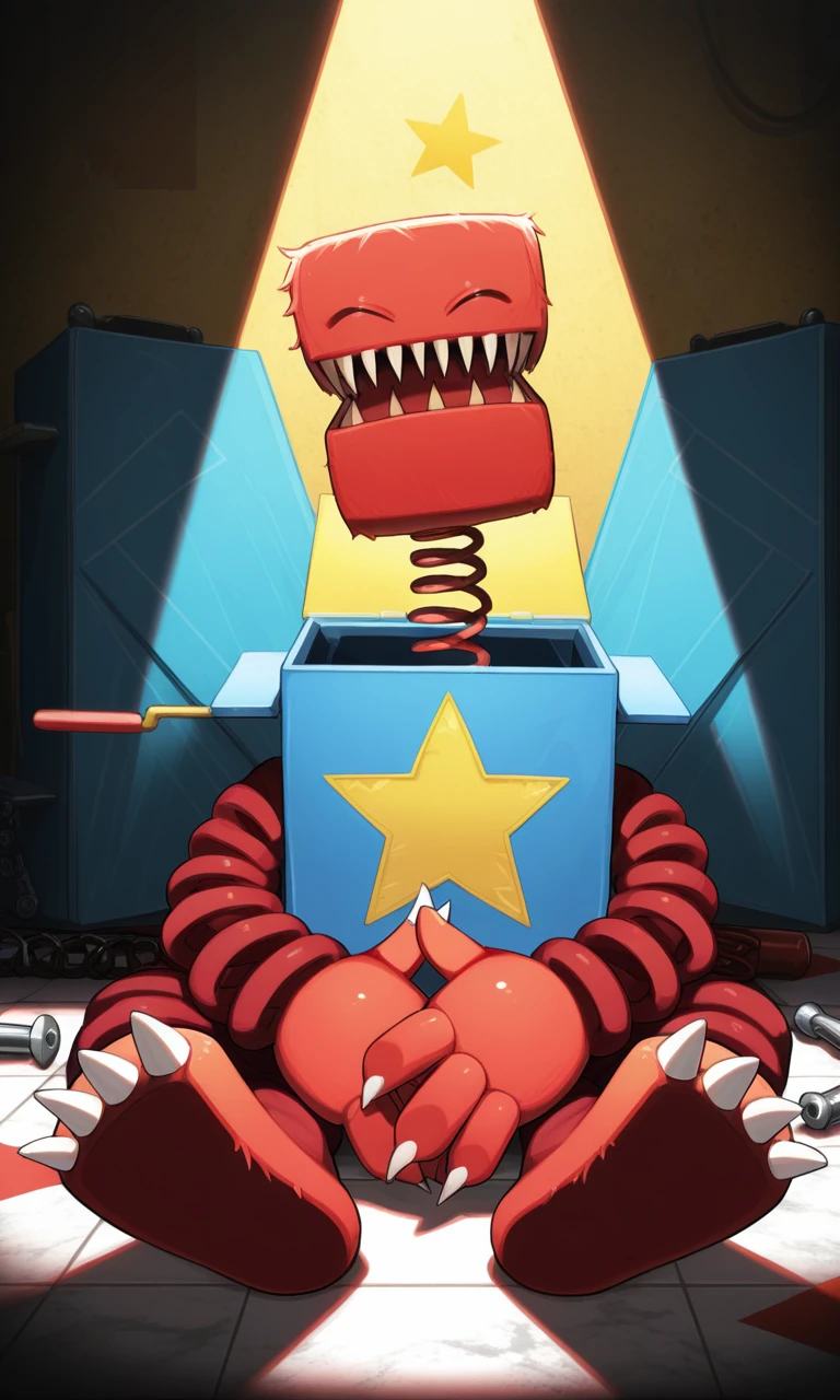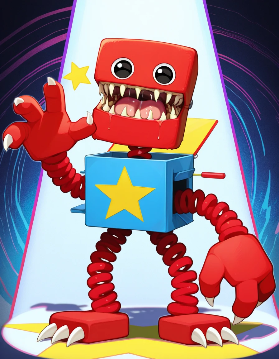 "jack-in-the-box, blue box torso, open lid, hand crank, star \(symbol\), red coils,"