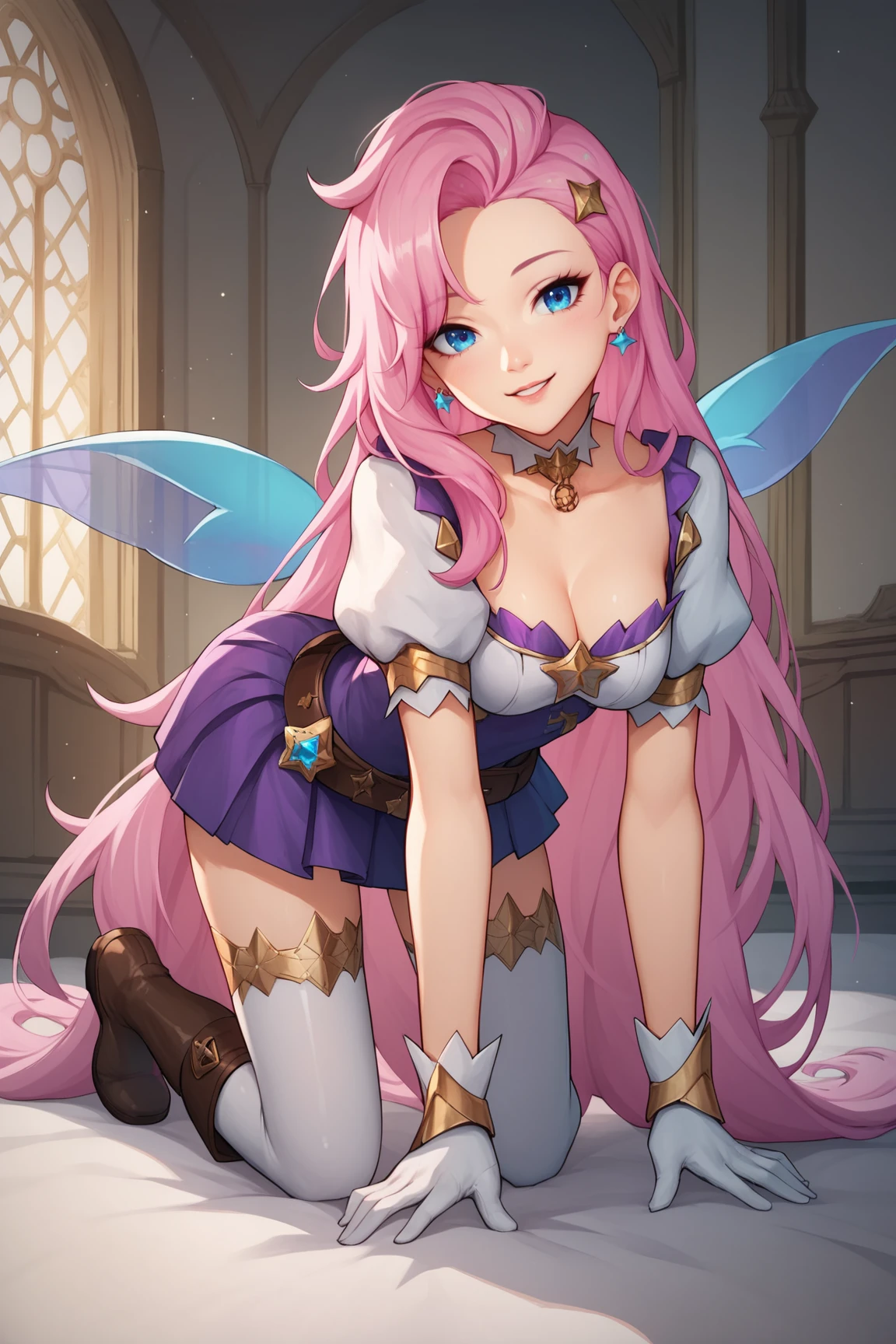 SeraphineLoLXL, blue eyes, pink hair, bangs, hair ornament, very long hair, shiny hair, star (symbol), earrings, medium breasts, choker, white jacket, puffy short sleeves, purple dress, wings, white gloves, skirt, belt, white thighhighs, brown boots