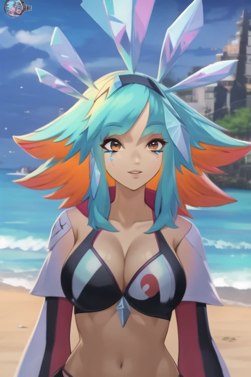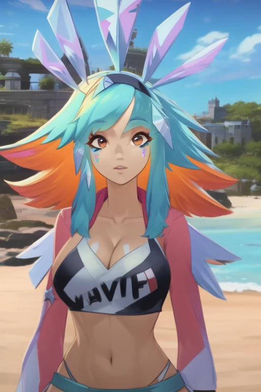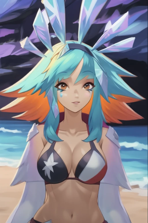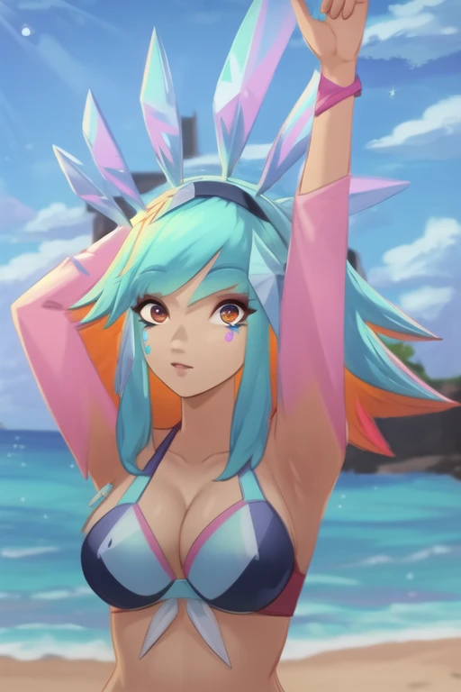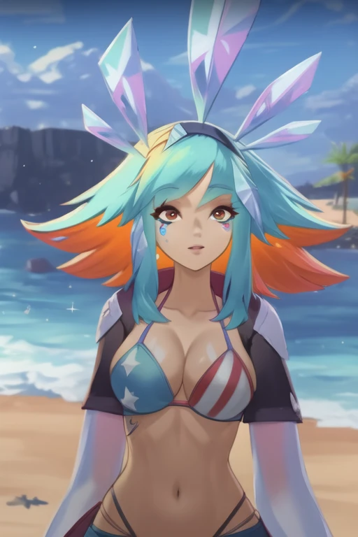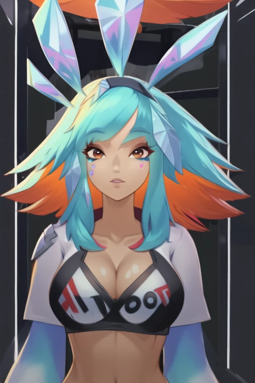 1girl, bangs, blue hair, multicolored hair, orange hair, orange eyes, animal ears