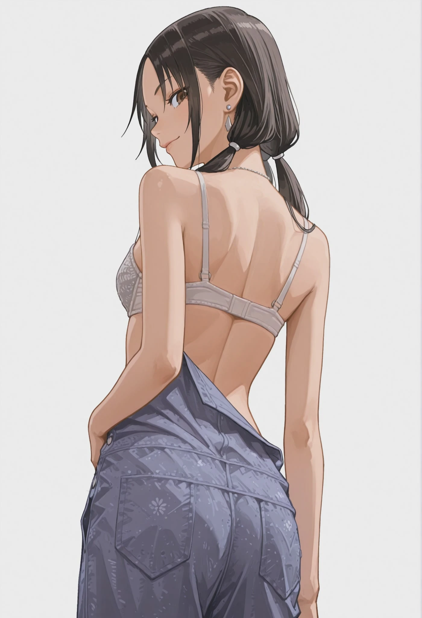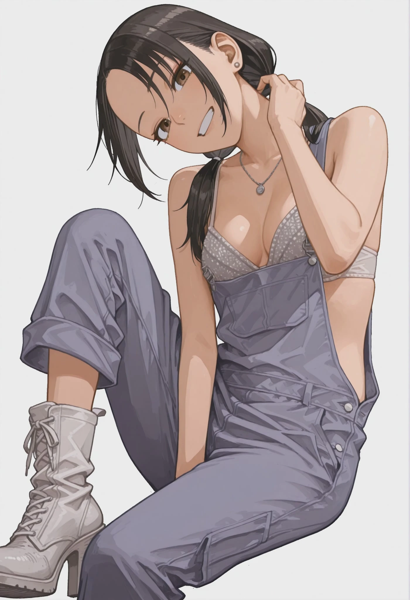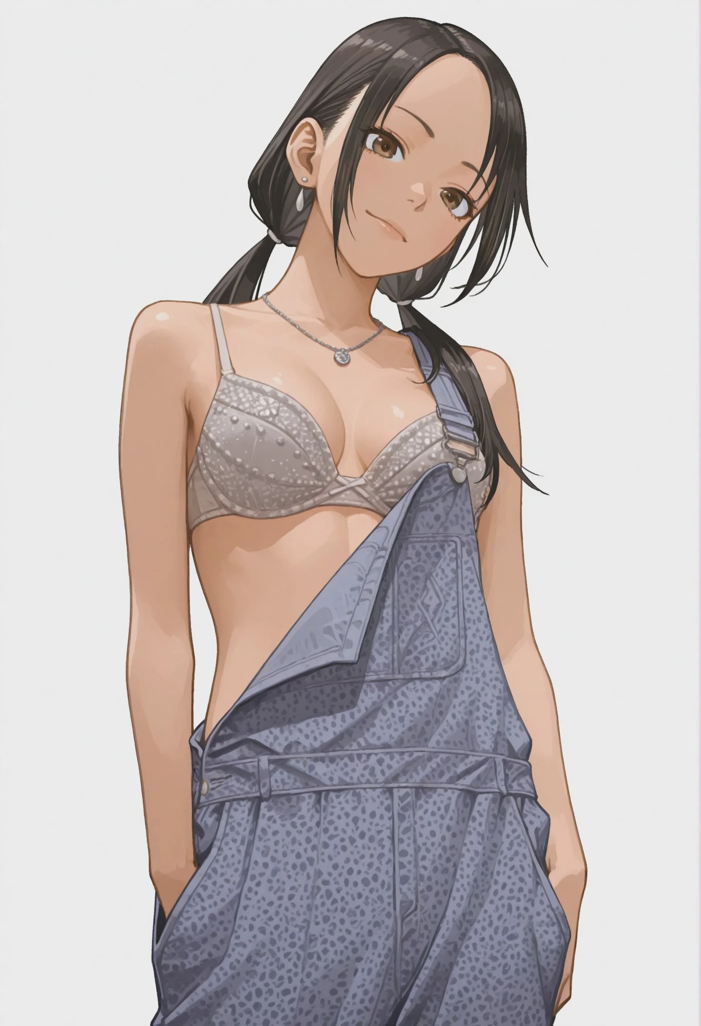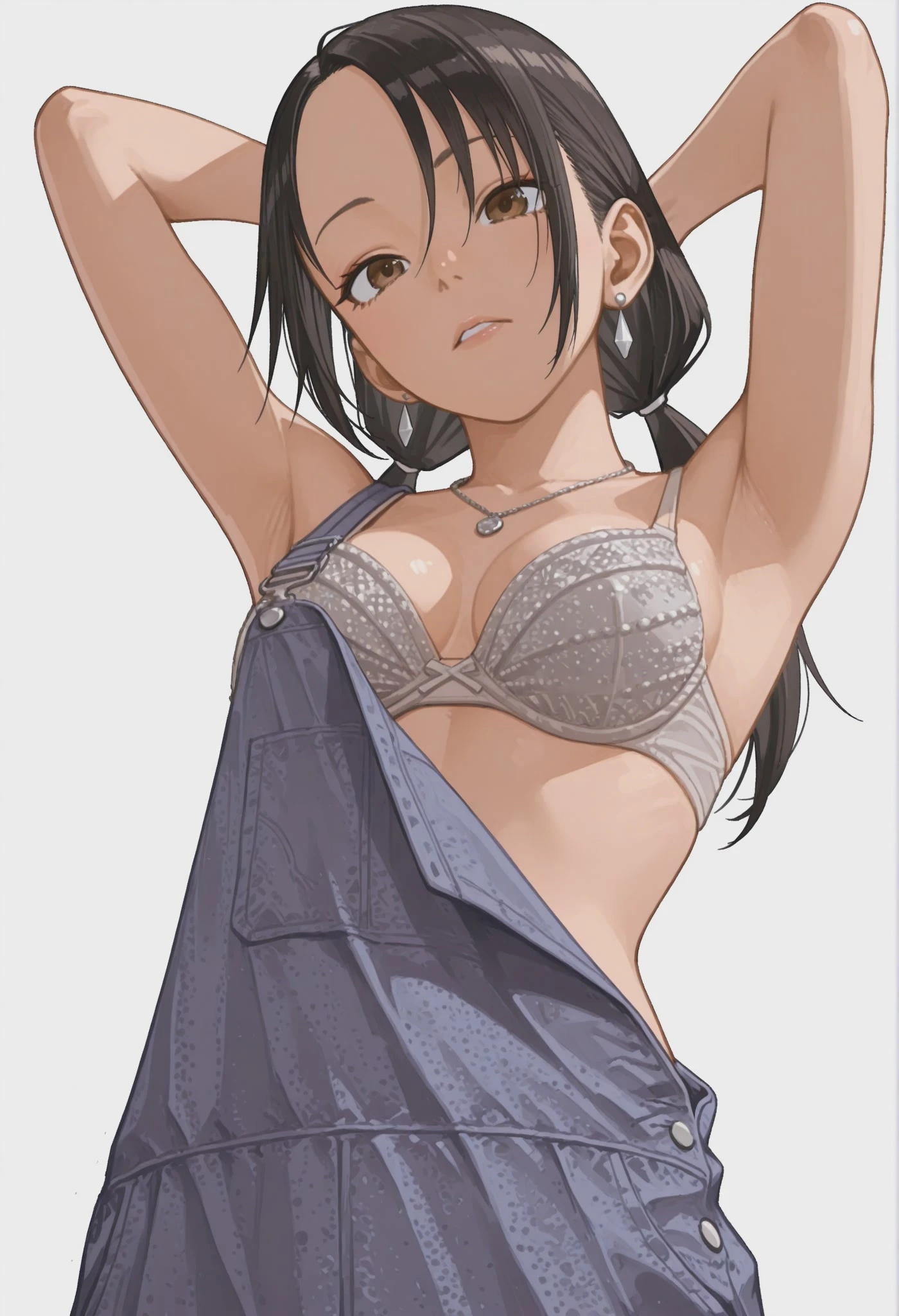 naughtyjeansda, bra, lingerie, overalls, denim, white bra, collarbone, bare shoulders, breasts, single strap, pelvic curtain