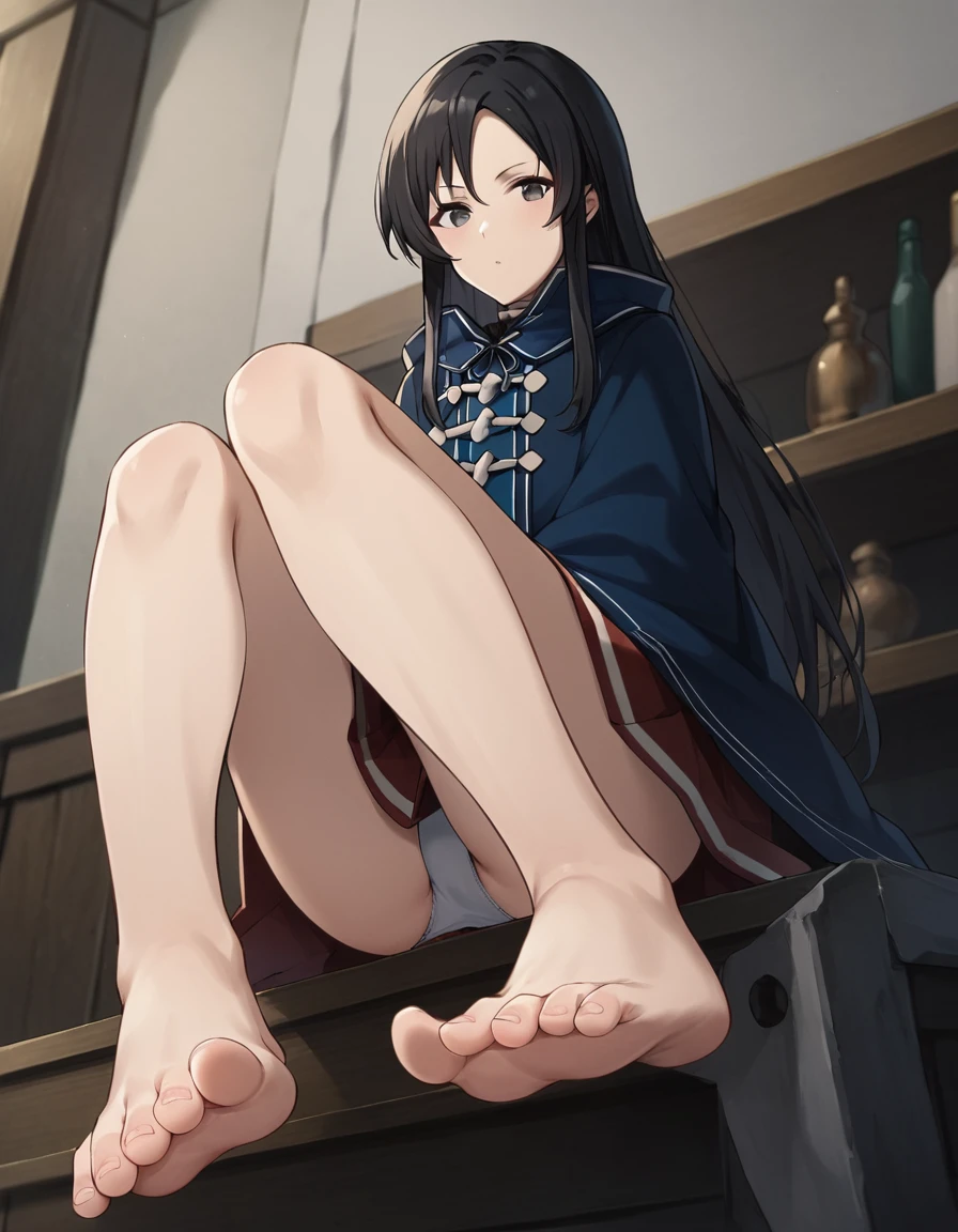 school uniform, blue cloak, belt, red skirt, white shirt, black shirt, long sleeves, white sleevesDescription