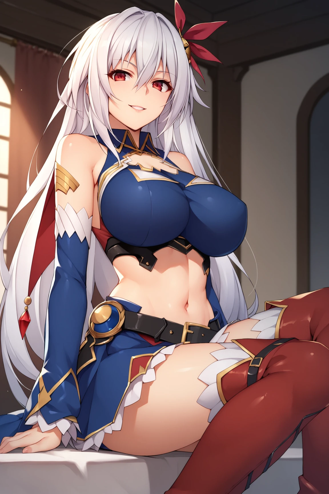 EleonoraViltariaMOVXL, red eyes, white hair, long hair, hair between eyes, sidelocks, hair ornament, large breasts, clothing cutout, blue midriff, detached sleeves, blue sleeves, black belt, blue skirt, red thigh boots