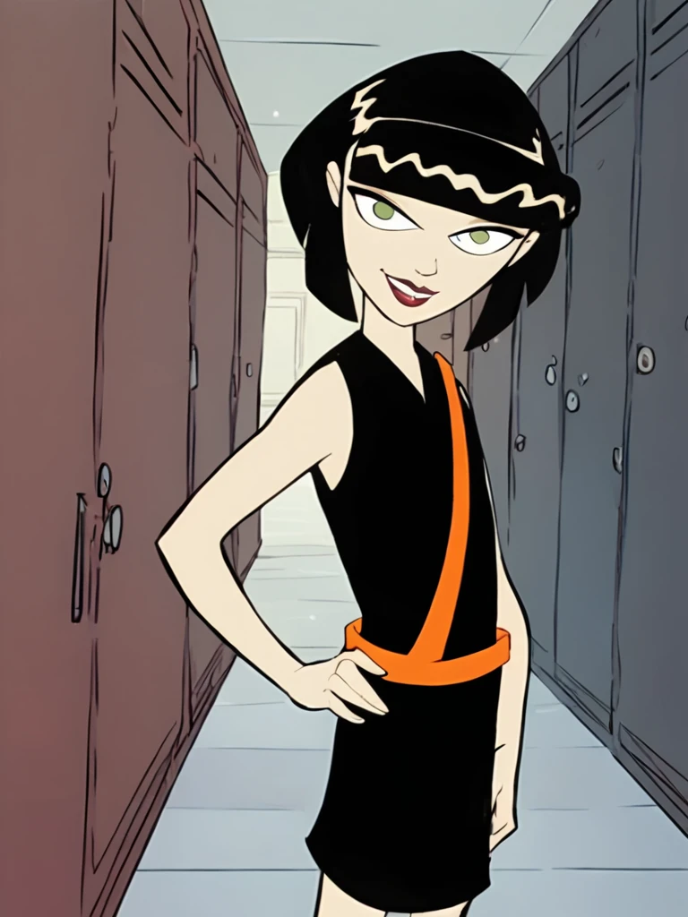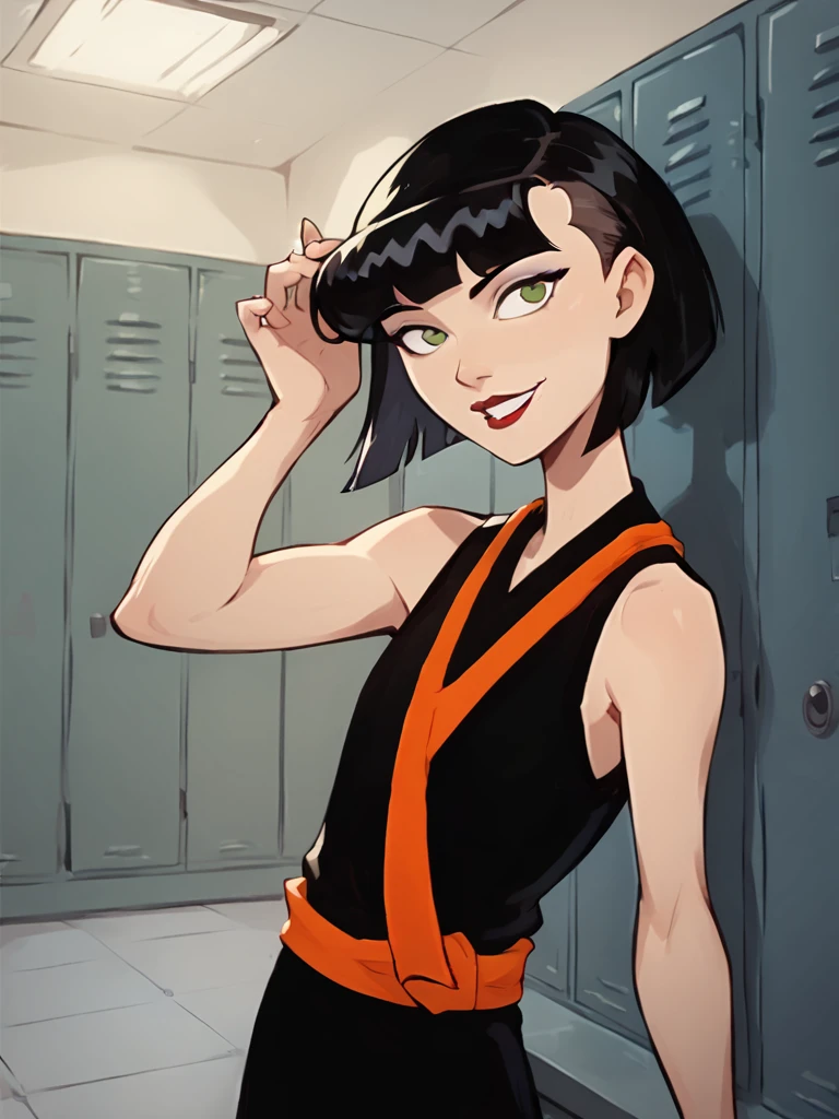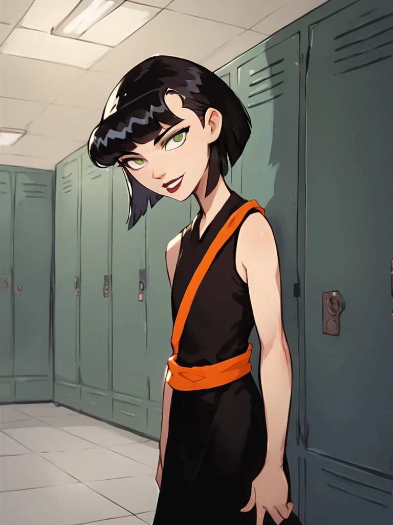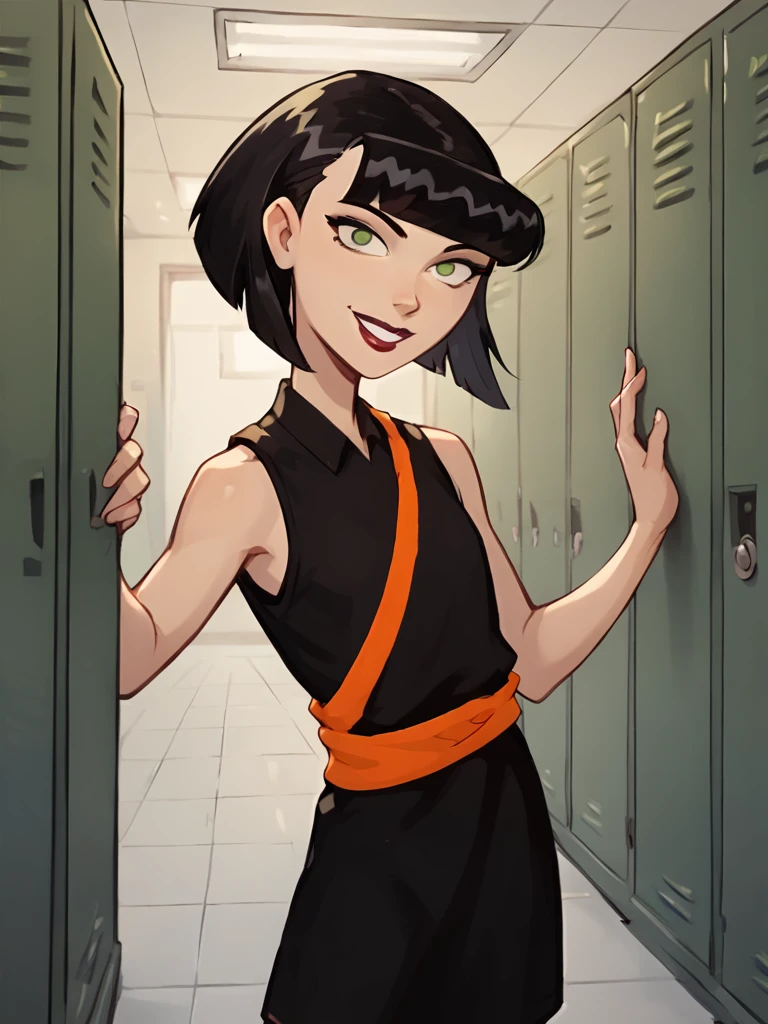 ingridthird, 1girl, black hair, solo, short hair, green eyes, orange sash, black dress, sleeveless, makeup, lipstick, bob cut