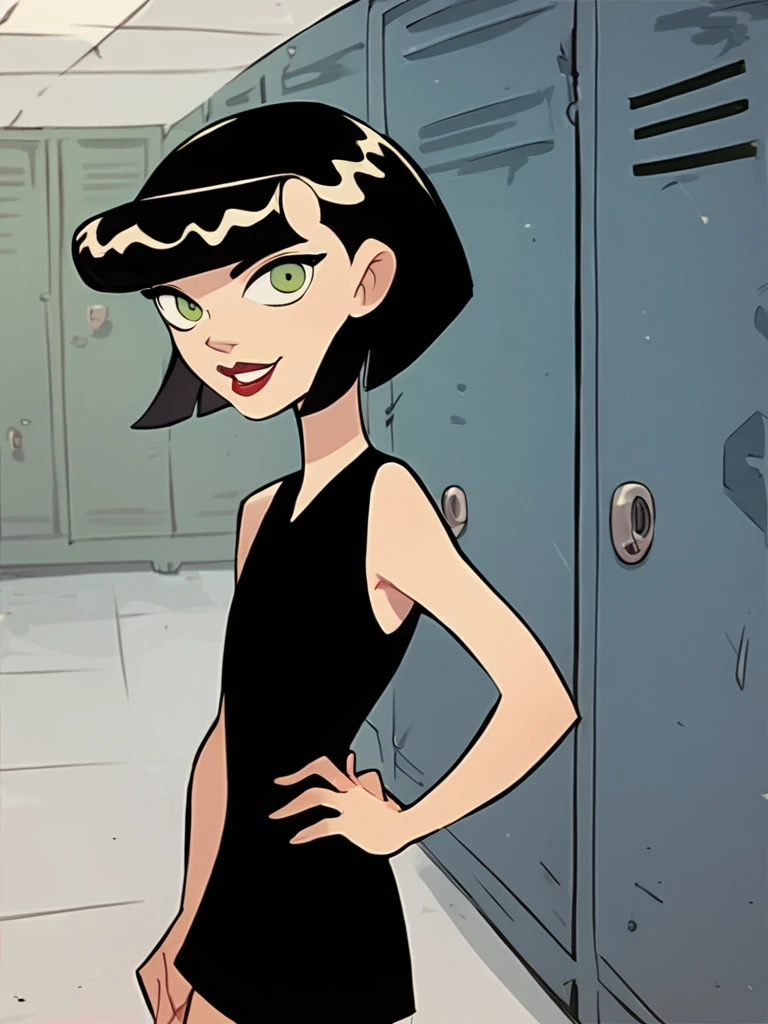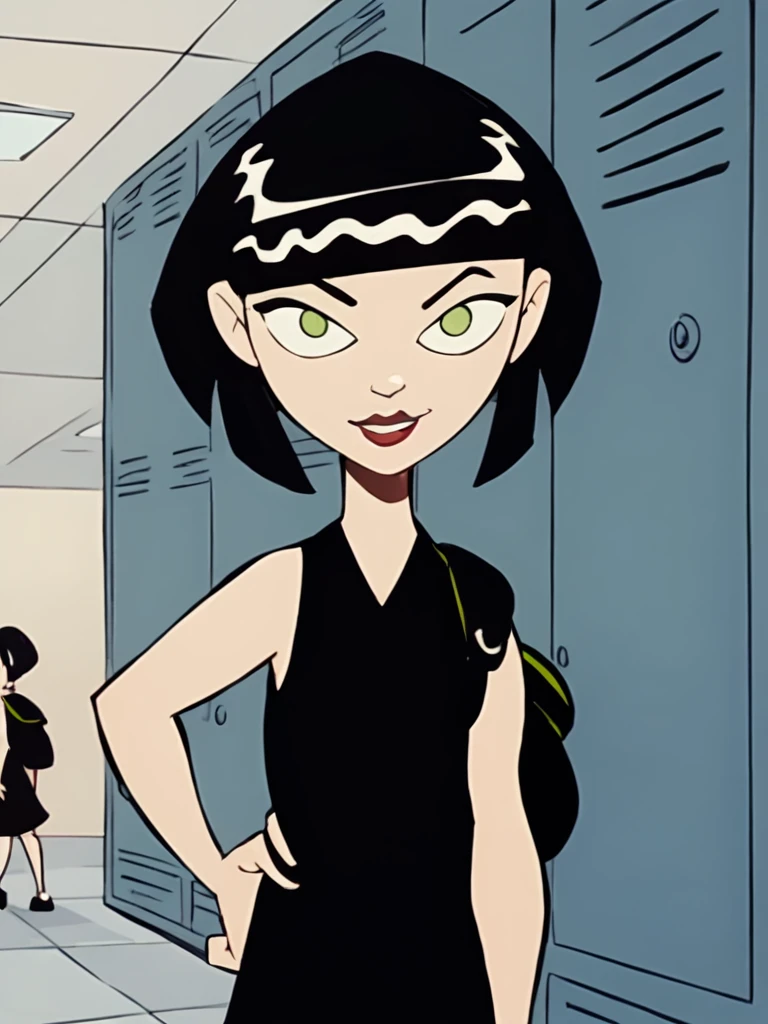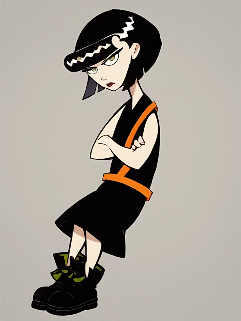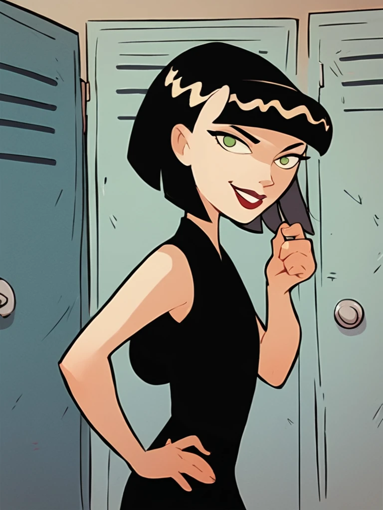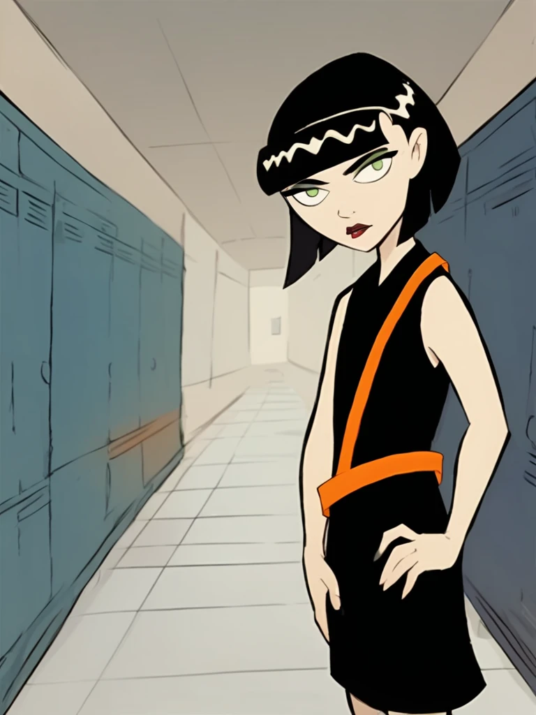 ingridthird, 1girl, black hair, solo, short hair, green eyes, orange sash, black dress, sleeveless, makeup, lipstick, bob cut