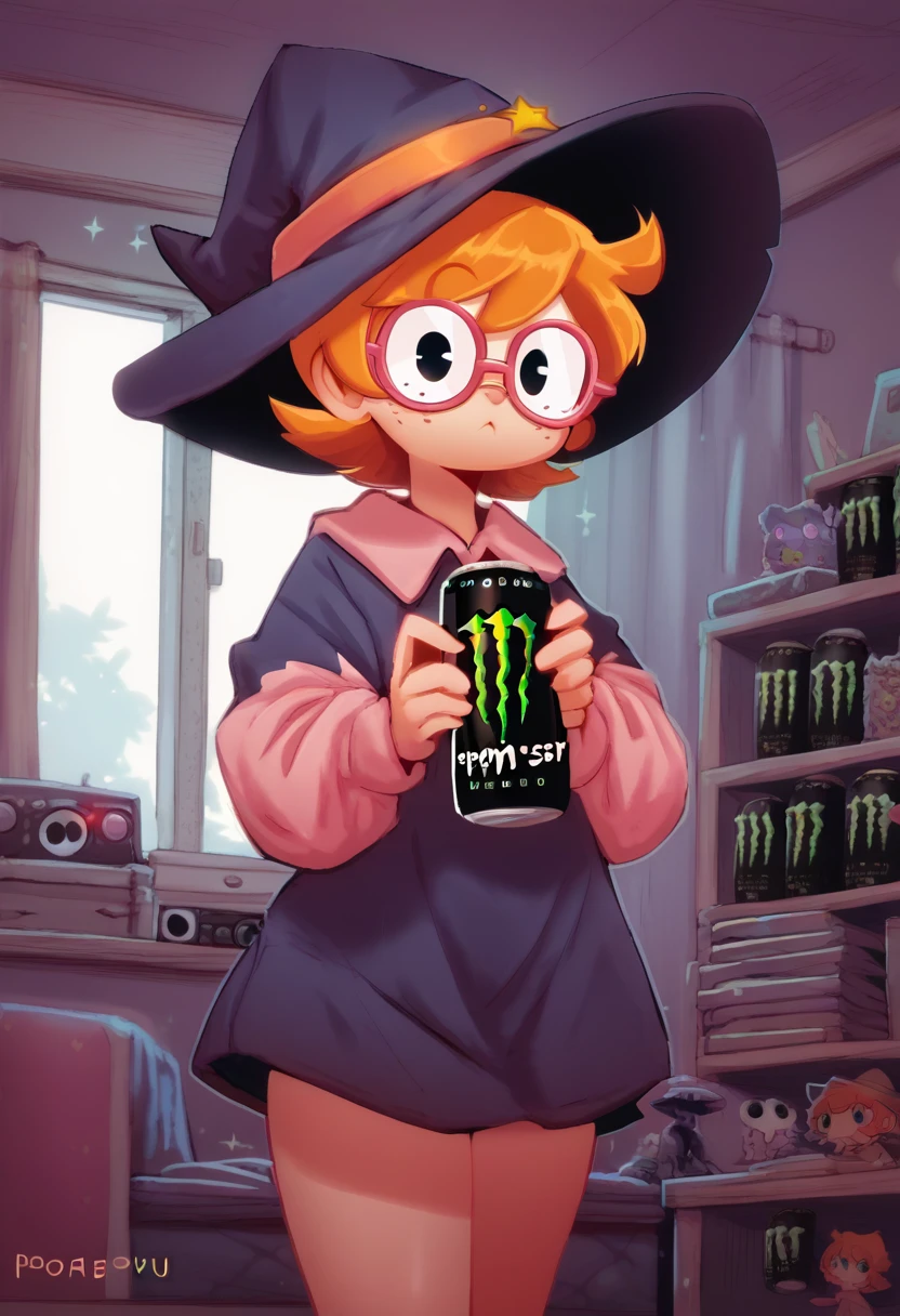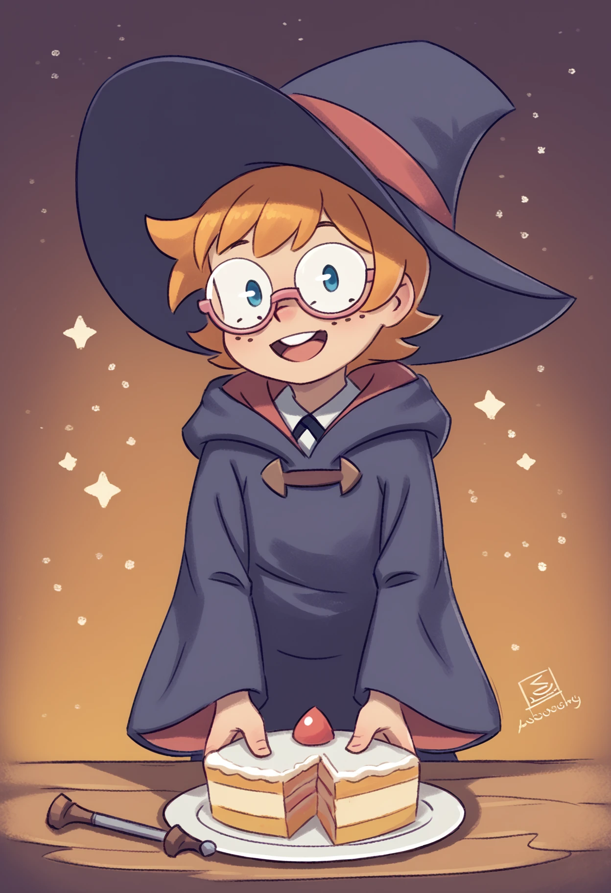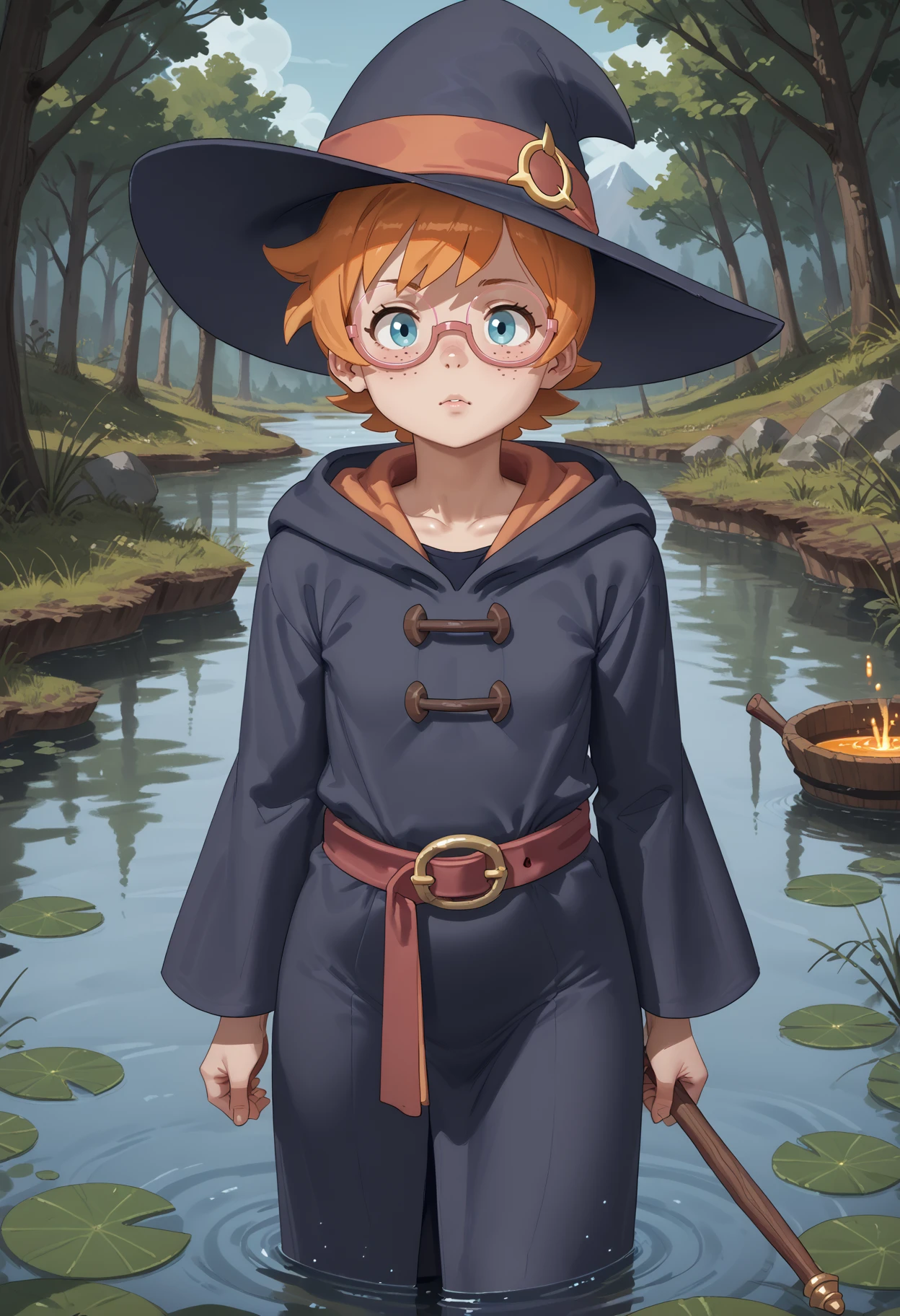 1girl, belt, freckles, glasses, hat, hooded robe, little witch academia, lotte jansson, orange hair, pink-framed eyewear, robe, semi-rimless eyewear, short hair, under-rim eyewear, wand, wide sleeves, witch, witch hat, <lora:lotte_jansson:0.8>