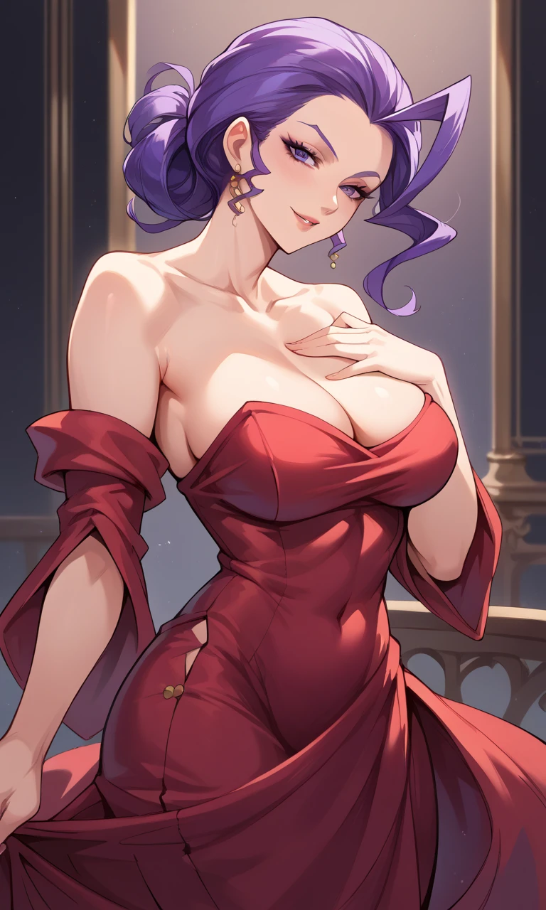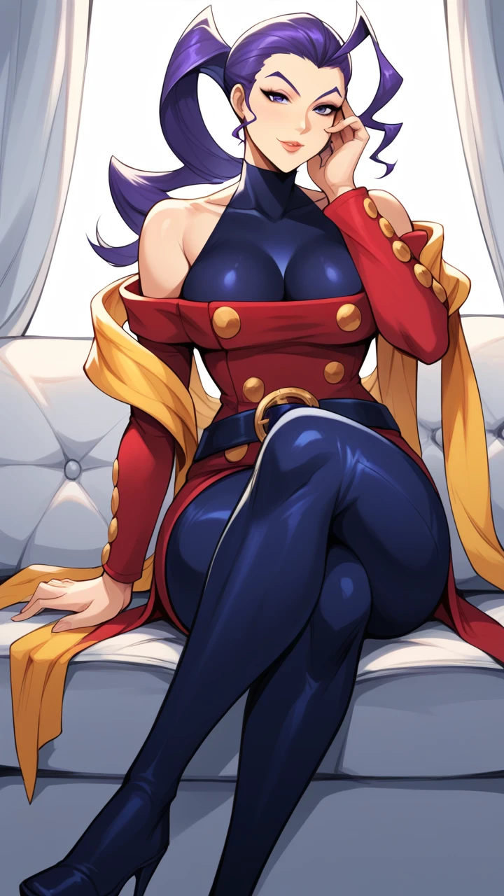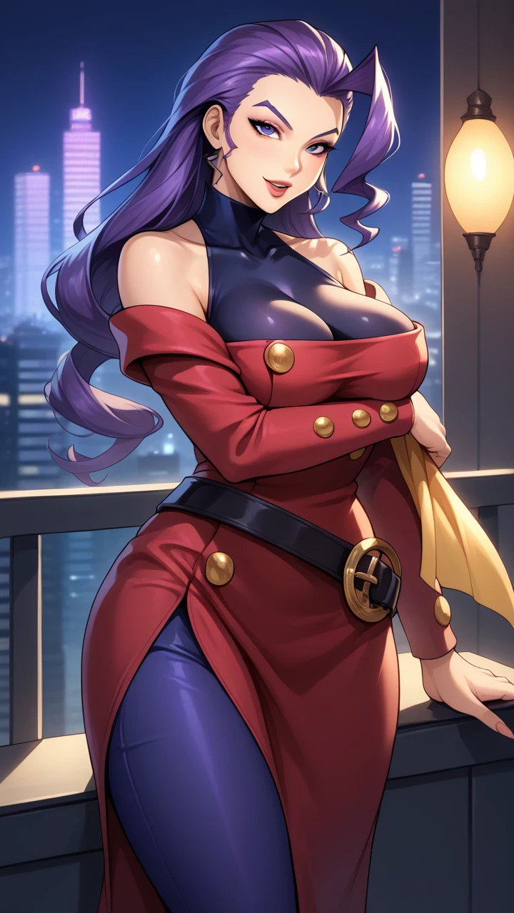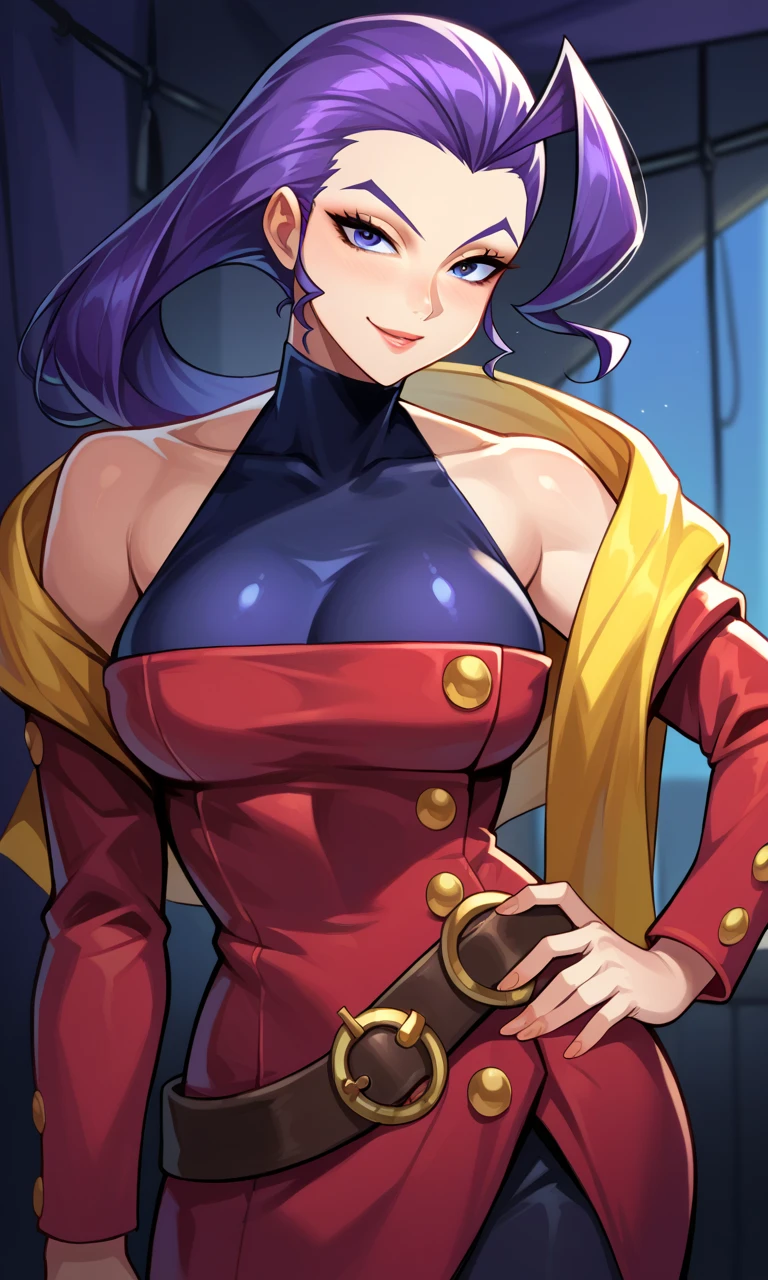 RoseSF, purple hair, purple eyes,ahoge, single hair intake, turtleneck, hair slicked back, bare shoulders, yellow shawl, red jacket, belt, purple leggings