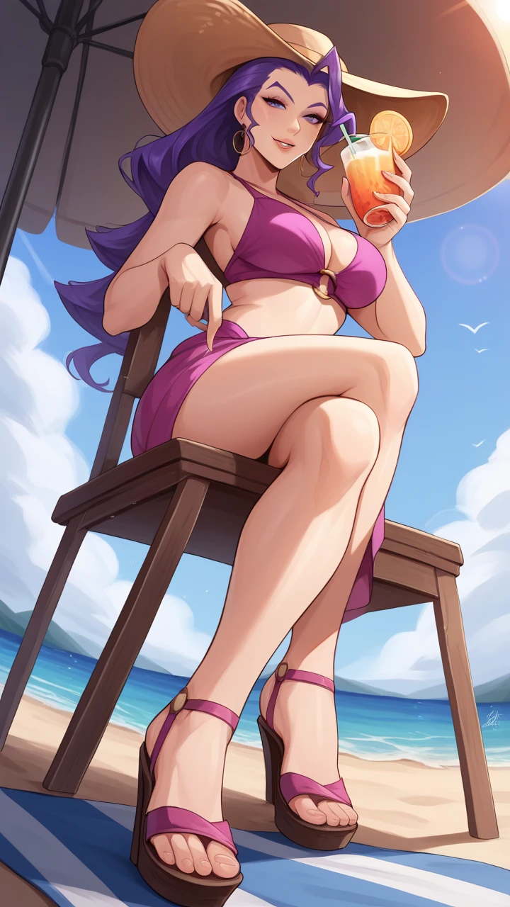 "RoseSF, purple hair, purple eyes,ahoge, single hair intake, turtleneck, hair slicked back, bare shoulders, yellow shawl, red jacket, belt, purple leggings"