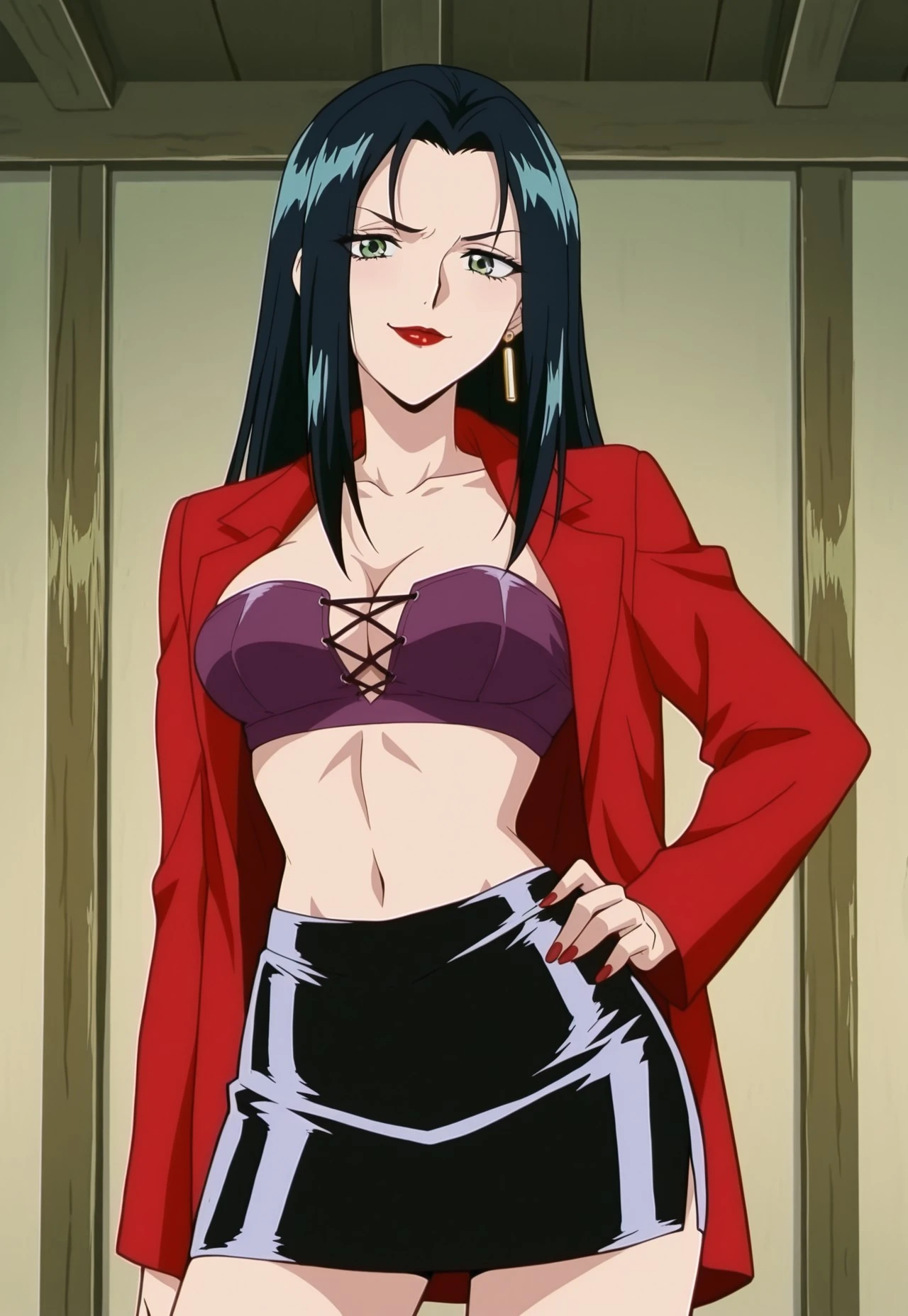 red jacket, purple bandeau, cross-laced clothes, midriff, black miniskirt, gold earrings, necklace