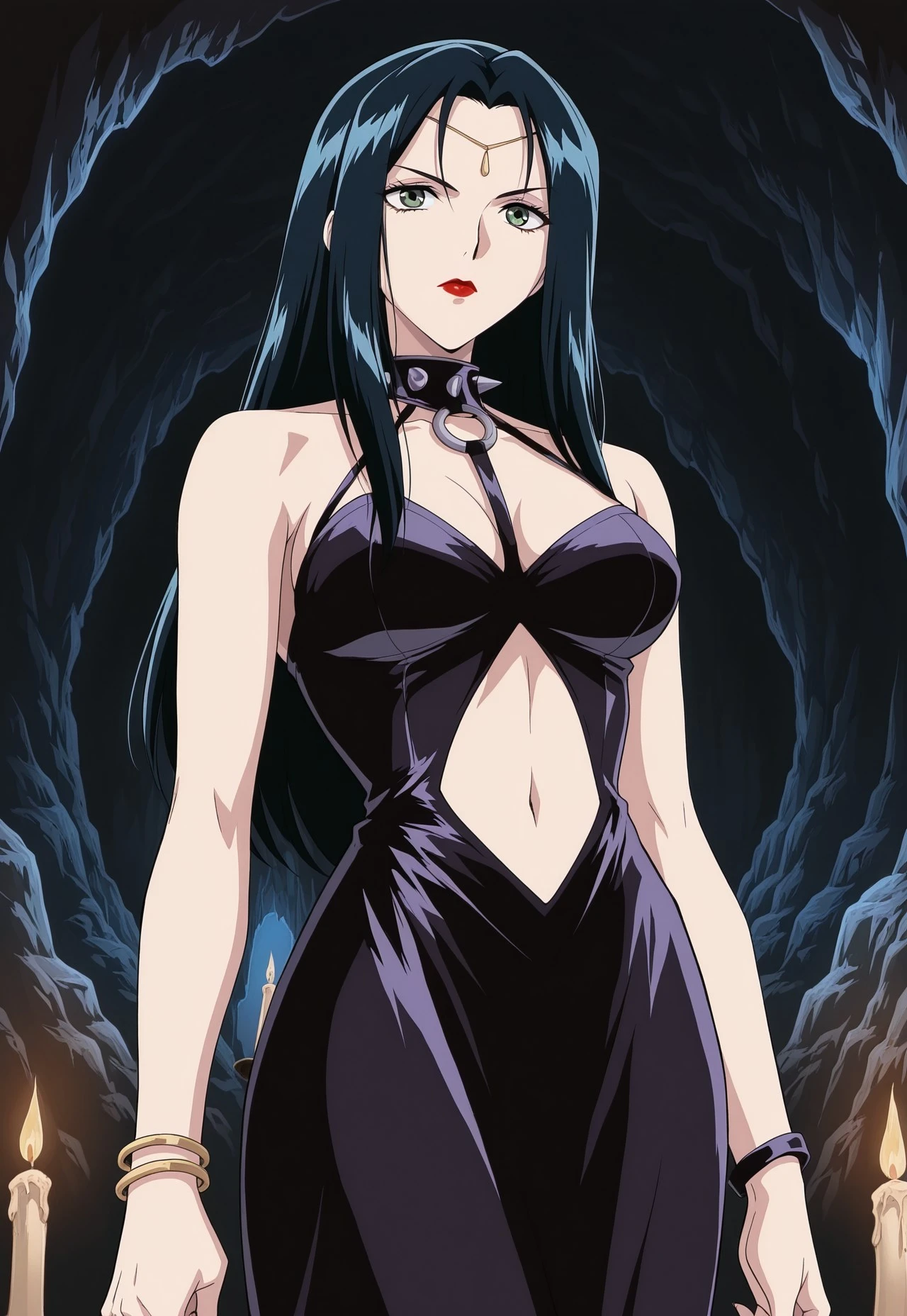 spiked collar, halterneck dress, navel, clothing cutout, circlet, bracelets