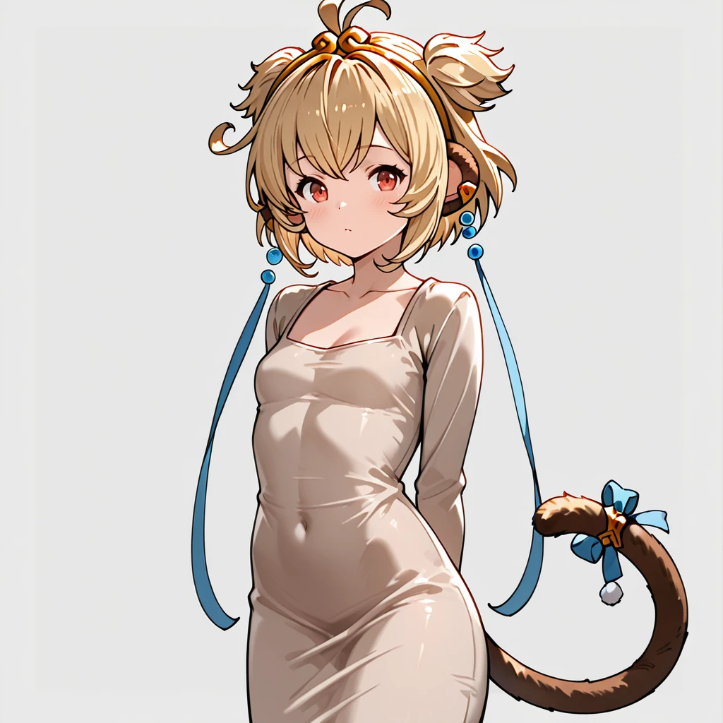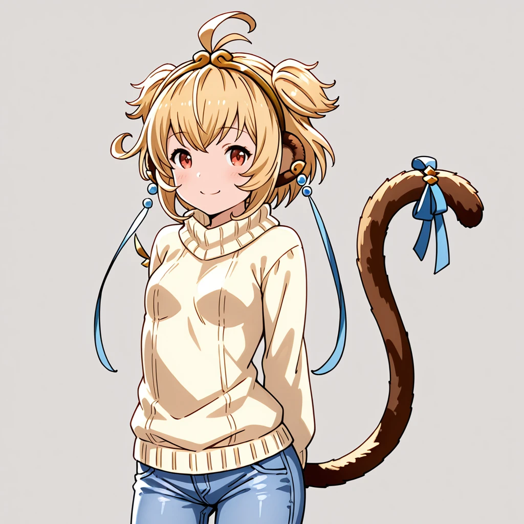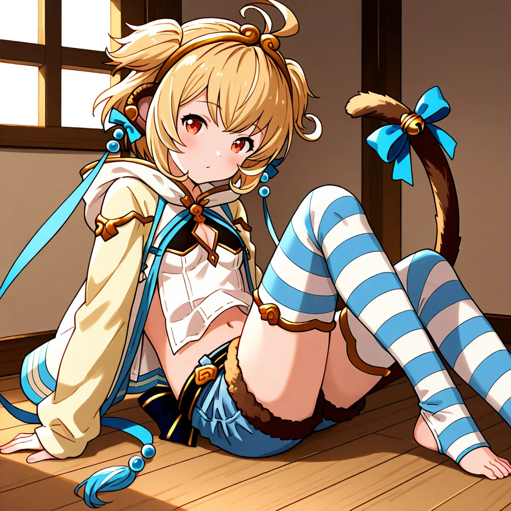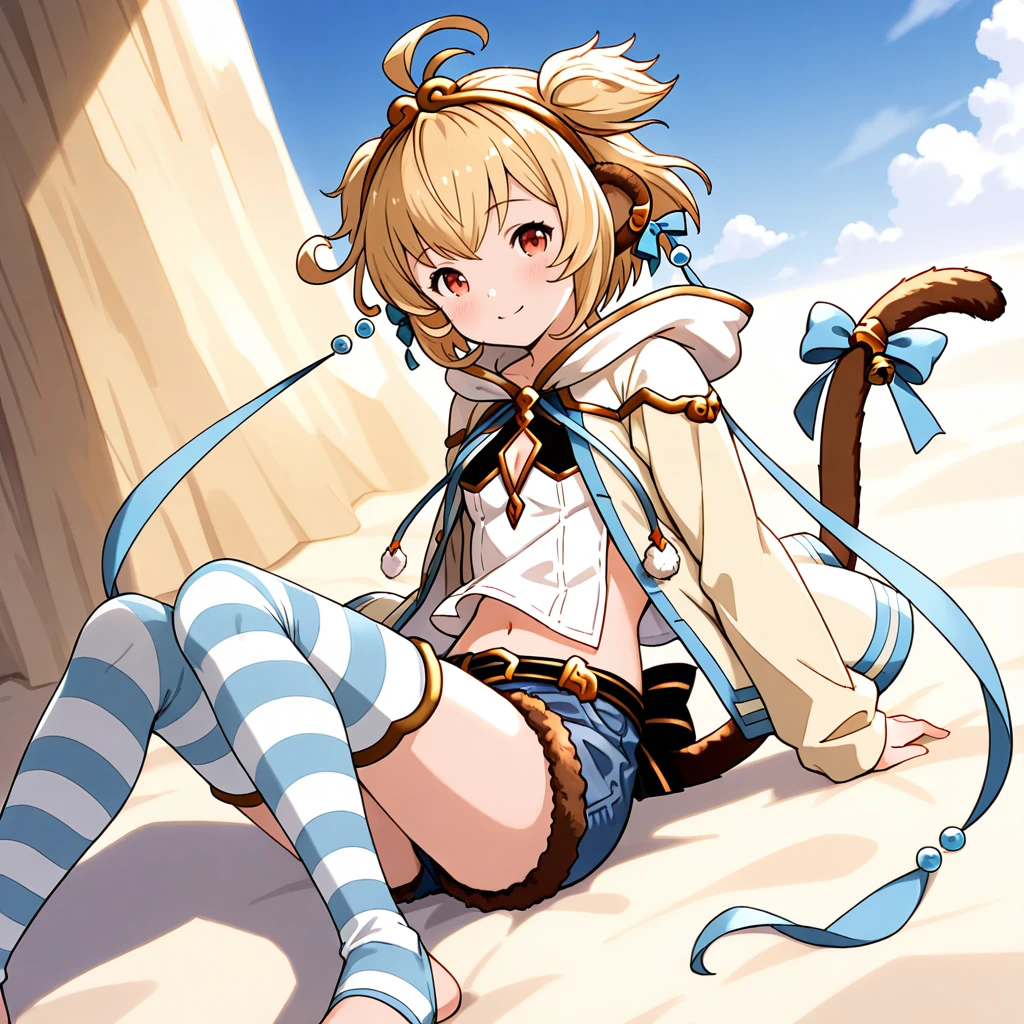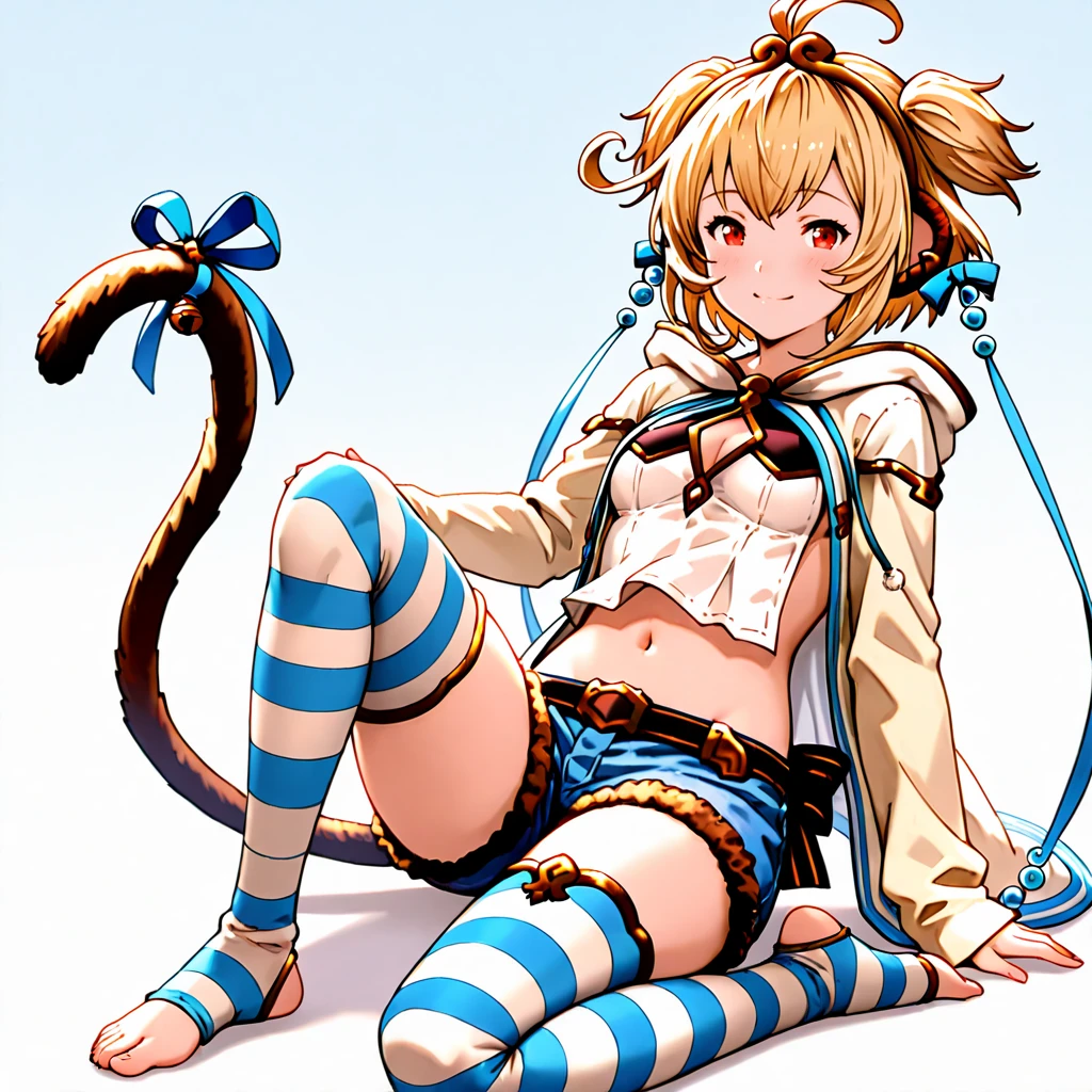 Trigger : AndiraFlowerFrolic, 1girl, tail ornament, andira (granblue fantasy), blonde hair, blue shorts, striped thighhighs, animal ears, navel, toeless legwear, tail ribbon, erune, red eyes, monkey tail, short hair, midriff, short shorts, blue ribbon, clothing cutout, tail bell, open jacket, hood down, denim shorts, cleavage cutout, tail bow, hairband, jewelry, small breasts, long sleeves, belt, open clothes