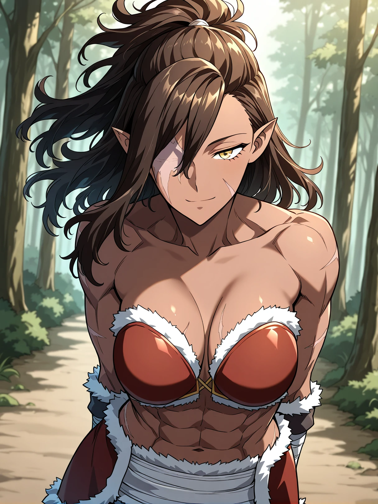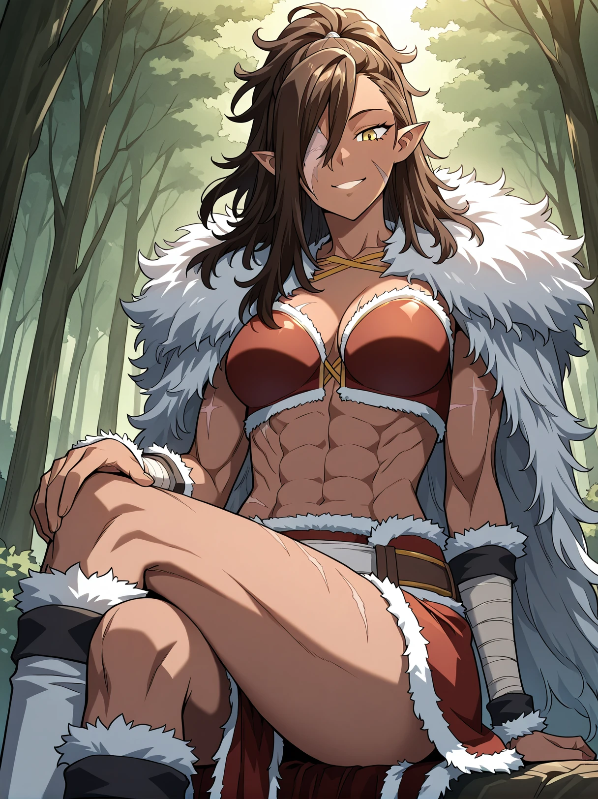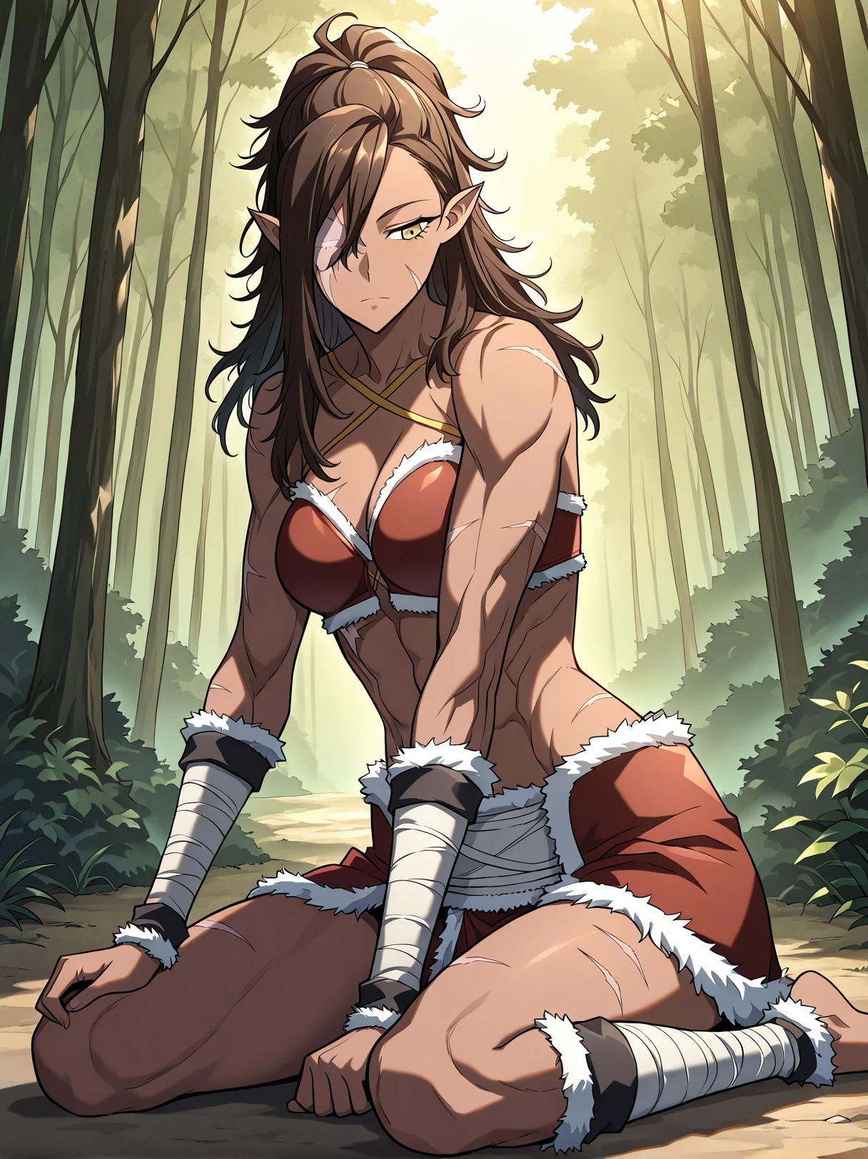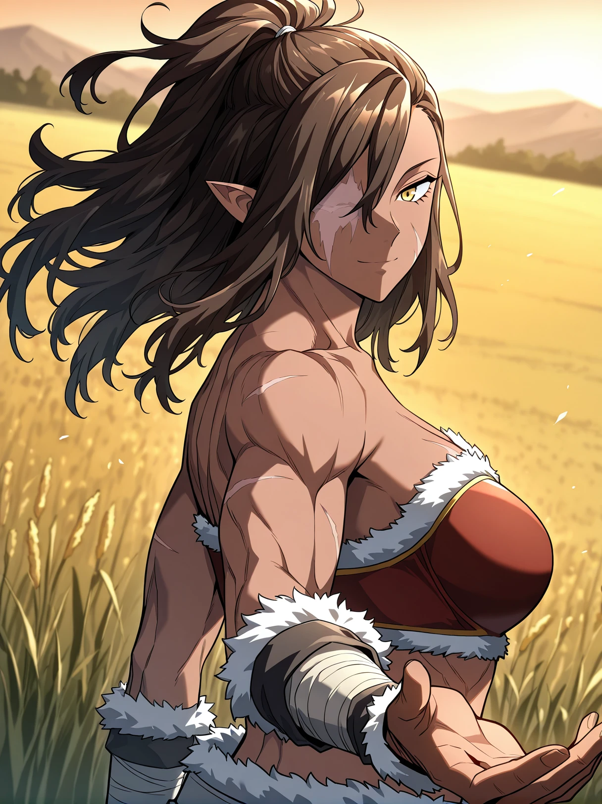 1 girl, solo, dark skin, athletic, muscular female, six pack, scar on face, golden eyes, long hair, ponytail, messy hair, brown hair, side-swept bangs, pointed ears, one-eyed female, scar over eye, missing eye, eyepatch, long hair covering one eye,