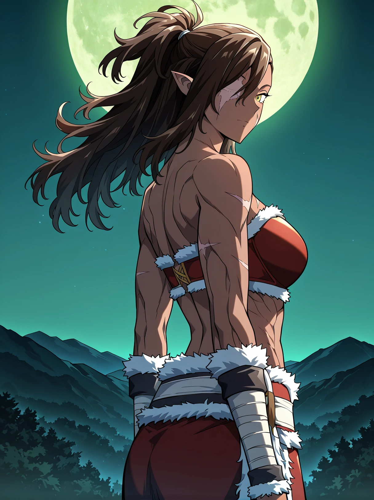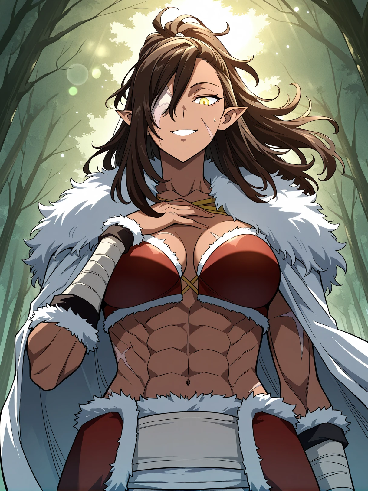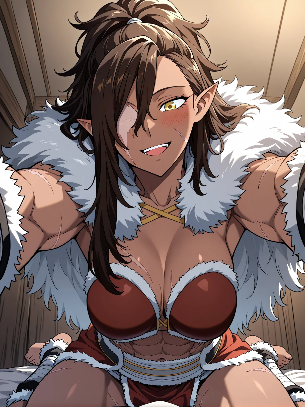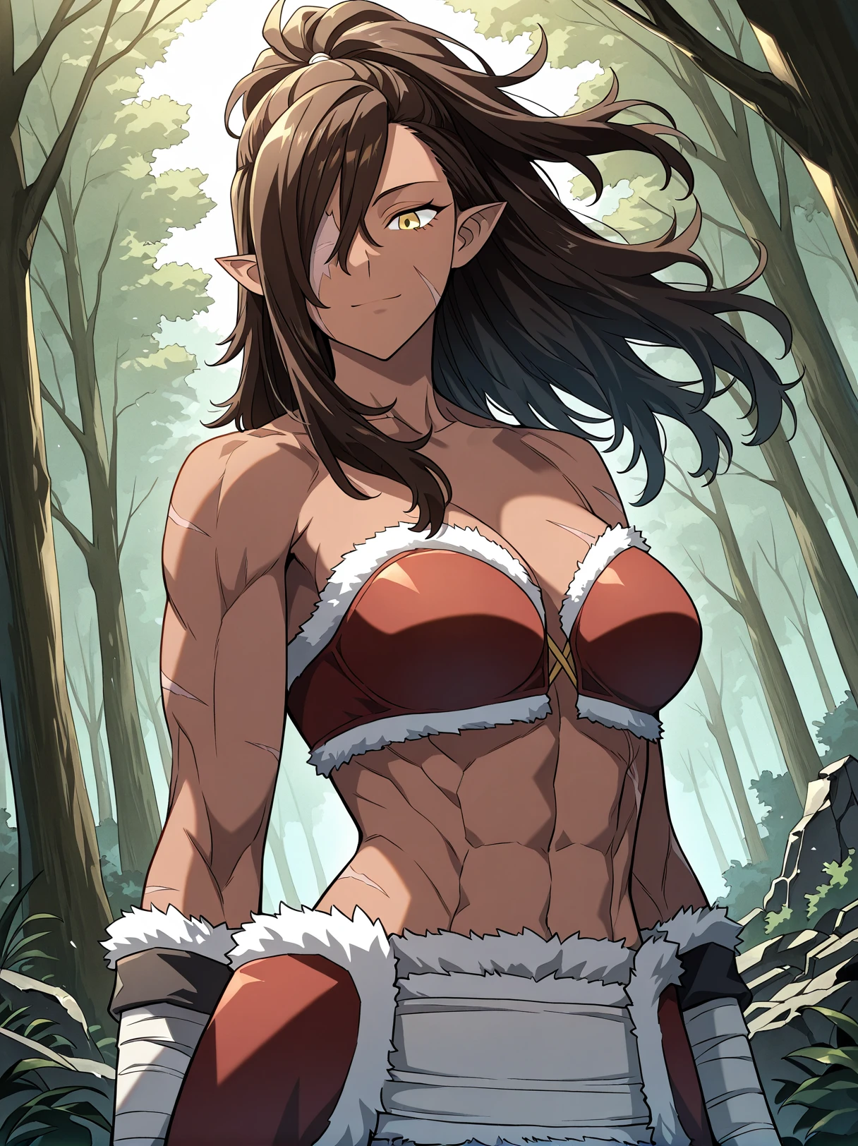 1 girl, solo, dark skin, athletic, muscular female, six pack, scar on face, golden eyes, long hair, ponytail, messy hair, brown hair, side-swept bangs, pointed ears, one-eyed female, scar over eye, missing eye, eyepatch, long hair covering one eye,