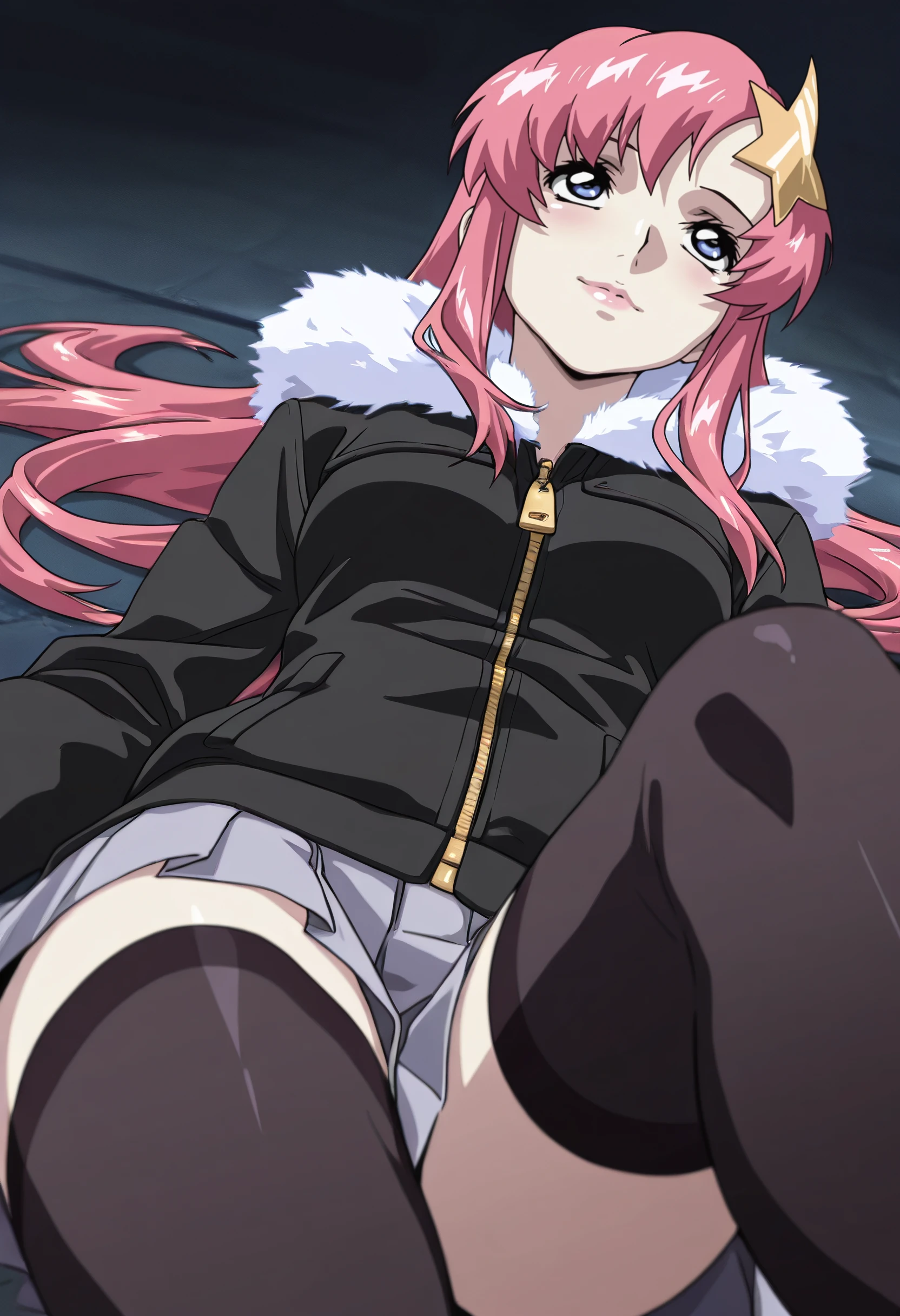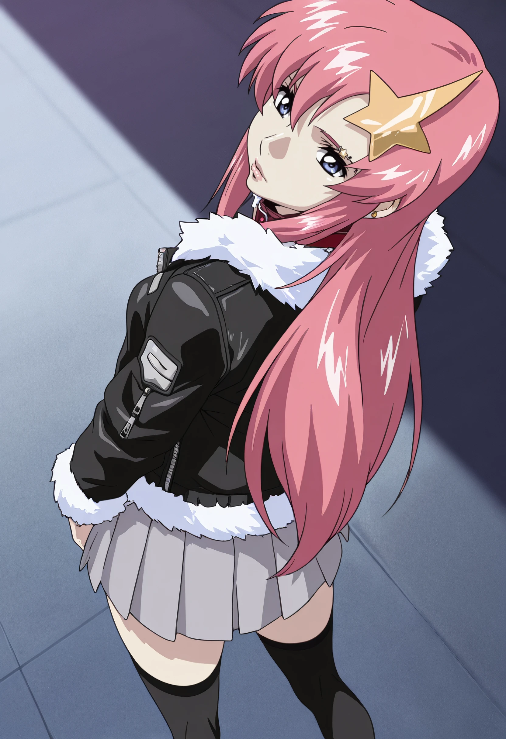 MeerJacket, fur trim, coat, jacket, fur collar, long sleeves, black jacket, winter clothes, zipper, fur-trimmed coat, fur-trimmed jacket, skirt, pleated skirt, thighhighs, black thighhighs, grey skirt,