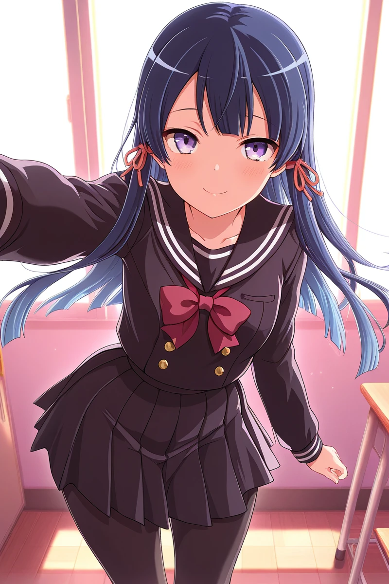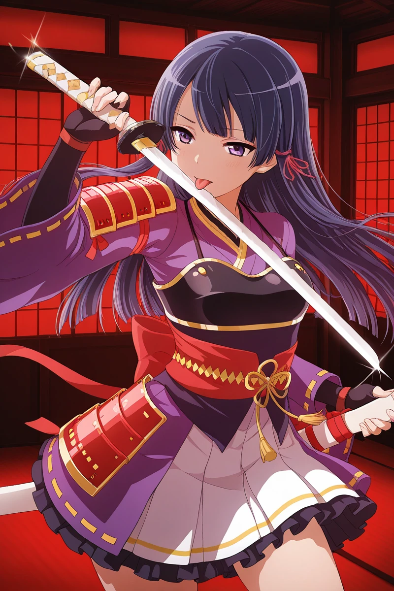 tamao, 1girl, solo, long hair, gloves, fingerless gloves, armor, shoulder armor, hair ribbon, japanese clothes, skirt, ribbon, smile, black gloves, looking at viewer, blue hair, japanese armor, purple eyes, blush, sash, pleated skirt, bangs, pauldrons, red ribbon, stage outfitDescription