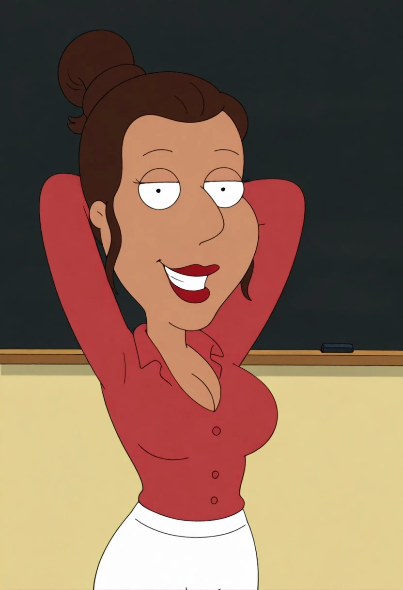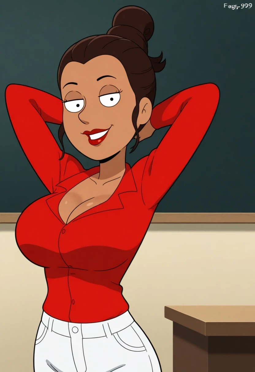 FamilyGuyStyle, family guy, FG_Italian_teacher, dot pupils, single hair bun, dark brown hair, tan skin, red lips, large breasts, mature,