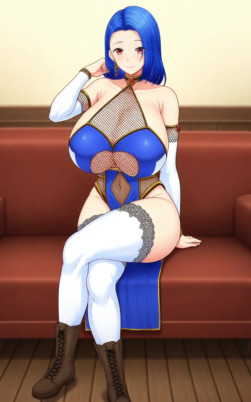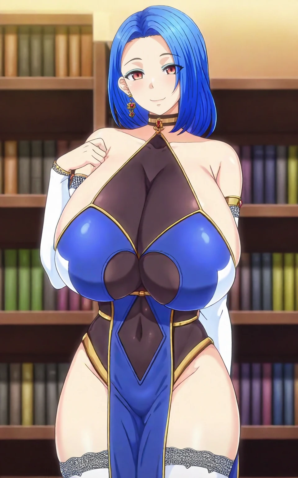 elysiamajo, toromm body, blue hair, long hair, red eyes