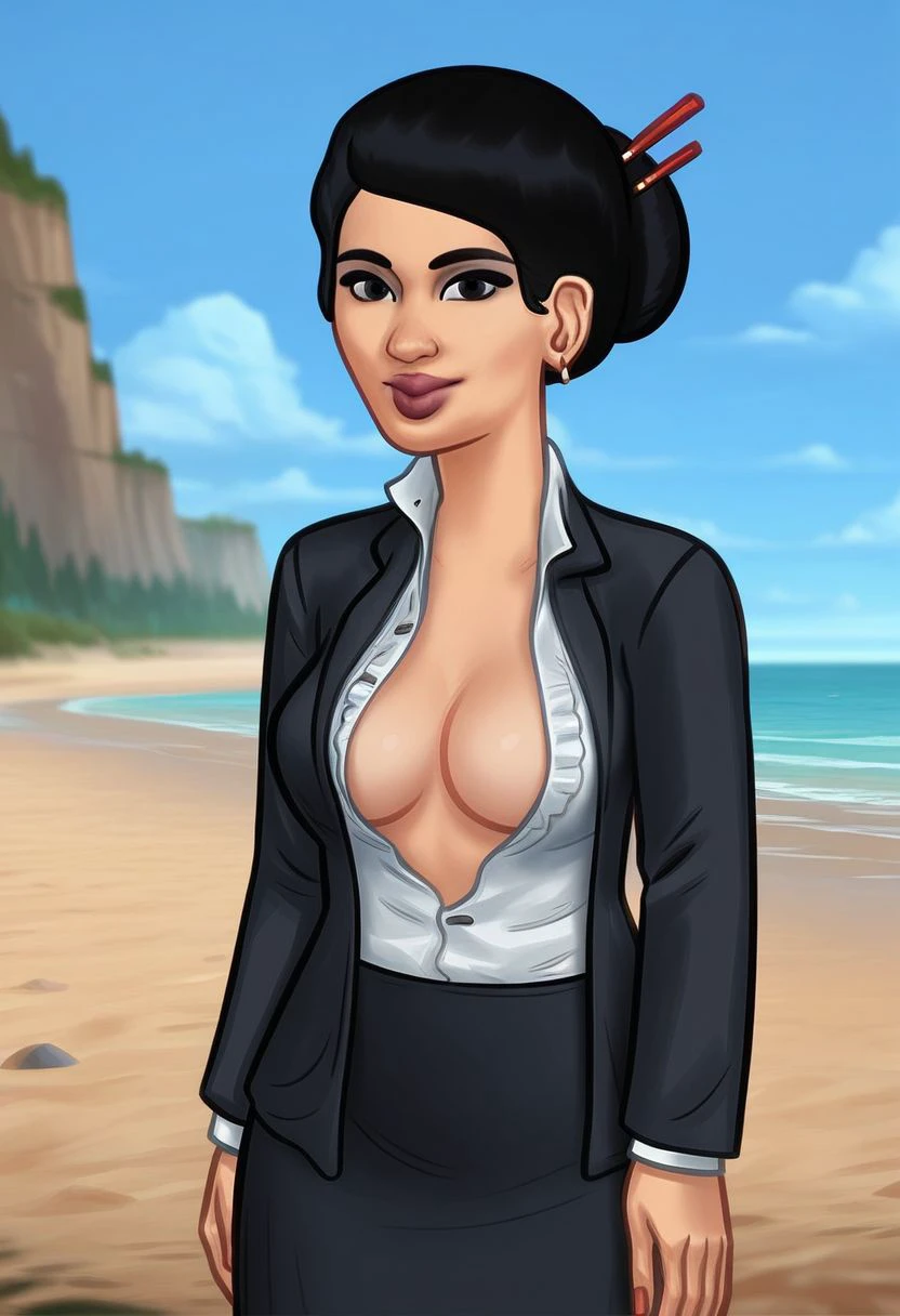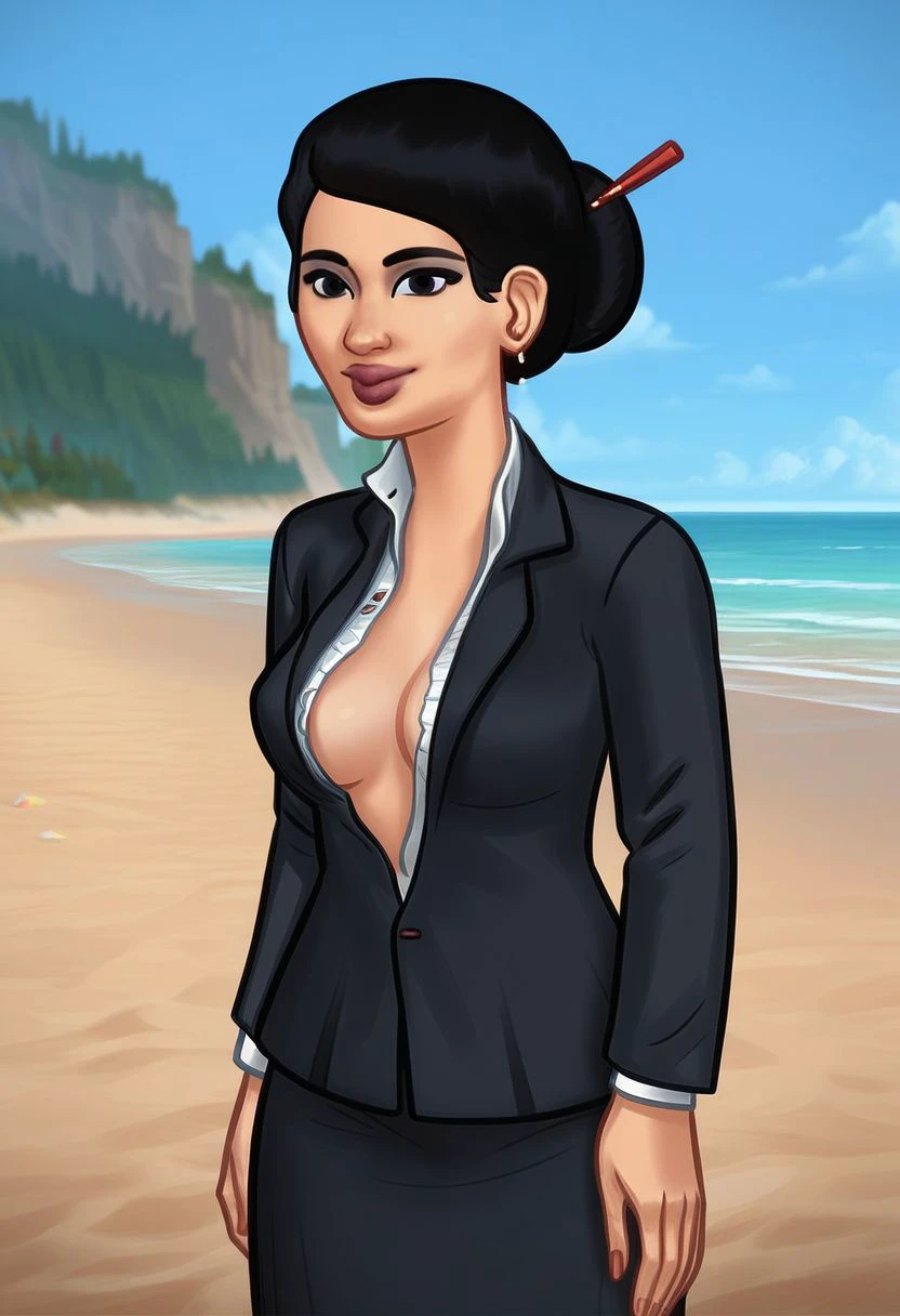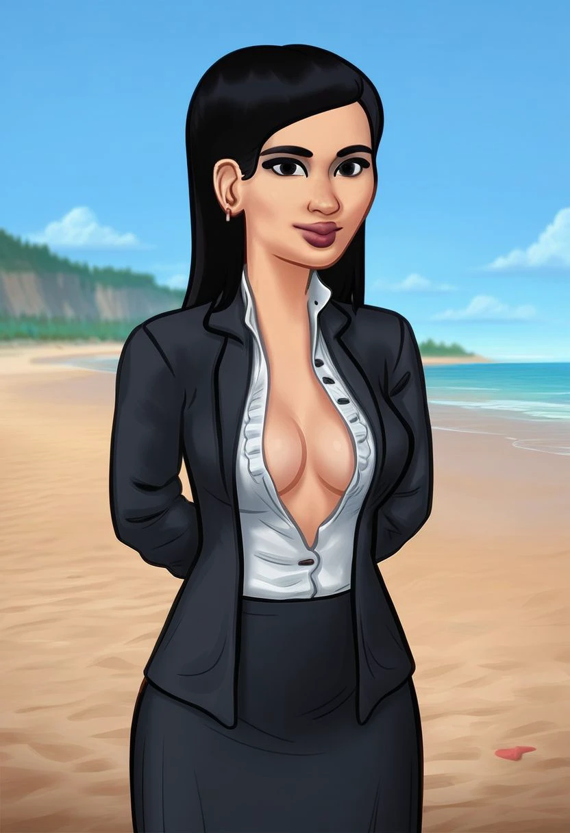 black jacket, long sleeves, no bra, cleavage, white shirt