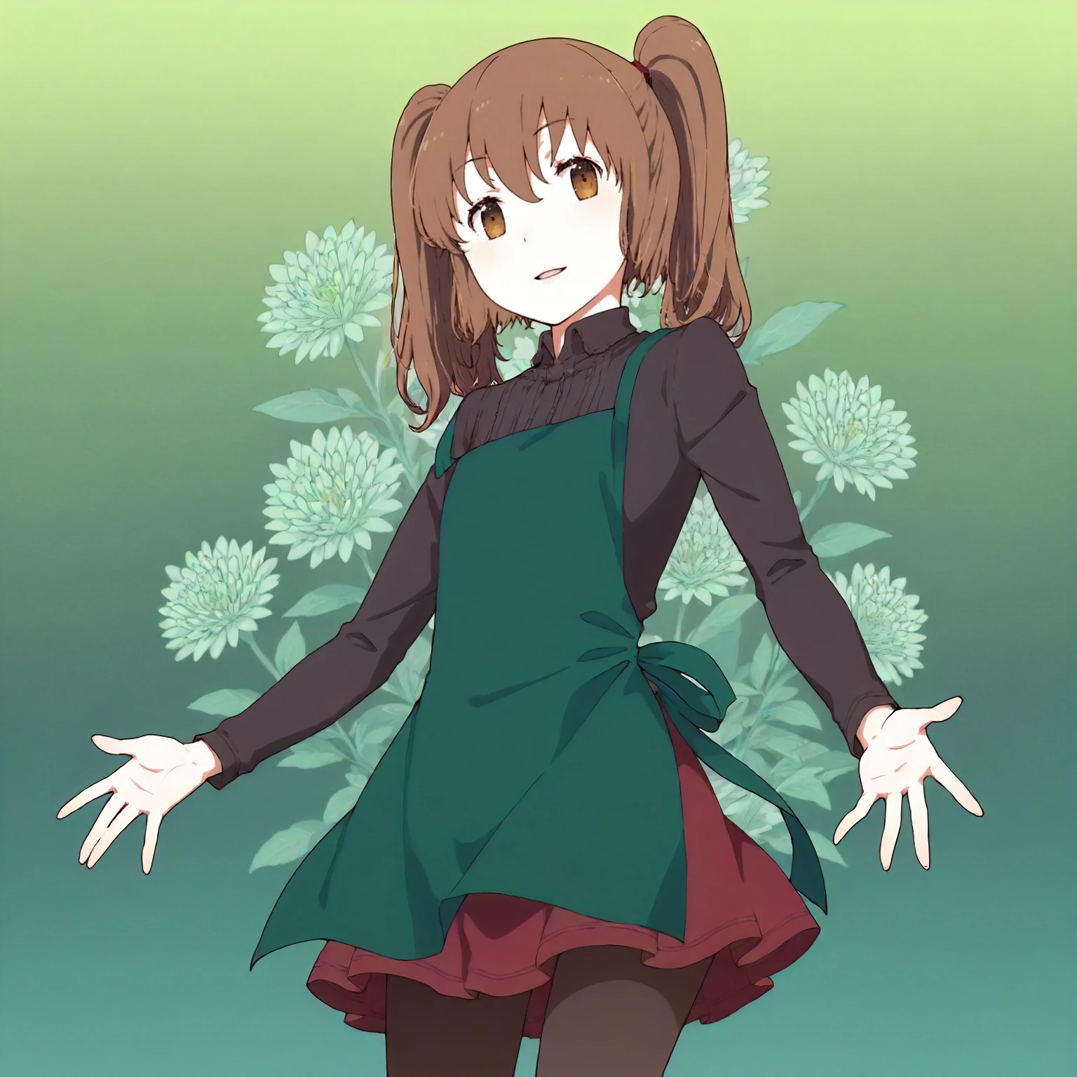 black shirt,turtleneck,long_sleeves, green apron, red skirt,miniskirt, black pantyhose,narrow_legs,