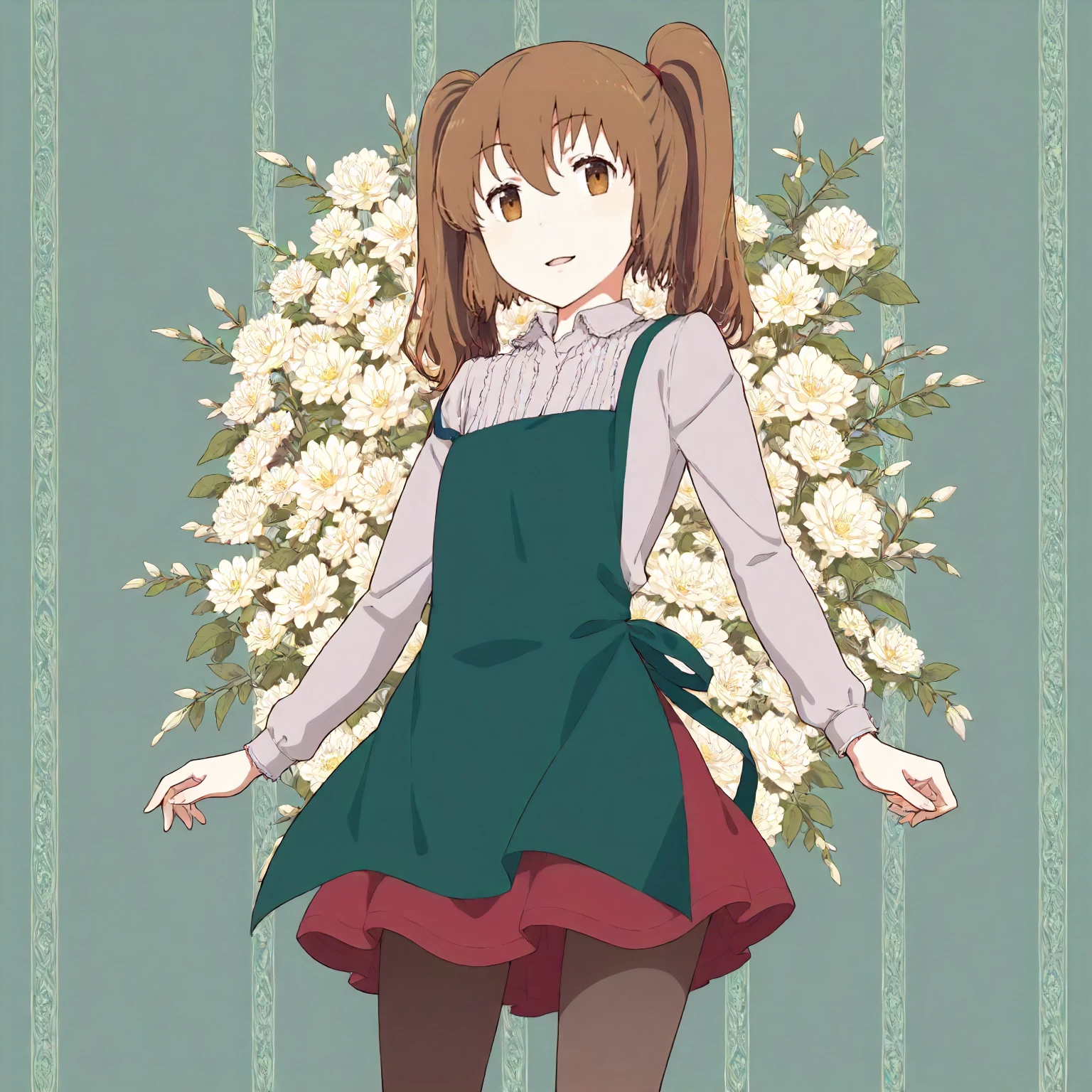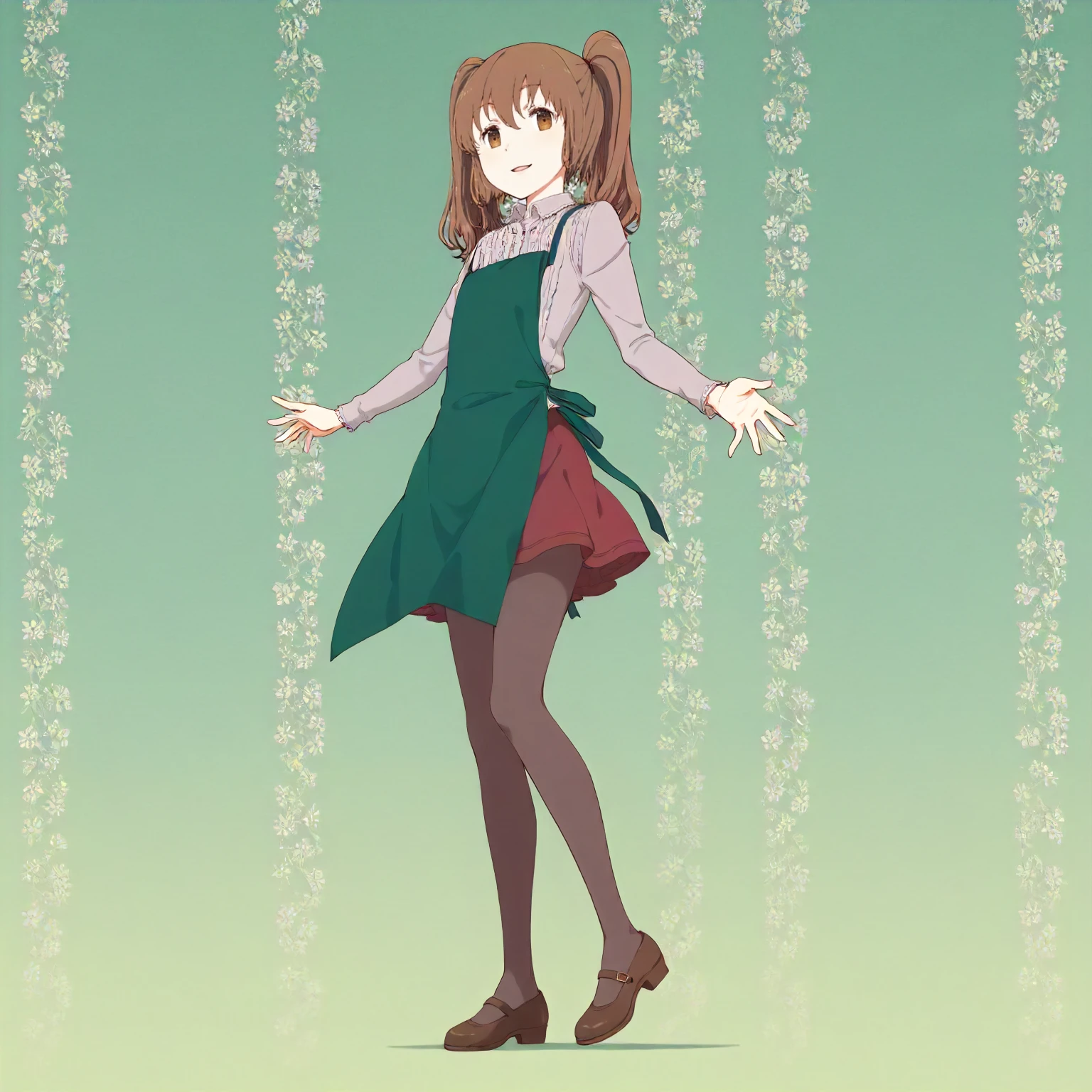 grey shirt,frilled_shirt,long_sleeves, green apron, red skirt,miniskirt, pantyhose,narrow_legs,