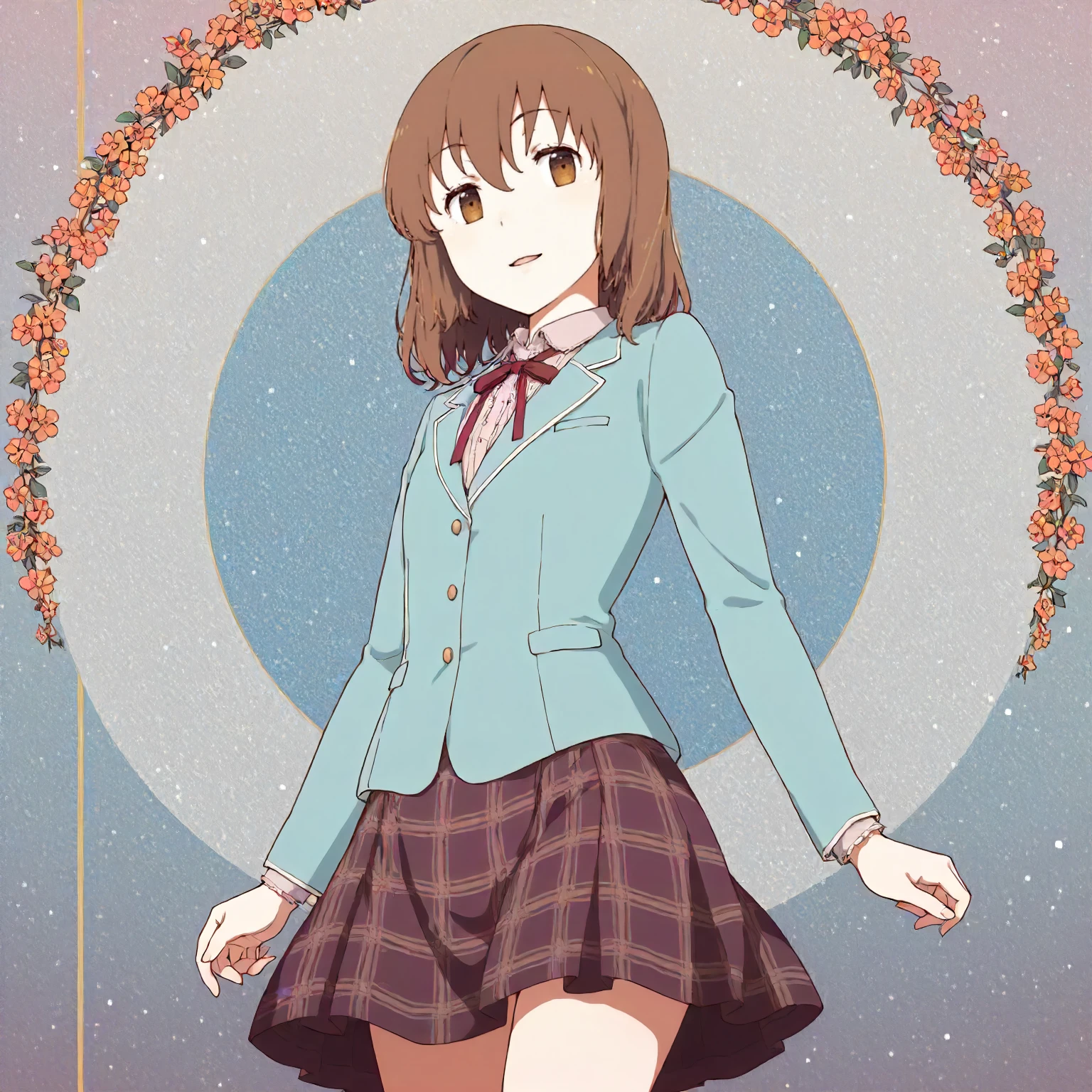 blue jacket,neck ribbon,long_sleeves, plaid_skirt, narrow_legs,